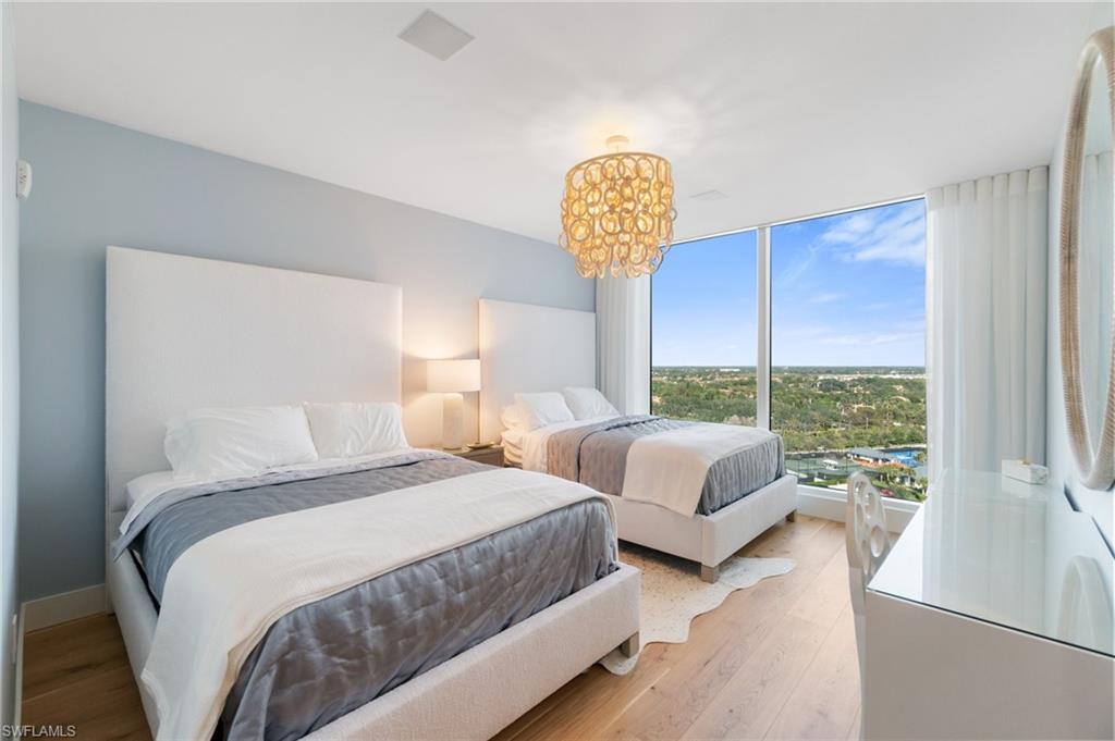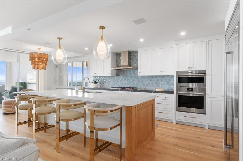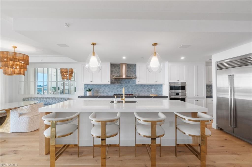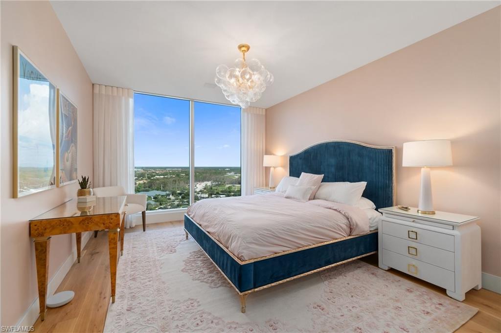 Indulge in a wealth of lavish upgrades and enhancements that define this rare Tower 400 sanctuary—a must-see masterpiece for the most discerning buyers. Welcome to the epitome of luxury living in the newest Tower 400, '02 unit on the 15th floor. This elegantly designed 4-bedroom, 3.5-bathroom residence spans an impressive 3,290 square feet, offering unparalleled sunset vistas of the Gulf and Wiggins Pass, along with breathtaking sunrise views over the clubhouse and the prestigious Kinsale Golf Course. Expertly curated by the nationally acclaimed interior designer Renee Gaddis, this residence is a testament to craftsmanship and style. Immerse yourself in the opulence of Legno Bastone European white oak wood floors, complemented by exquisite custom chandeliers, wall sconces, drapery and wallpapers from renowned designers Schumacher, Phillip Jefferies, and Thibaut. The sophisticated living space boasts a custom built-in Dimplex Ignite fireplace and meticulously upgraded cabinetry. The gourmet kitchen is a culinary haven, with upgraded quartz countertops, premium Wolf and Sub-Zero appliances, a natural gas cooktop, dual Bosch dishwashers, a built-in Miele coffee/espresso machine, and a Kinetico reverse osmosis system. Maximize storage space with upgraded custom built-in cabinetry in the laundry room, the master bedroom walk-in closet, and refined cabinetry in bedrooms 2 and 3. Effortless living is ensured with automated shutters, lighting, and music, all managed by an advanced premium Smart Home system. The expansive patio lanai, equipped with an outdoor TV and speaker system, is safeguarded by hurricane shutters, providing peace of mind while you're away. Ascend a few floors to the rooftop terrace pool to savor a sunset, or stroll across the street to the five-star luxurious clubhouse, boasting three pools, two gourmet restaurants, a wellness center, pickleball, tennis, and more. Welcome to an uncomplicated, coastal luxurious lifestyle at Kalea Bay, where elegance meets ease and every detail is designed for your utmost pleasure.