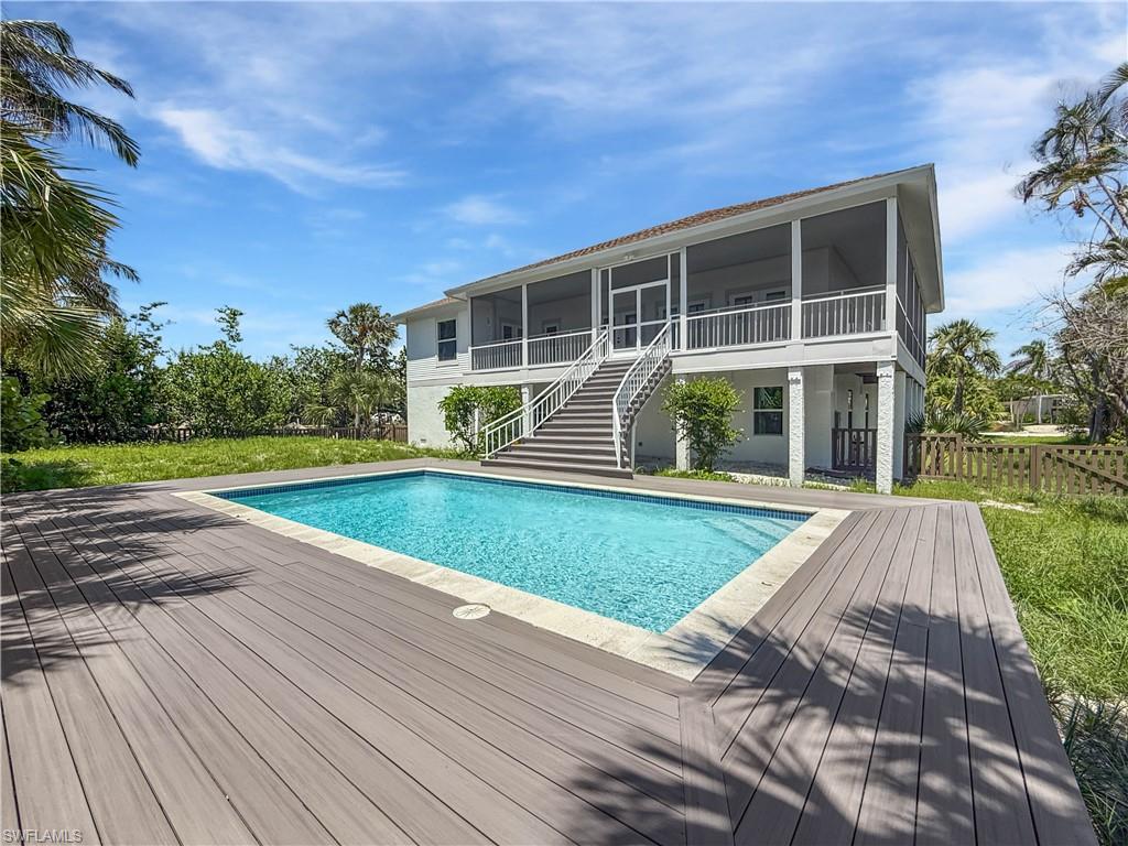 Discover the perfect blend of Island Charm and a Beach Retreat in this COMPLETELY RENOVATED 4-bedroom, 2.5-bath Pool Home, located on the coveted East End of Sanibel Island. Step inside to discover an expansive great room with vaulted ceilings, featuring an open floor plan to the kitchen and dry bar, creating the perfect backdrop for entertaining. Relax on the screened-in balcony porch and take in breathtaking sunsets while overlooking the sparkling pool and fenced backyard. Designed for the Florida lifestyle, this home offers seamless indoor-outdoor living! The Beach is about 650-feet away and a Beach Access Boardwalk will lead you to the pristine shores of Sanibel! After a day of sun and sand, take a short stroll to Wickies Lighthouse Restaurant for dinner and drinks and leave the cooking for later! The property has been completely updated, including energy-efficient hurricane-impact windows and doors, new HVAC system and ductwork, new water heater, updated electrical and plumbing, as well as a 2023 roof replacement. Elevated and renovated to current building code standards with 10x10 precast concrete pilings, this home offers peace of mind during storm season. Practicality meets luxury with a spacious 5-car garage, providing ample space for vehicles, toys and storage. Additionally, the home's prime location is just minutes from the Sanibel Marina, making it an ideal choice for boat enthusiasts. Whether you're looking for a personal paradise or a savvy investment, this home presents a fantastic opportunity as a high-demand, income-producing vacation rental!