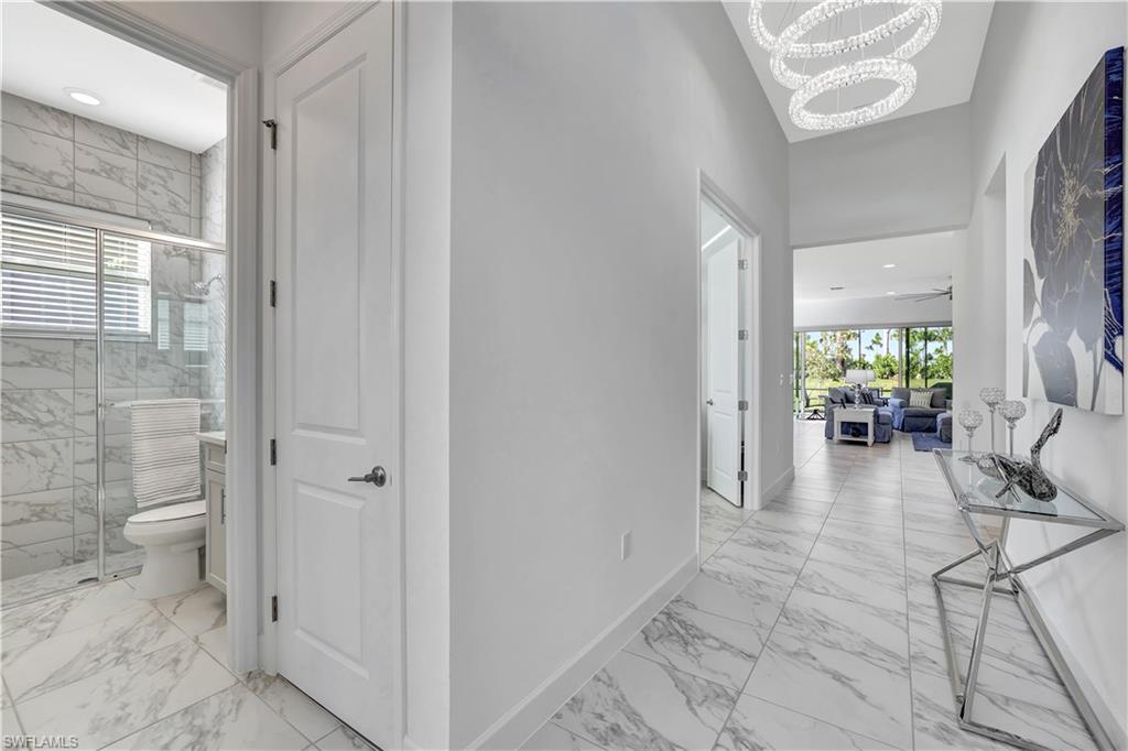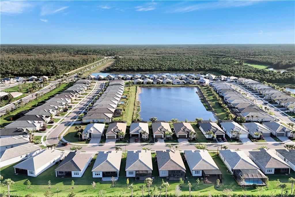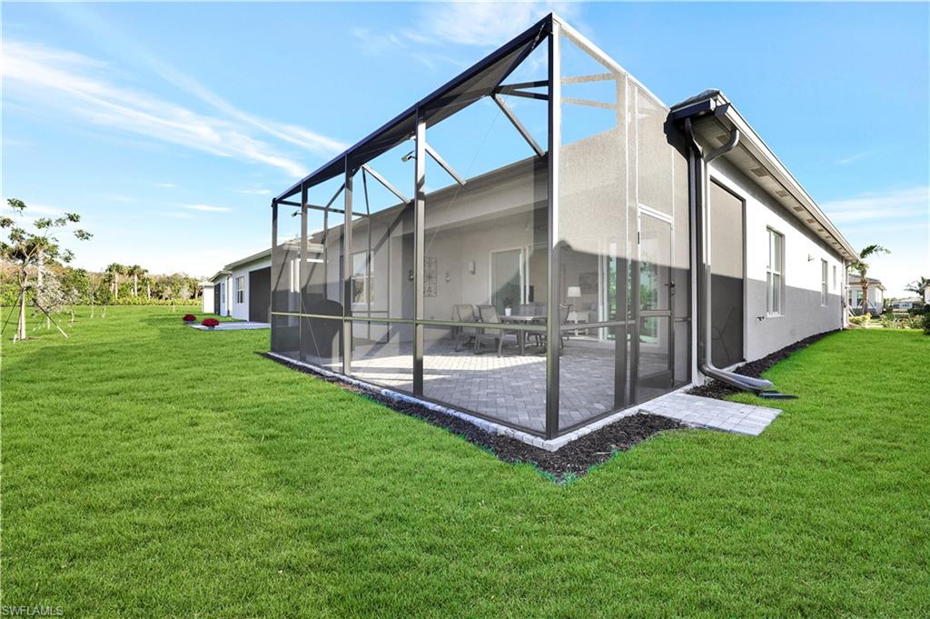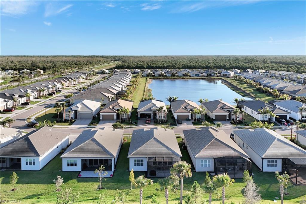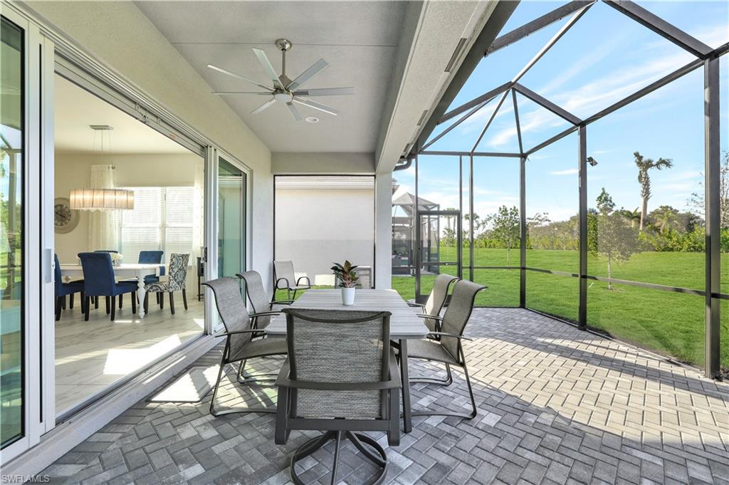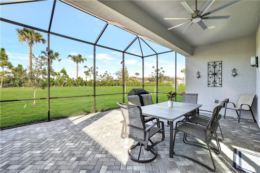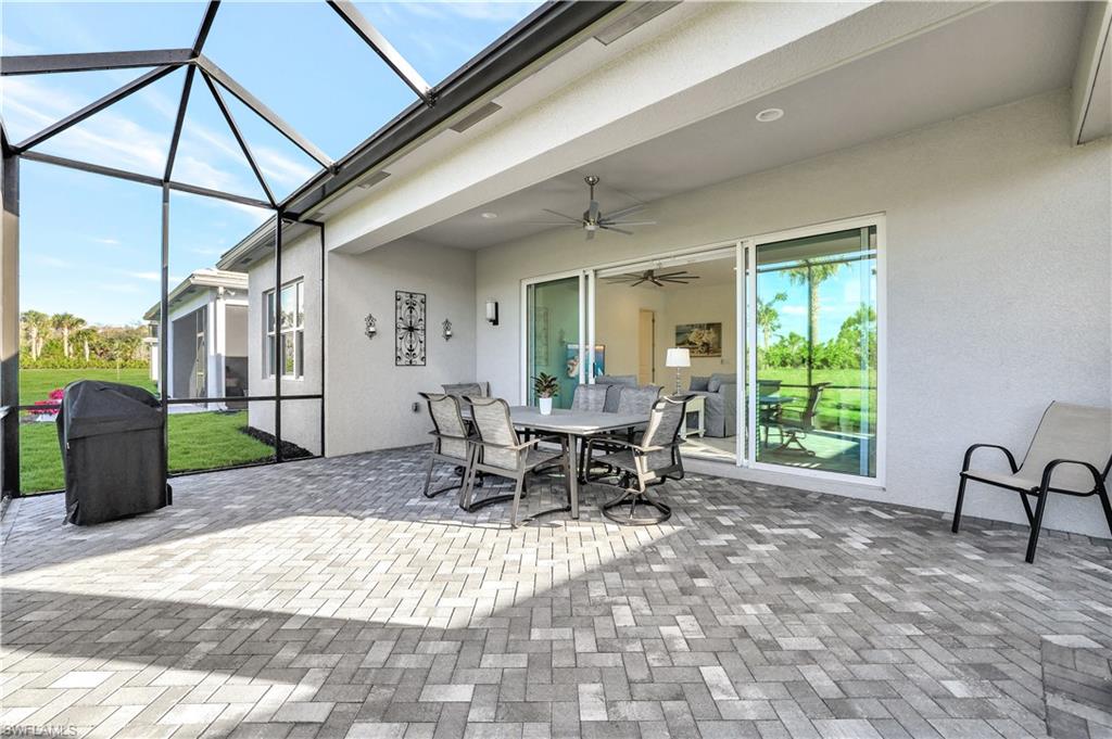 This POPULAR PELICAN FLOOR PLAN at Valencia Trails in Naples, Florida offers a 3 Bedroom + Den, 3 full baths, a 2 car garage and is located on a homesite providing a private landscaped view. This home was completed January 2024. So many great upgrades including an extended paver patio with screen enclosure (allowing for extra outdoor space to entertain), brand new primary closet custom built-ins with shelves and drawers, white maple wood soft close cabinets in the kitchen with above and below lighting, GE stainless steel appliances including a stainless steel vented hood and upgraded backsplash, 21 x 21 floor tile throughout the whole home, impact glass windows, built-in desk and shelves in the den, epoxy finish on the garage floor, FPL surge protector on the main electrical panel and much more! Valencia Trails is a wonderful Active Adult 55+ community in North Naples and has a 42,000 sq. ft. clubhouse with amenities second to none! There is a resort-style pool with beach entry, lap pool, resistance walking pool, in-ground spa, fire pit, tennis courts, pickleball courts, clay bocce ball courts, dog park, poolside shaded cabanas, chaise lounges, fitness room, card rooms, restaurant with indoor and outdoor bars, social hall, nail salon and more. There are over three miles of private walking trails, featuring preserve and lake views.