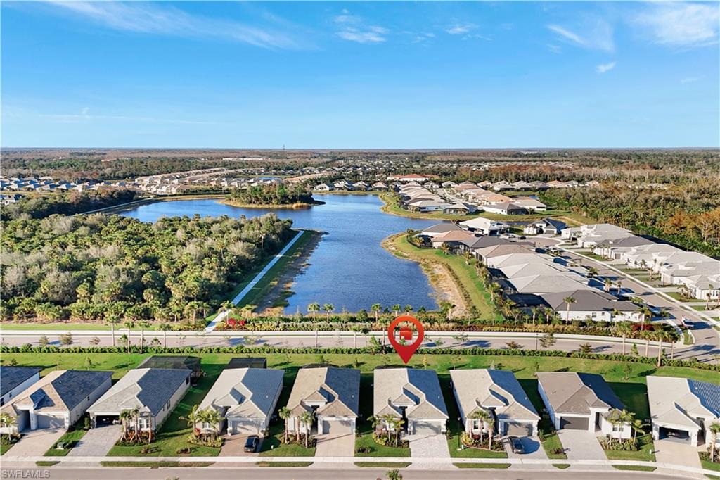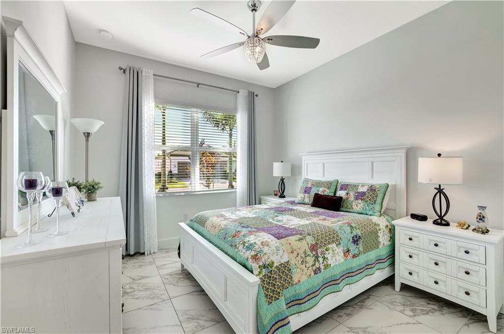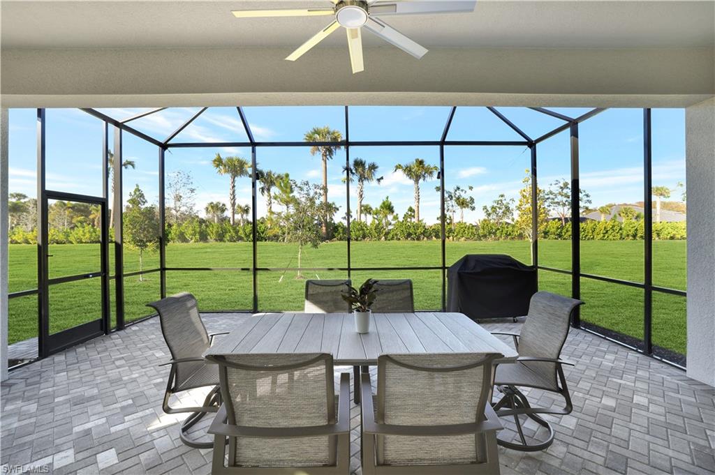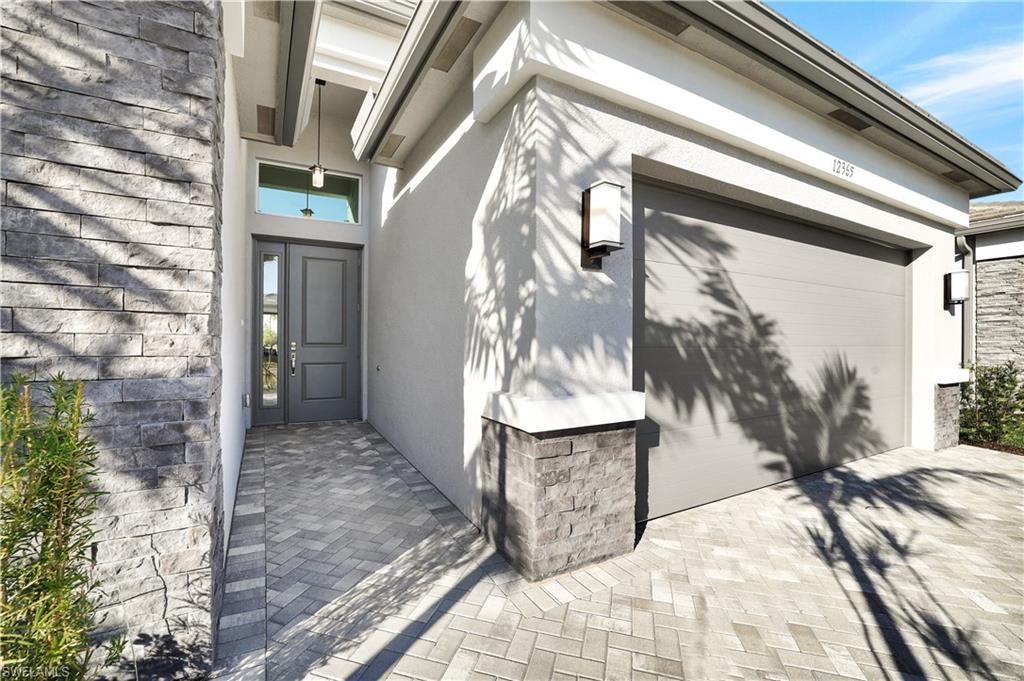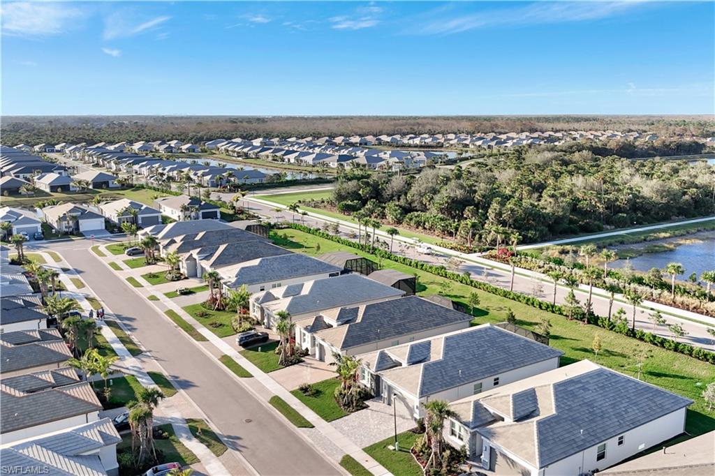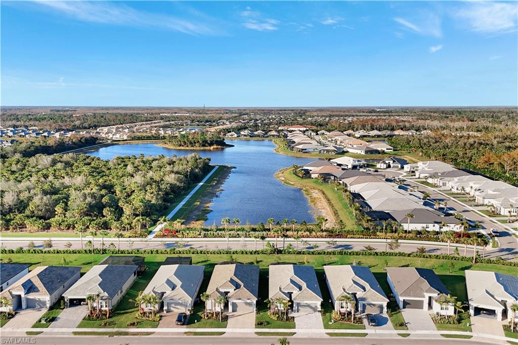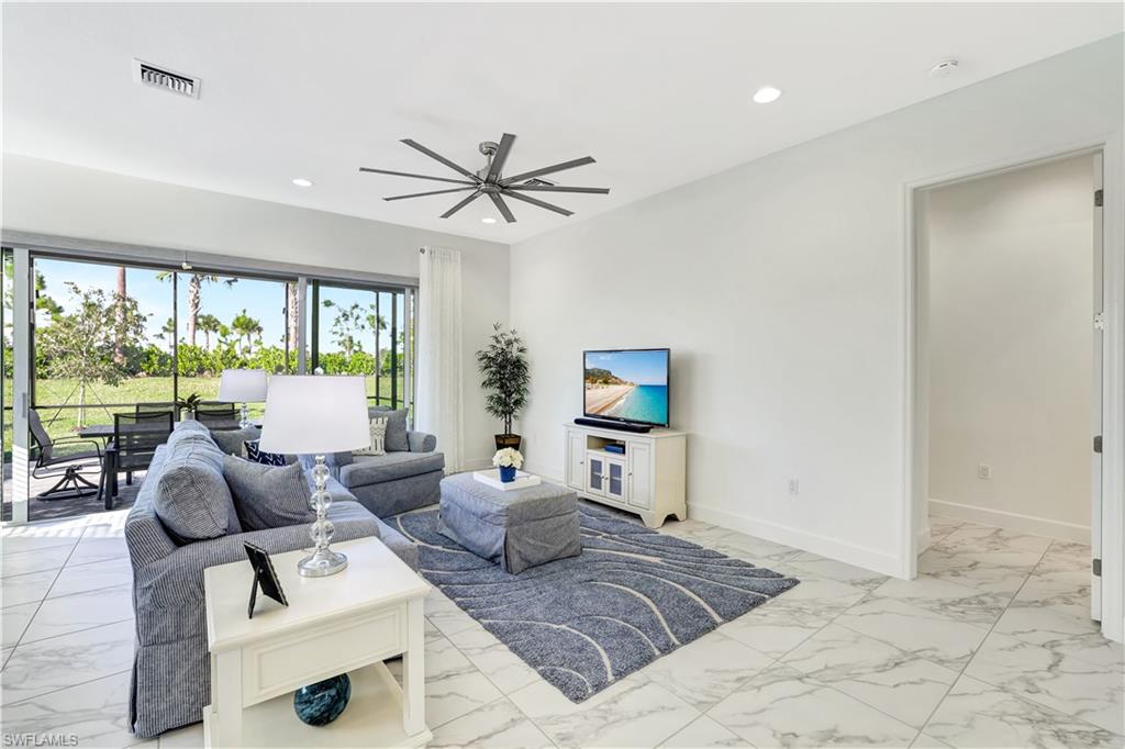 This POPULAR PELICAN FLOOR PLAN at Valencia Trails in Naples, Florida offers a 3 Bedroom + Den, 3 full baths, a 2 car garage and is located on a homesite providing a private landscaped view. This home was completed January 2024. So many great upgrades including an extended paver patio with screen enclosure (allowing for extra outdoor space to entertain), brand new primary closet custom built-ins with shelves and drawers, white maple wood soft close cabinets in the kitchen with above and below lighting, GE stainless steel appliances including a stainless steel vented hood and upgraded backsplash, 21 x 21 floor tile throughout the whole home, impact glass windows, built-in desk and shelves in the den, epoxy finish on the garage floor, FPL surge protector on the main electrical panel and much more! Valencia Trails is a wonderful Active Adult 55+ community in North Naples and has a 42,000 sq. ft. clubhouse with amenities second to none! There is a resort-style pool with beach entry, lap pool, resistance walking pool, in-ground spa, fire pit, tennis courts, pickleball courts, clay bocce ball courts, dog park, poolside shaded cabanas, chaise lounges, fitness room, card rooms, restaurant with indoor and outdoor bars, social hall, nail salon and more. There are over three miles of private walking trails, featuring preserve and lake views.