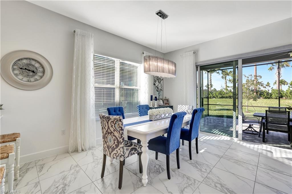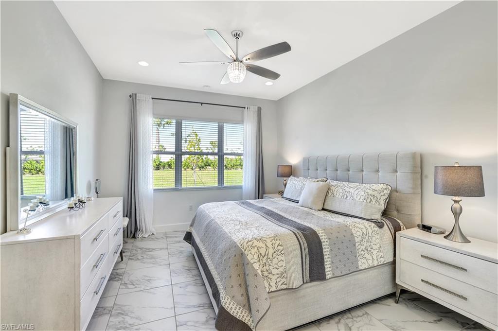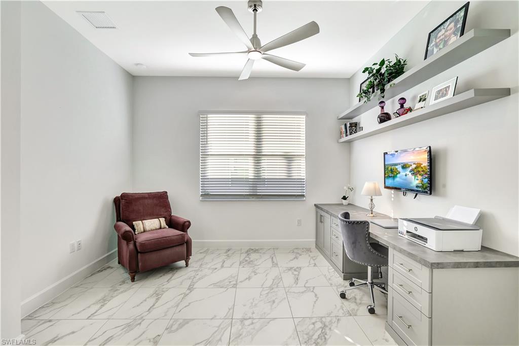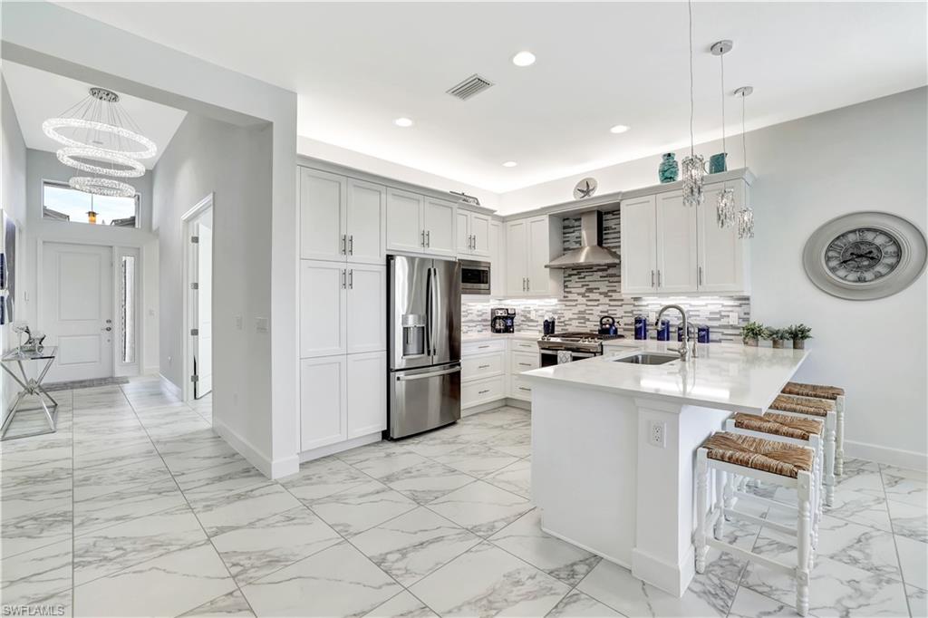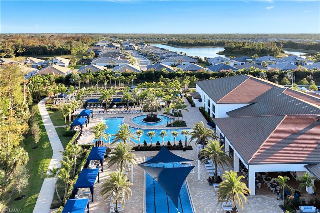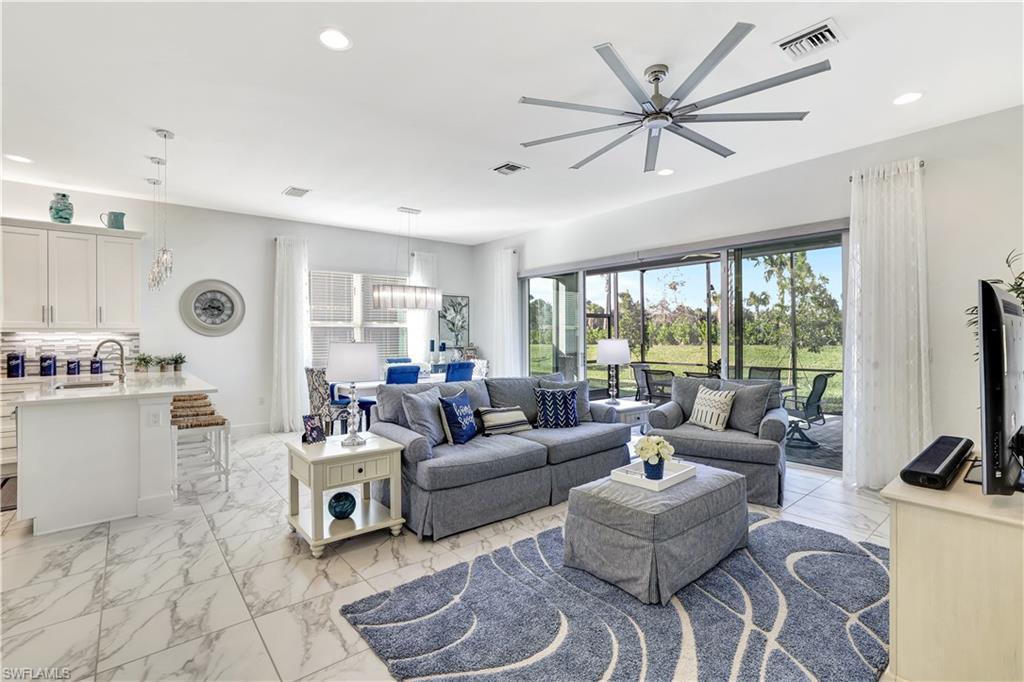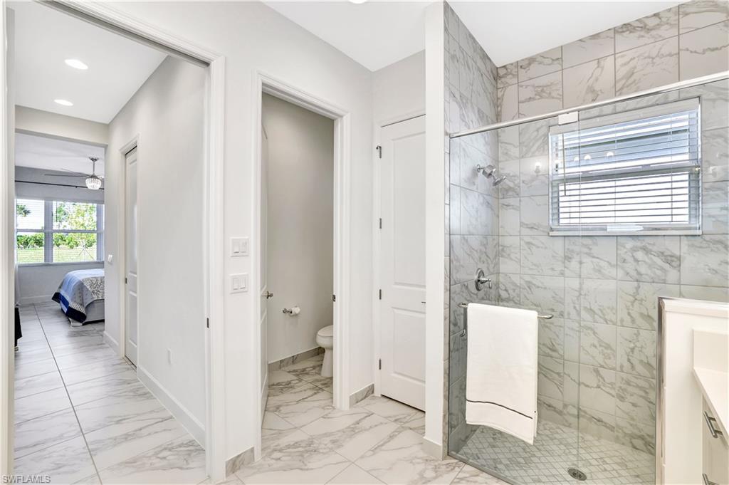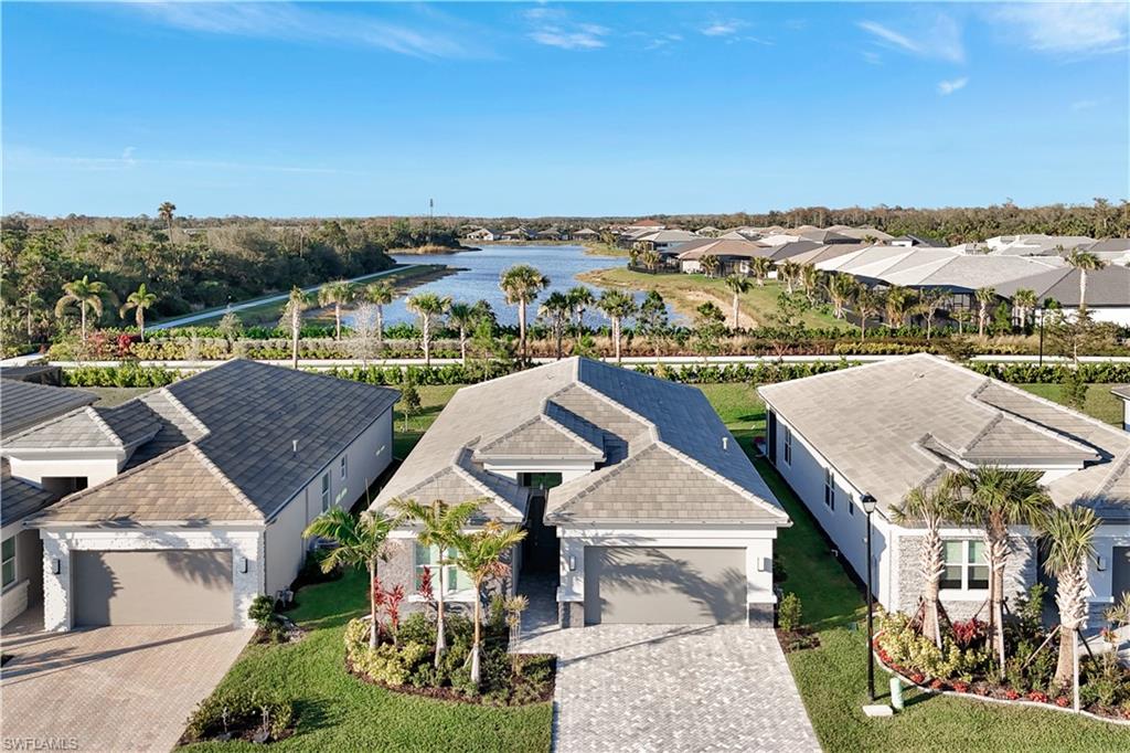 This POPULAR PELICAN FLOOR PLAN at Valencia Trails in Naples, Florida offers a 3 Bedroom + Den, 3 full baths, a 2 car garage and is located on a homesite providing a private landscaped view. This home was completed January 2024. So many great upgrades including an extended paver patio with screen enclosure (allowing for extra outdoor space to entertain), brand new primary closet custom built-ins with shelves and drawers, white maple wood soft close cabinets in the kitchen with above and below lighting, GE stainless steel appliances including a stainless steel vented hood and upgraded backsplash, 21 x 21 floor tile throughout the whole home, impact glass windows, built-in desk and shelves in the den, epoxy finish on the garage floor, FPL surge protector on the main electrical panel and much more! Valencia Trails is a wonderful Active Adult 55+ community in North Naples and has a 42,000 sq. ft. clubhouse with amenities second to none! There is a resort-style pool with beach entry, lap pool, resistance walking pool, in-ground spa, fire pit, tennis courts, pickleball courts, clay bocce ball courts, dog park, poolside shaded cabanas, chaise lounges, fitness room, card rooms, restaurant with indoor and outdoor bars, social hall, nail salon and more. There are over three miles of private walking trails, featuring preserve and lake views.