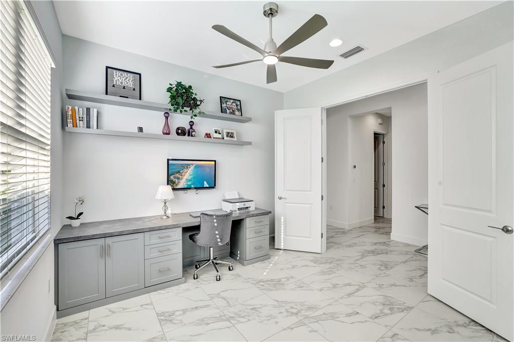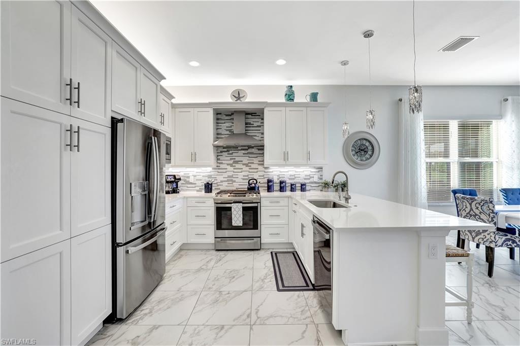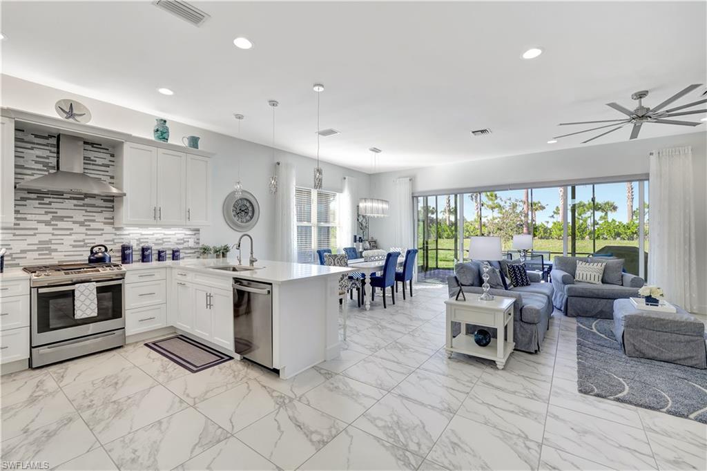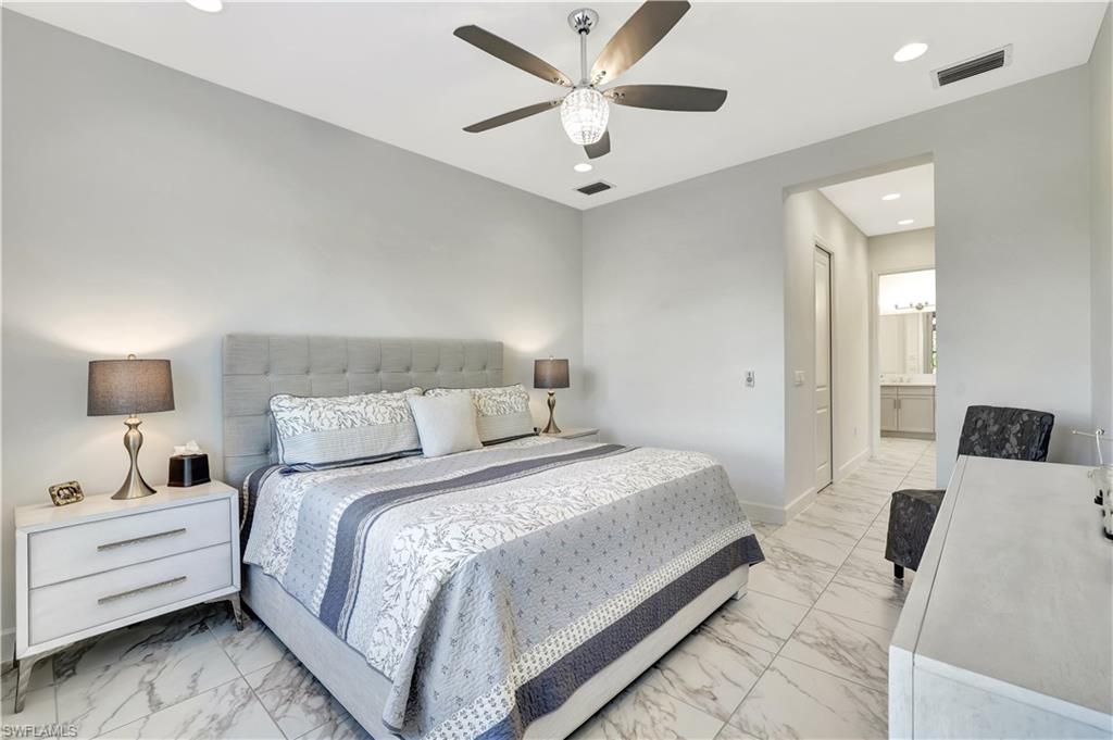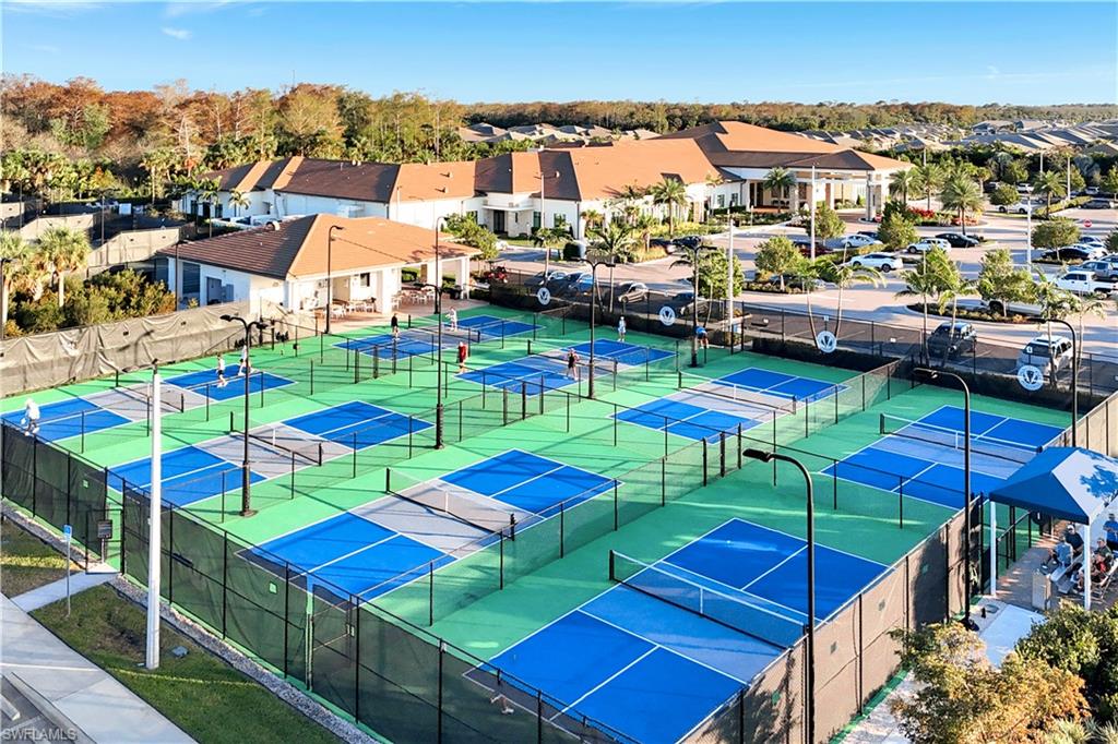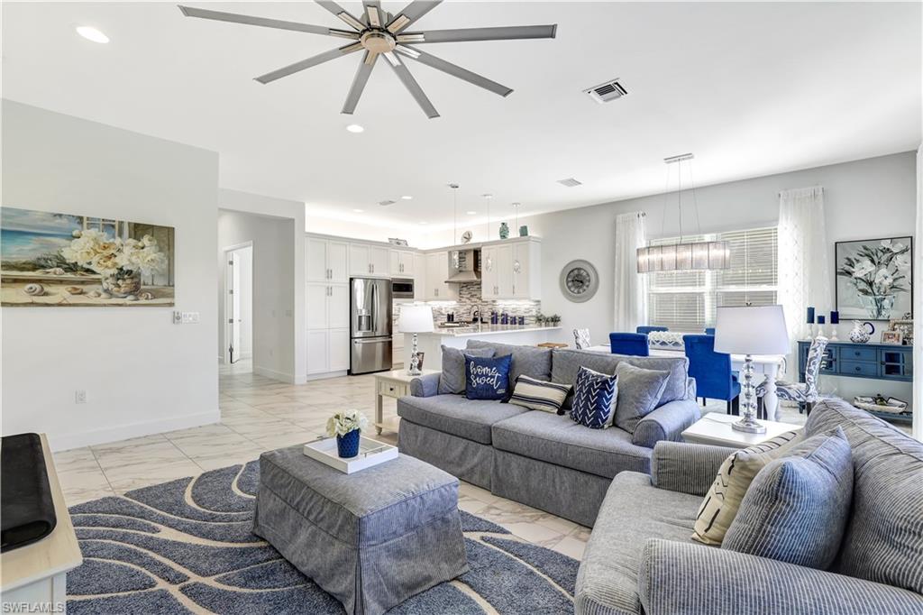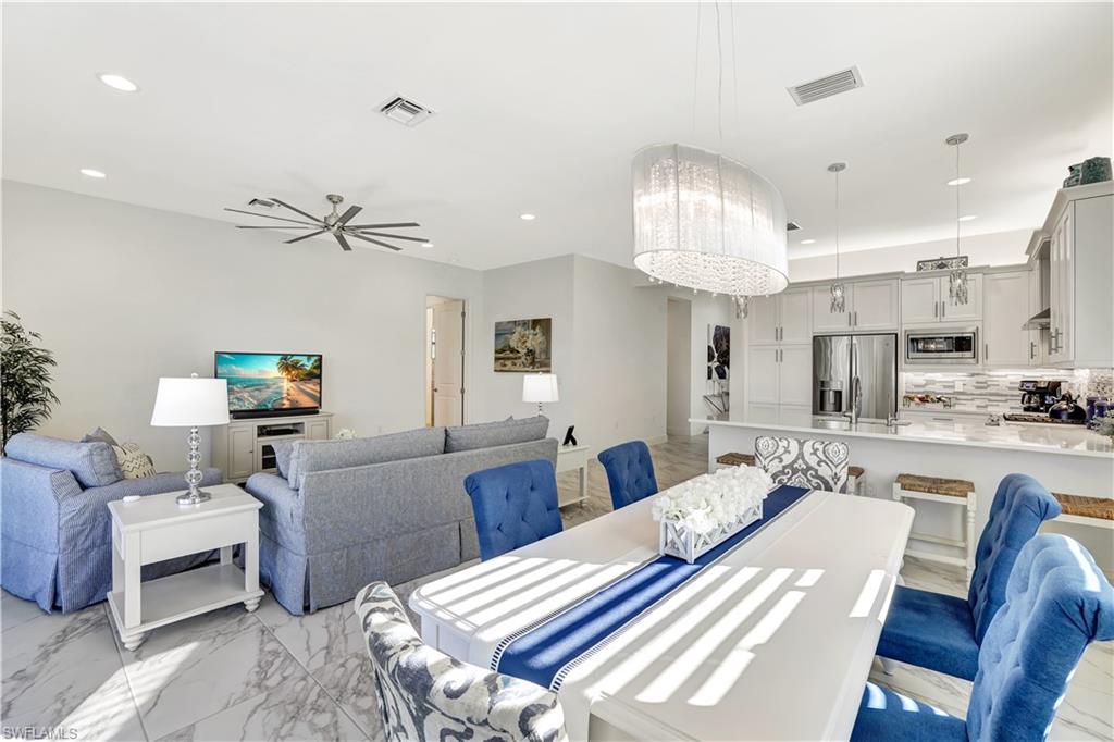 This POPULAR PELICAN FLOOR PLAN at Valencia Trails in Naples, Florida offers a 3 Bedroom + Den, 3 full baths, a 2 car garage and is located on a homesite providing a private landscaped view. This home was completed January 2024. So many great upgrades including an extended paver patio with screen enclosure (allowing for extra outdoor space to entertain), brand new primary closet custom built-ins with shelves and drawers, white maple wood soft close cabinets in the kitchen with above and below lighting, GE stainless steel appliances including a stainless steel vented hood and upgraded backsplash, 21 x 21 floor tile throughout the whole home, impact glass windows, built-in desk and shelves in the den, epoxy finish on the garage floor, FPL surge protector on the main electrical panel and much more! Valencia Trails is a wonderful Active Adult 55+ community in North Naples and has a 42,000 sq. ft. clubhouse with amenities second to none! There is a resort-style pool with beach entry, lap pool, resistance walking pool, in-ground spa, fire pit, tennis courts, pickleball courts, clay bocce ball courts, dog park, poolside shaded cabanas, chaise lounges, fitness room, card rooms, restaurant with indoor and outdoor bars, social hall, nail salon and more. There are over three miles of private walking trails, featuring preserve and lake views.