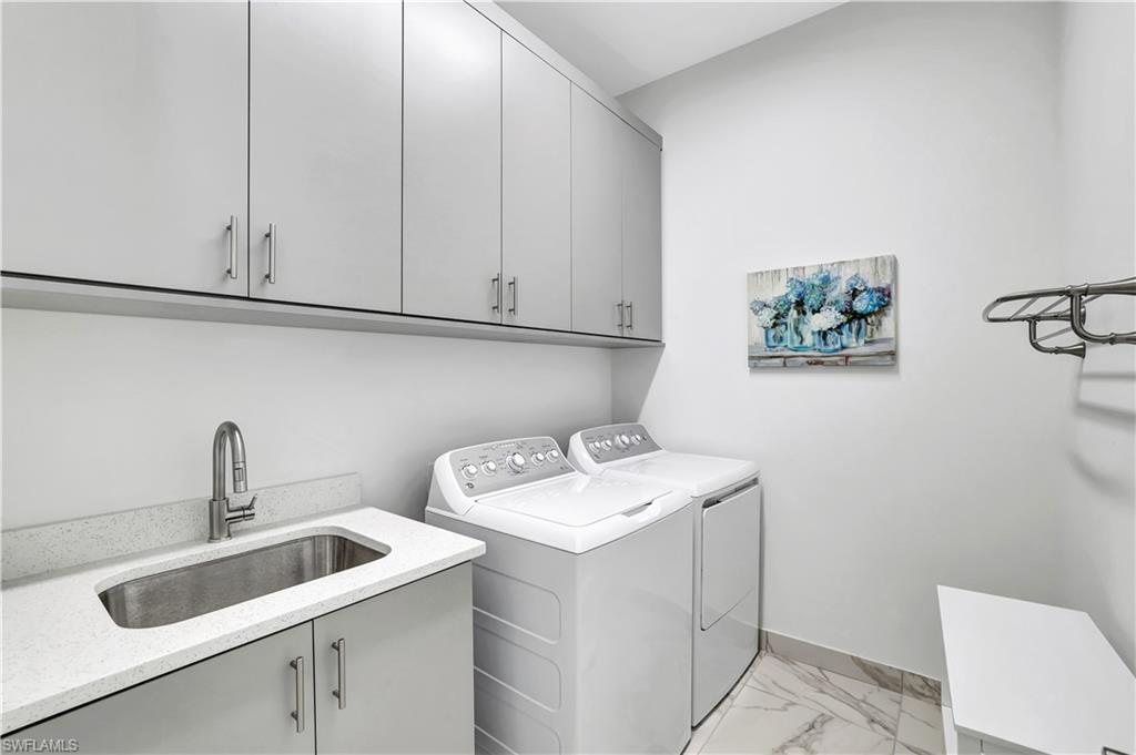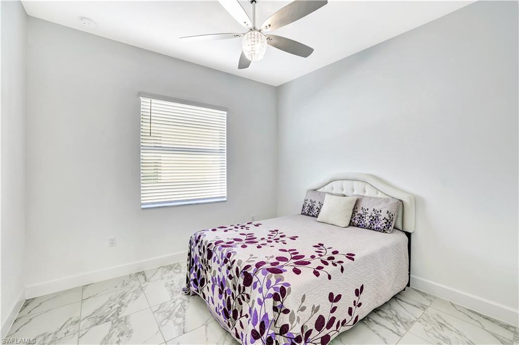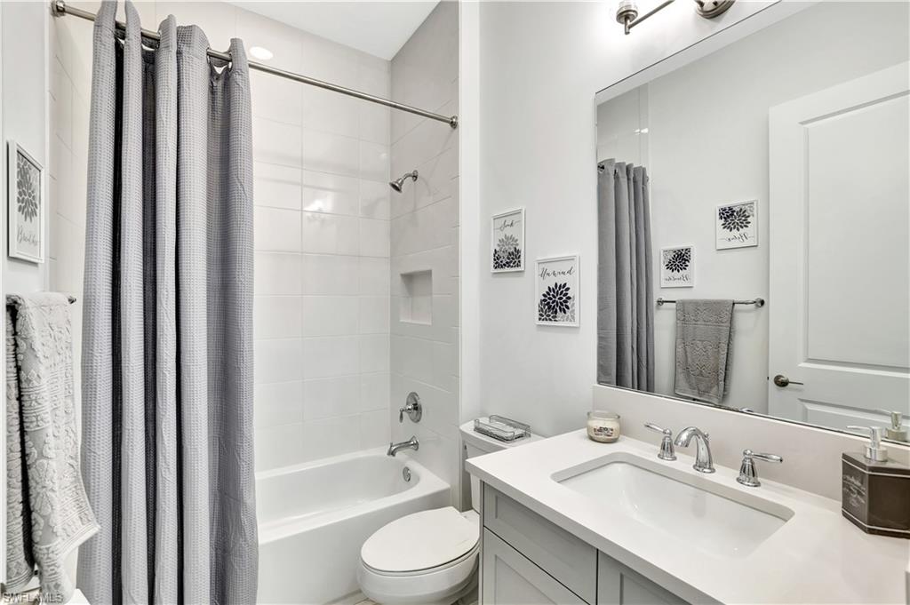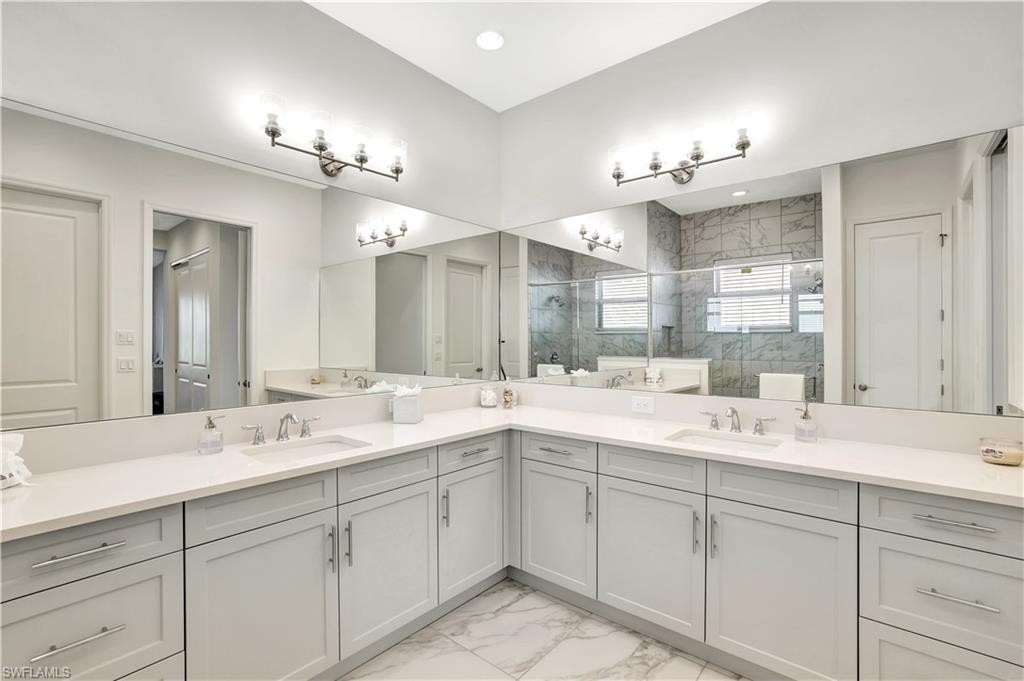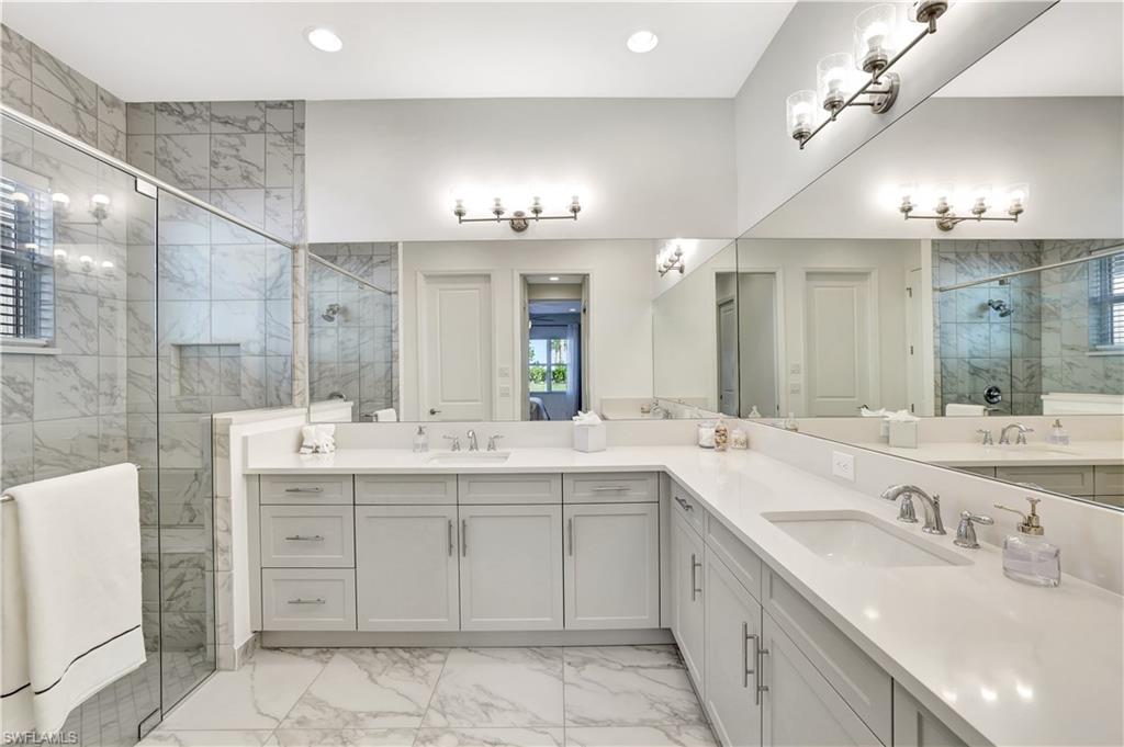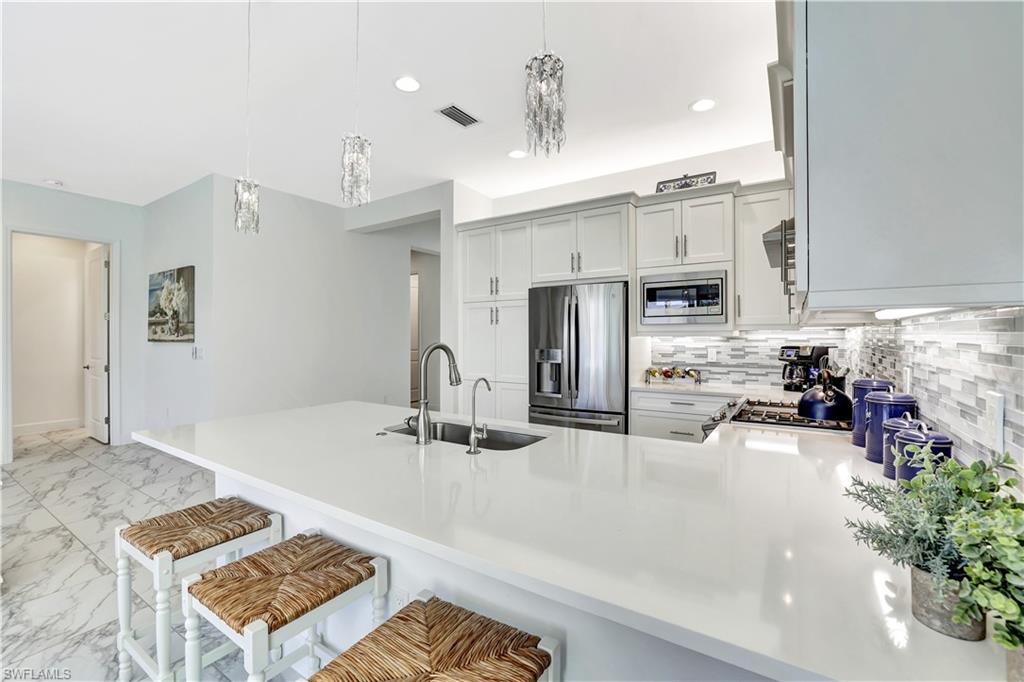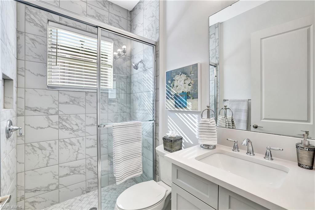 This POPULAR PELICAN FLOOR PLAN at Valencia Trails in Naples, Florida offers a 3 Bedroom + Den, 3 full baths, a 2 car garage and is located on a homesite providing a private landscaped view. This home was completed January 2024. So many great upgrades including an extended paver patio with screen enclosure (allowing for extra outdoor space to entertain), brand new primary closet custom built-ins with shelves and drawers, white maple wood soft close cabinets in the kitchen with above and below lighting, GE stainless steel appliances including a stainless steel vented hood and upgraded backsplash, 21 x 21 floor tile throughout the whole home, impact glass windows, built-in desk and shelves in the den, epoxy finish on the garage floor, FPL surge protector on the main electrical panel and much more! Valencia Trails is a wonderful Active Adult 55+ community in North Naples and has a 42,000 sq. ft. clubhouse with amenities second to none! There is a resort-style pool with beach entry, lap pool, resistance walking pool, in-ground spa, fire pit, tennis courts, pickleball courts, clay bocce ball courts, dog park, poolside shaded cabanas, chaise lounges, fitness room, card rooms, restaurant with indoor and outdoor bars, social hall, nail salon and more. There are over three miles of private walking trails, featuring preserve and lake views.