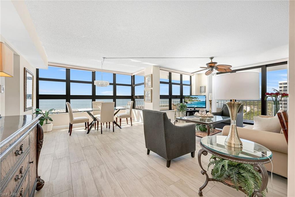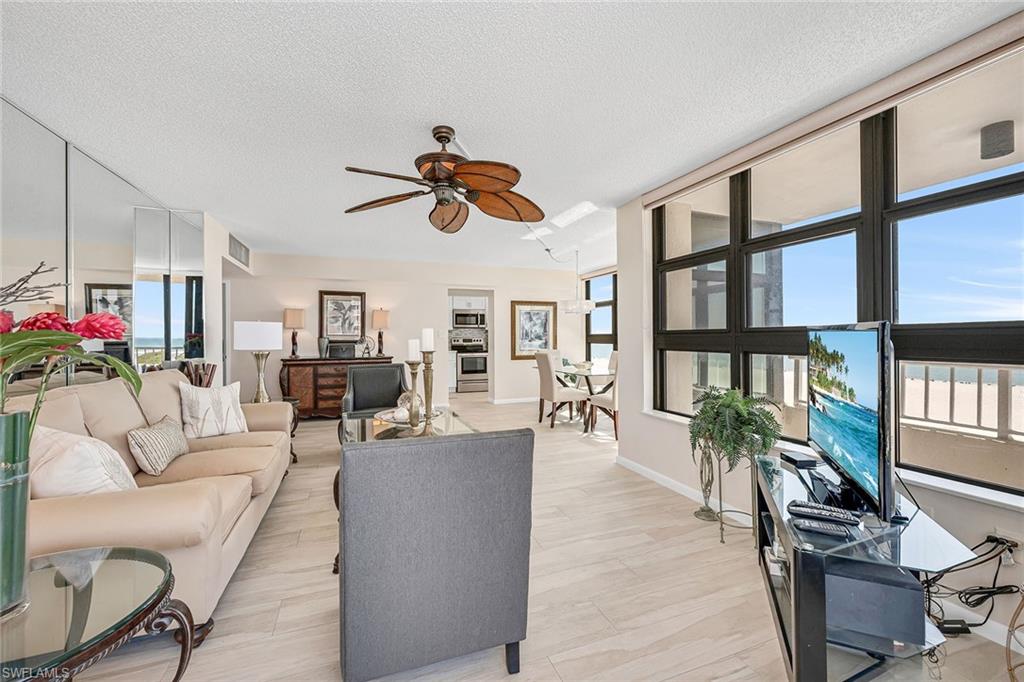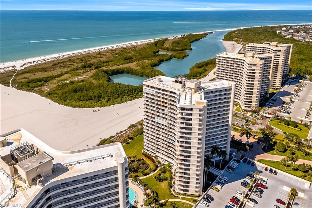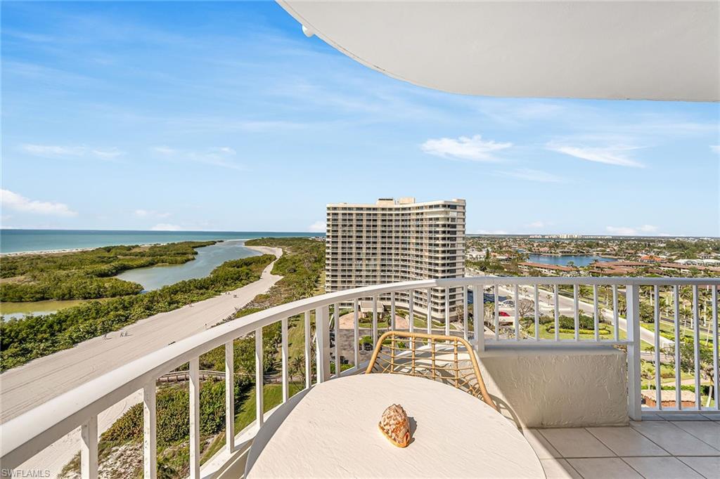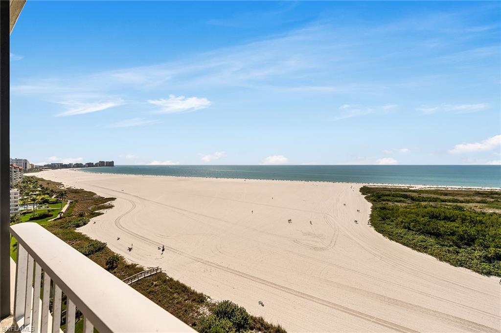 Experience unparalleled coastal living in this rarely available front-facing two-bedroom, two-bath condominium on the 15th floor of the newly remodeled second tower of South Seas. This residence boasts a wraparound balcony that offers wide, unobstructed views of Marco Island's pristine beaches and Gulf of Mexico, including the picturesque Tigertail Beach. Enjoy the sight of pelicans gliding by at eye level as you relax on your expansive patio. Inside, the unit has been meticulously updated to feature elegant tile flooring throughout, a modern kitchen adorned with high-end quartz countertops, contemporary cabinetry and top-tier appliances. Both baths have been tastefully remodeled with sophisticated tilework, and ample closet space is available to accommodate you and your guests. Impact-resistant glass doors and windows throughout the unit provide enhanced safety and tranquility. As a resident of the South Seas community, you'll have exclusive access to a private beach, pickleball and tennis courts, available boat slips, a new state-of-the-art fitness center and a golf practice putting green. Additional conveniences include covered parking and a dedicated storage locker. Seize this rare opportunity to own a stunning waterfront retreat that ideally blends luxury with nature's beauty.