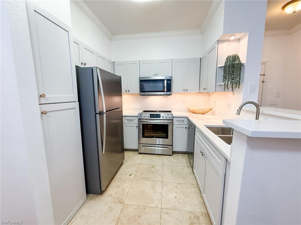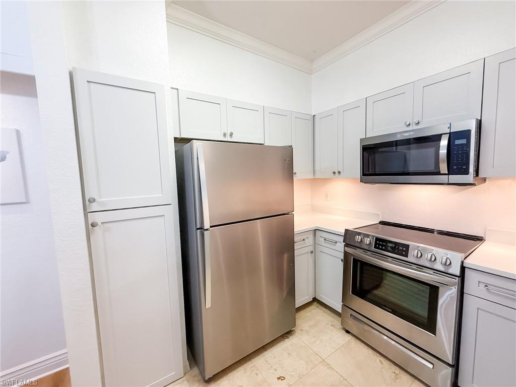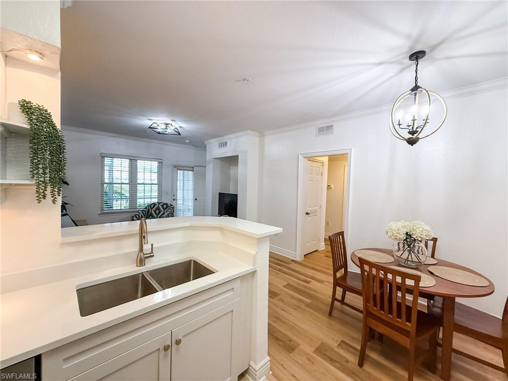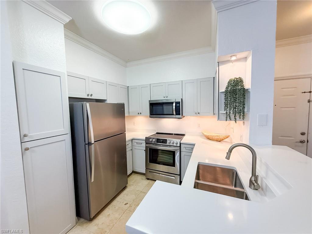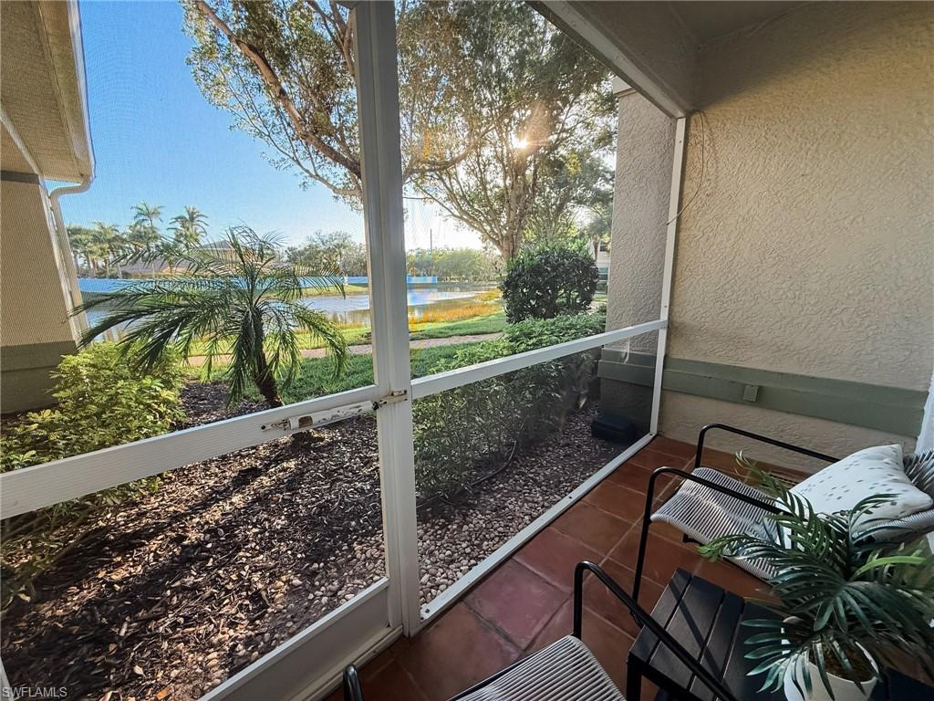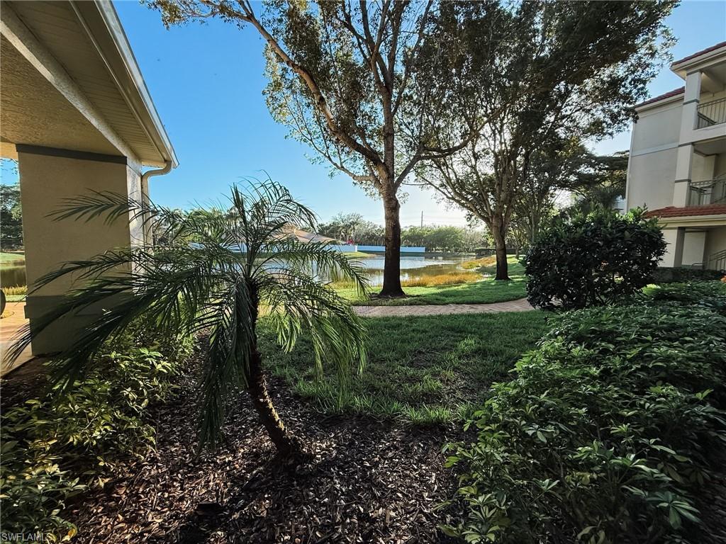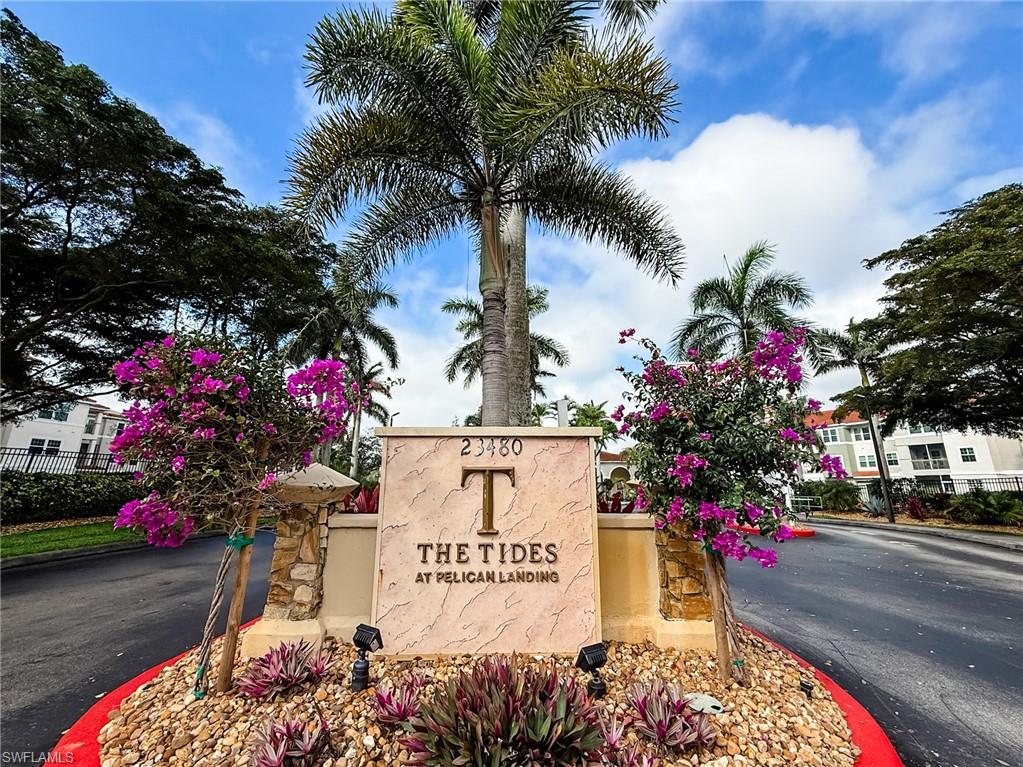 Move In Ready First Floor Condo with 1 Car Garage directly across the hall! Water views from every room including the lanai facing the peaceful pond and landscaped area. This gorgeous first floor condo was just renovated with a brand new Kitchen! New cabinetry, quartz countertops, new stainless sink and never used appliances! New luxury vinyl plank flooring throughout the home with travertine floors in Kitchen and Bathroom. Updated lighting and ceiling fans. Sold furnished! Open Floor plan with lots of natural light from the western exposure. Hurricane impact windows provide protection from the summer weather and heat. Screened lanai off living room with tile floors and utility closet for water heater. Second bedroom opens to hallway and living room with double doors. Makes the perfect den/office and guest room with pull out sleeper sofa. Plantation shutters in both bedrooms. Primary bedrooom has lots of space with a huge walk in closet. Primary bedroom has door to access bedroom making for en-suite access. Bathroom features brand new vanity and countertops. Large soaker tub and shower surround. Laundry closet accessed from inside bathroom with washer, dryer and shelving for storage. Additional closet in hallway for extra storage. Garage #1 is located directly across the hallway from this unit, just a few steps into your private garage. Extra shelving for storage and power outlets for charging tools or adding an extra freezer/fridge. Parking spot #50 is in front of the building with easy access to walk to the unit door. Clubhouse is across the parking lot, close by. Mail station is located next to clubhouse. Community pool, fitness room. Gated entry to community with guard kiosk. Must show Drivers License to enter. The Tides at Pelican Landing is conveniently located in Estero close to shopping dining and the beaches. 90 day min rentals. X Flood zone. Pet friendly condo. See floor plan in photos. Virtual video tour available!