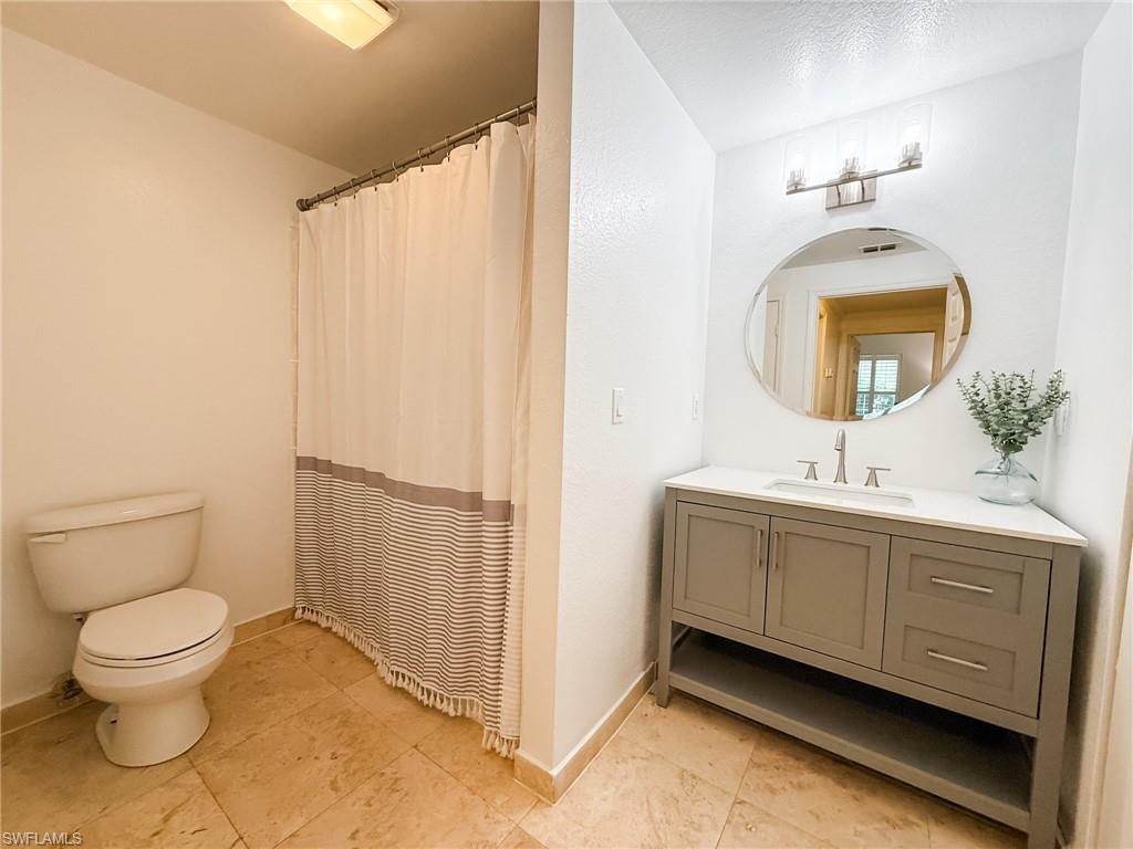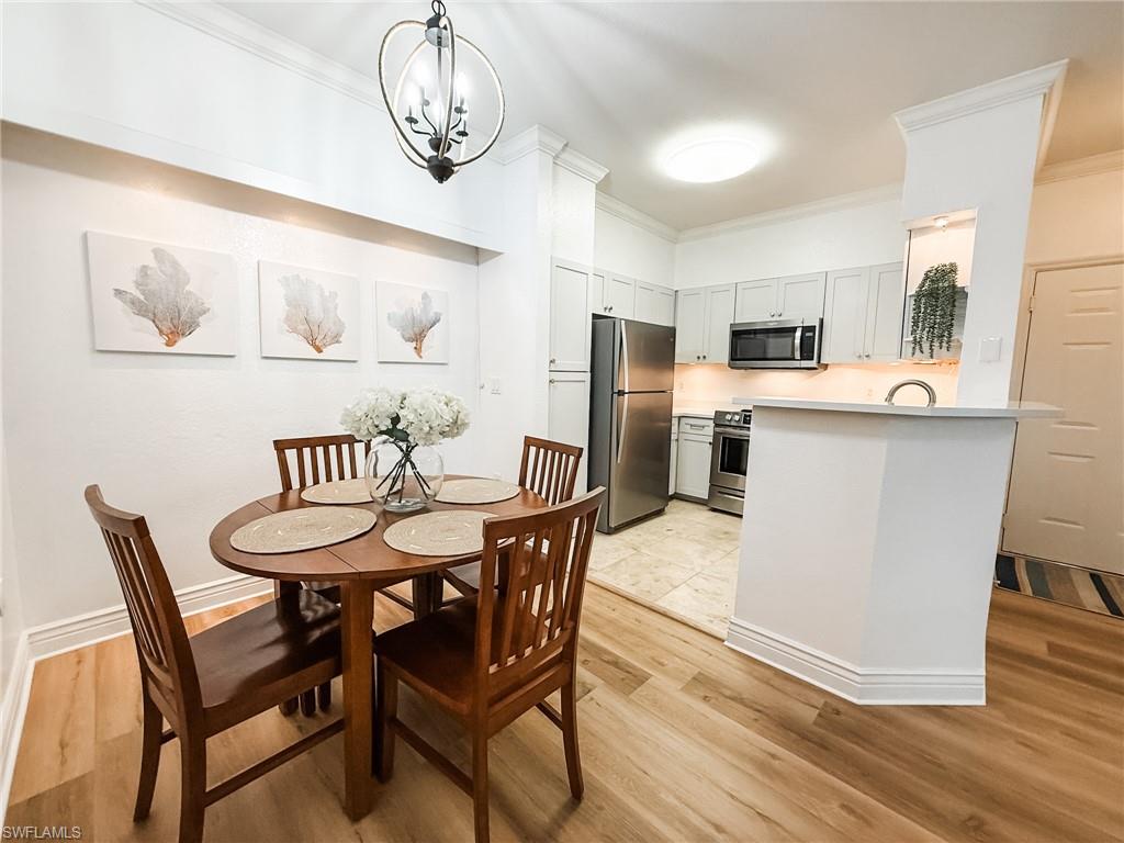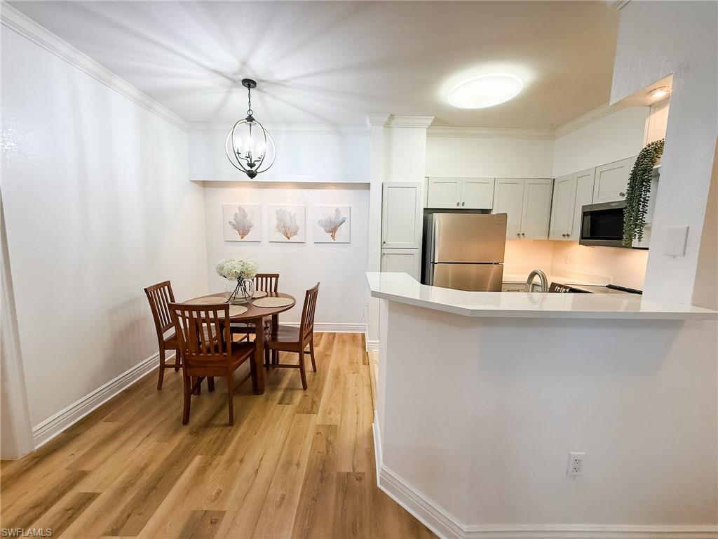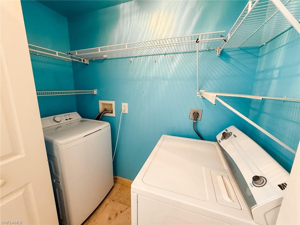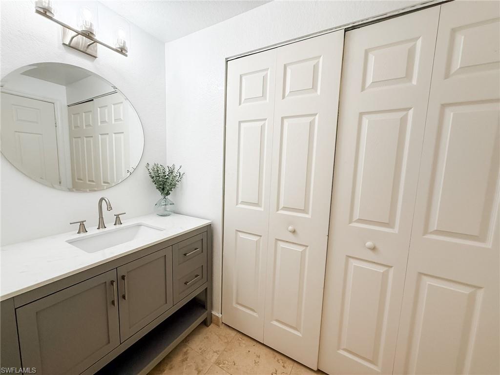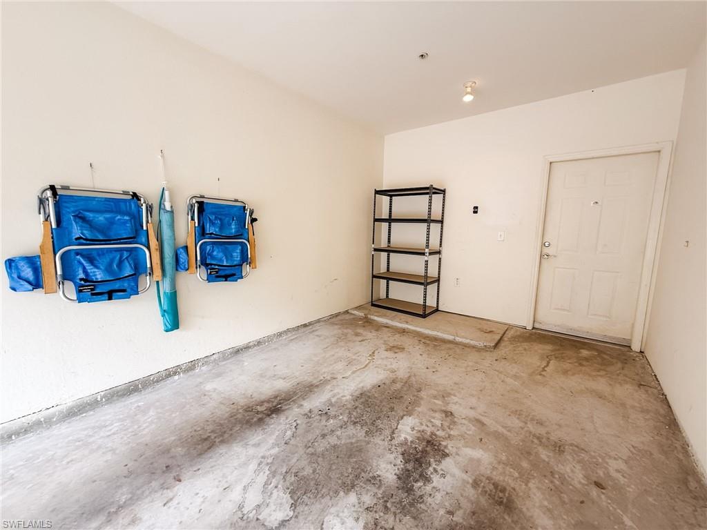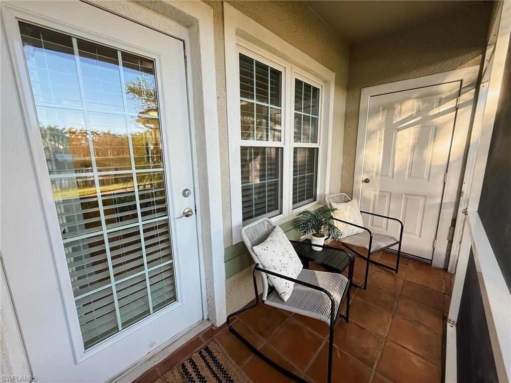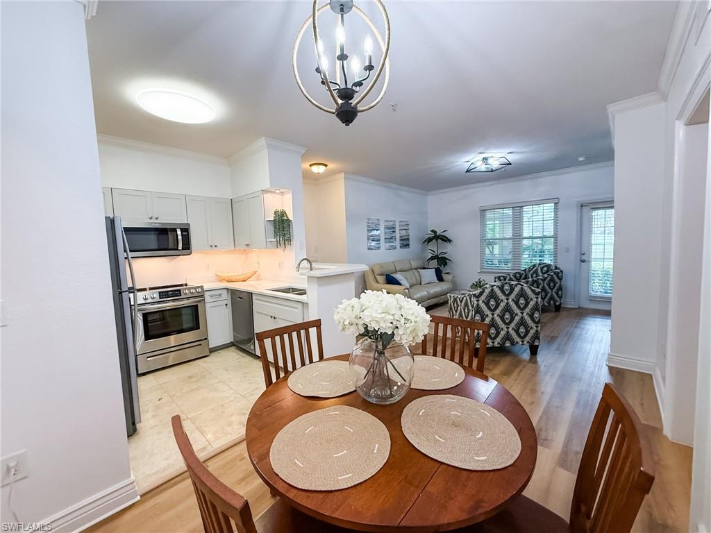 Move In Ready First Floor Condo with 1 Car Garage directly across the hall! Water views from every room including the lanai facing the peaceful pond and landscaped area. This gorgeous first floor condo was just renovated with a brand new Kitchen! New cabinetry, quartz countertops, new stainless sink and never used appliances! New luxury vinyl plank flooring throughout the home with travertine floors in Kitchen and Bathroom. Updated lighting and ceiling fans. Sold furnished! Open Floor plan with lots of natural light from the western exposure. Hurricane impact windows provide protection from the summer weather and heat. Screened lanai off living room with tile floors and utility closet for water heater. Second bedroom opens to hallway and living room with double doors. Makes the perfect den/office and guest room with pull out sleeper sofa. Plantation shutters in both bedrooms. Primary bedrooom has lots of space with a huge walk in closet. Primary bedroom has door to access bedroom making for en-suite access. Bathroom features brand new vanity and countertops. Large soaker tub and shower surround. Laundry closet accessed from inside bathroom with washer, dryer and shelving for storage. Additional closet in hallway for extra storage. Garage #1 is located directly across the hallway from this unit, just a few steps into your private garage. Extra shelving for storage and power outlets for charging tools or adding an extra freezer/fridge. Parking spot #50 is in front of the building with easy access to walk to the unit door. Clubhouse is across the parking lot, close by. Mail station is located next to clubhouse. Community pool, fitness room. Gated entry to community with guard kiosk. Must show Drivers License to enter. The Tides at Pelican Landing is conveniently located in Estero close to shopping dining and the beaches. 90 day min rentals. X Flood zone. Pet friendly condo. See floor plan in photos. Virtual video tour available!