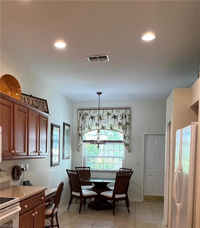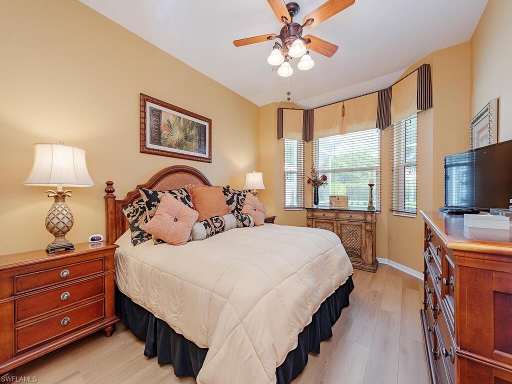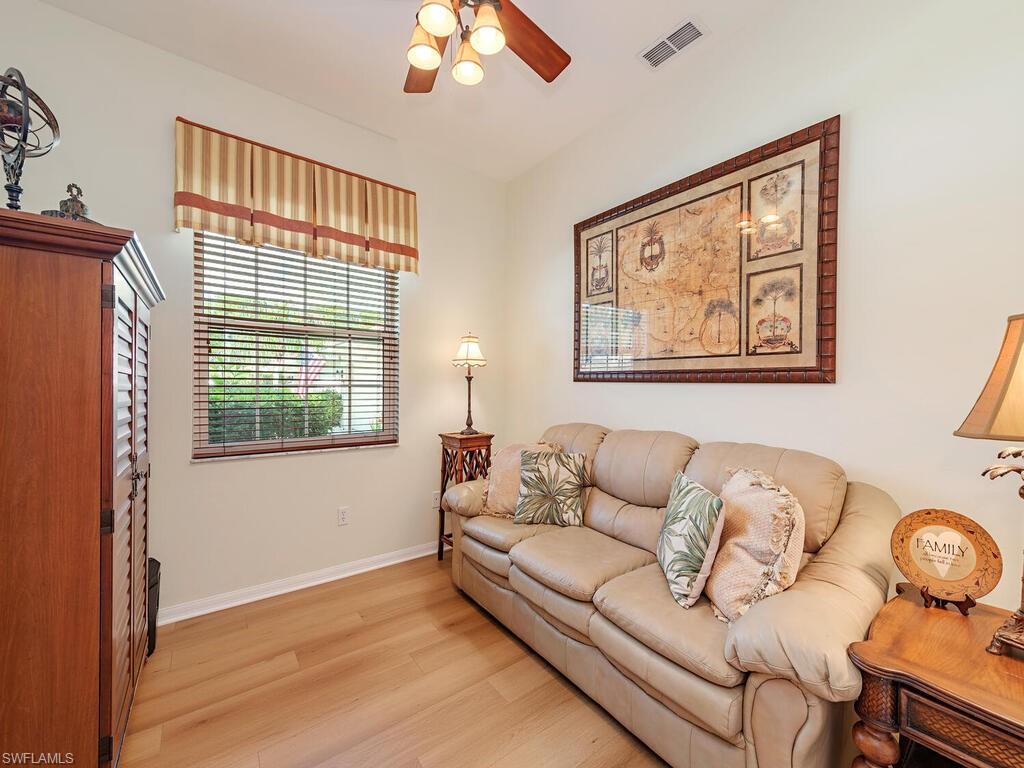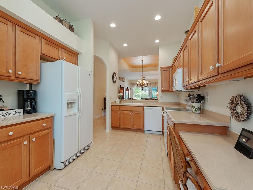 POOL/lanai, Single family under $550K won’t last. Charming turnkey 2 bedroom plus den. Walk into your inviting foyer to the open floor plan including Living and and Dining areas. Kitchen features eat-in kitchen, pantry, planning desk, cabinets with pull outs, Corian counters, and breakfast bar looking into LR/DR combo. Private guest bedroom on one end of the unit and the Primary suite is on the opposite end is ideal for optimum privacy. Den is located off the foyer and could easily be used as a third bedroom. Spacious Living Room has surround sound and overlooks covered lanai area and salt water pool. Primary suite with his and her sinks, private commode, separate tub/shower and spacious closet space. Ideal location with extended lot beyond the lanai for total privacy while enjoying your pool. Hurricane protection with impact windows and doors plus no need to bring lanai furniture in when leaving for extended time with hurricane shutters on lanai also. Calumet Reserve has a clubhouse/pool within the community for your enjoyment right down the street. Gated community. Hurry, this won’t last at this price. Players Club and Spa is optional