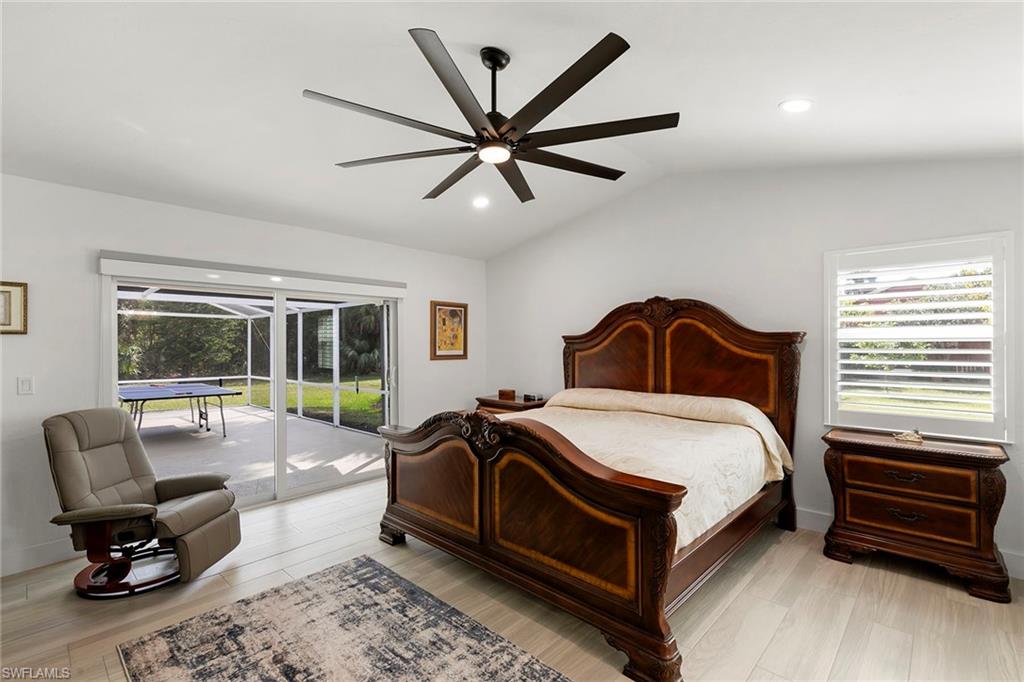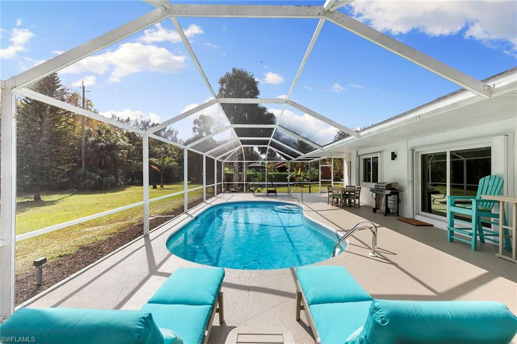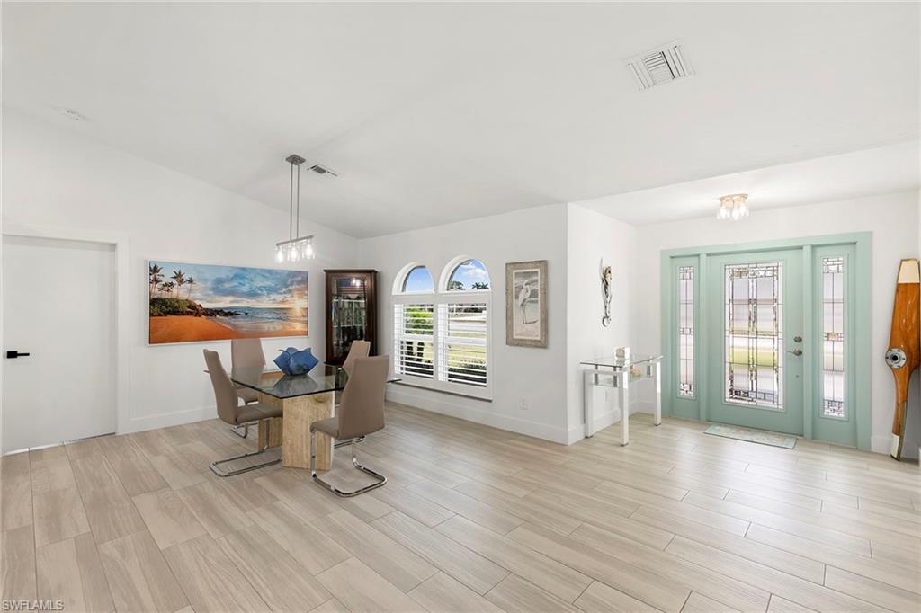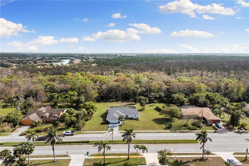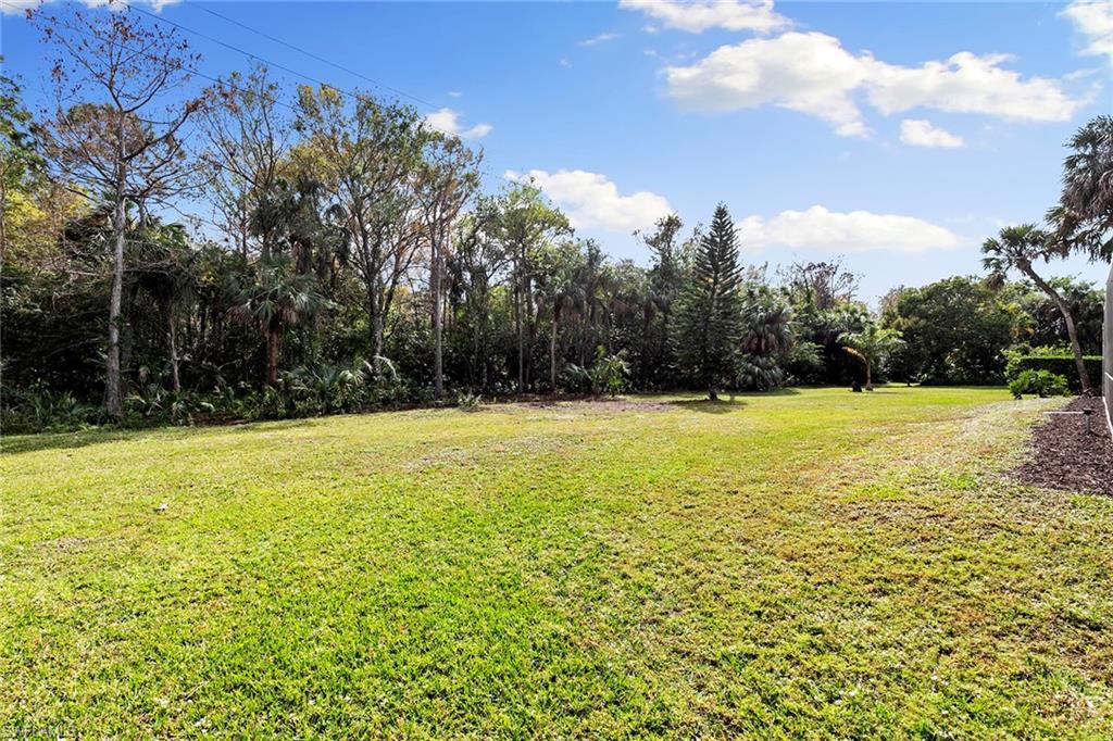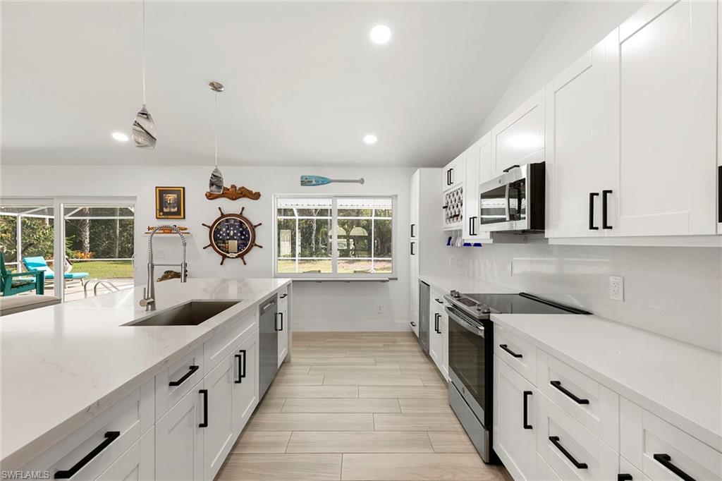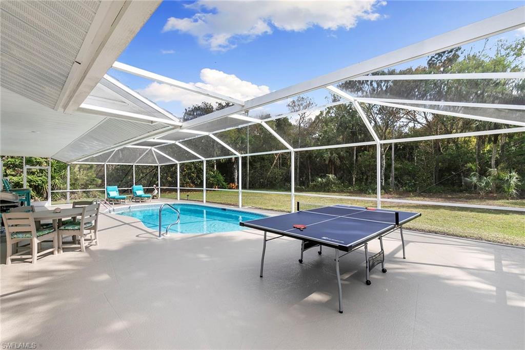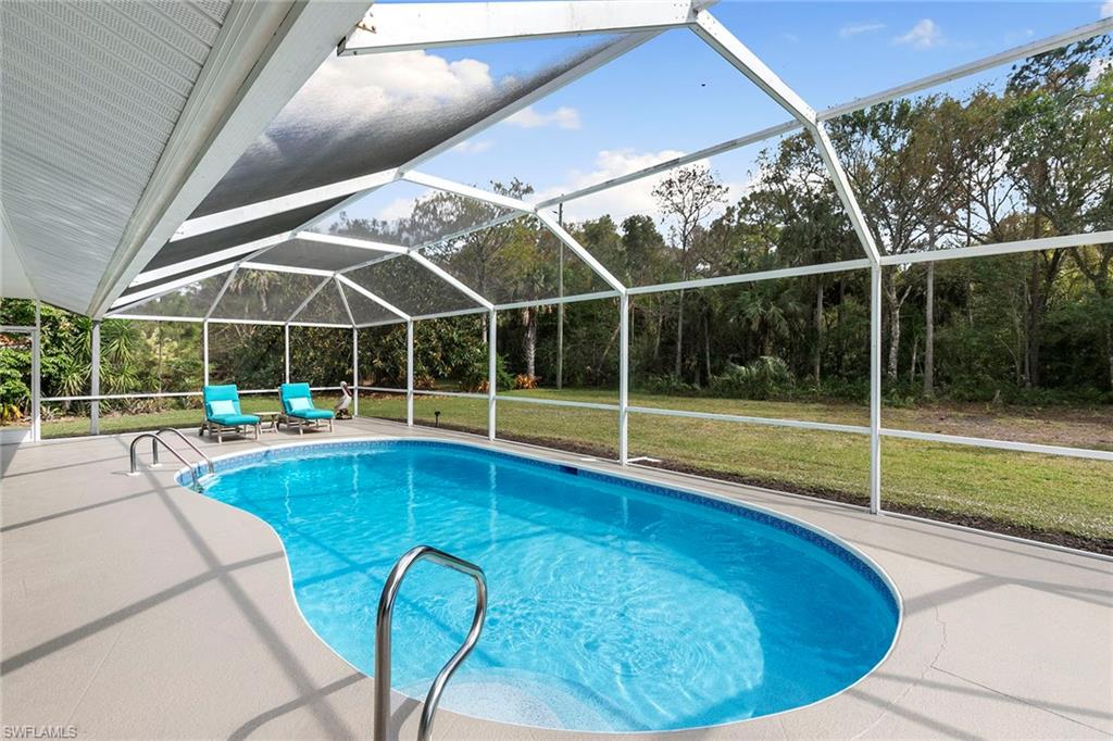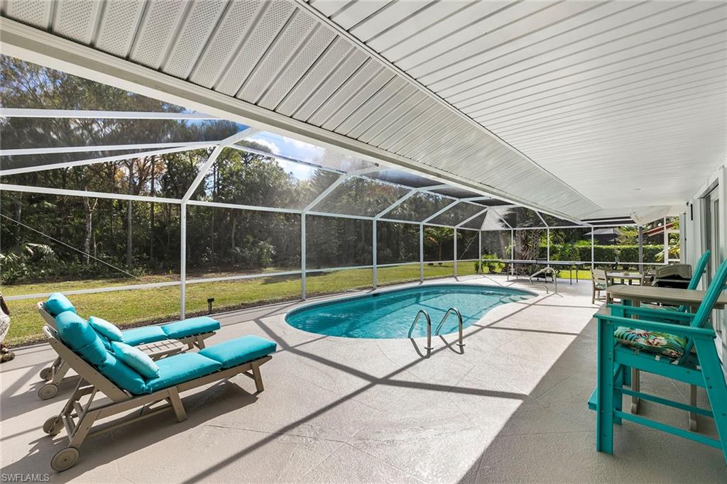 This beautifully renovated single-family home is on almost a full acre, an .86-acre lot making this prime property a unique hidden gem. Upon entering, one will encounter a light and bright open concept living and dining area with high ceilings. The gourmet chef’s kitchen includes a large island and breakfast bar, white shaker-style cabinets, quartz countertops and matching quartz backsplash, as well as new stainless steel appliances. The entire home features wood-look tile flooring, modern baseboards and trim. Additionally, the baths have been fully updated, and the home has been painted with new light and plumbing fixtures installed. The primary bedroom is generously sized, featuring two walk-in closets and sliding doors that lead to the lanai. The guest bedrooms are positioned on the opposite side of the home for privacy. Enjoy your morning coffee or evening cocktails from the expansive screened lanai with pool offering quiet serene tranquility views of the preserves that are often visited by deer. The laundry room has been expanded to include plenty of storage. New impact windows and doors installed in 2024, along with manual shutters for most windows, providing peace of mind. This property is conveniently about six miles from downtown 5th Avenue Naples, offering easy beach access, boating, shopping, dining and more. Don’t miss this wonderful opportunity to start living in paradise today.
