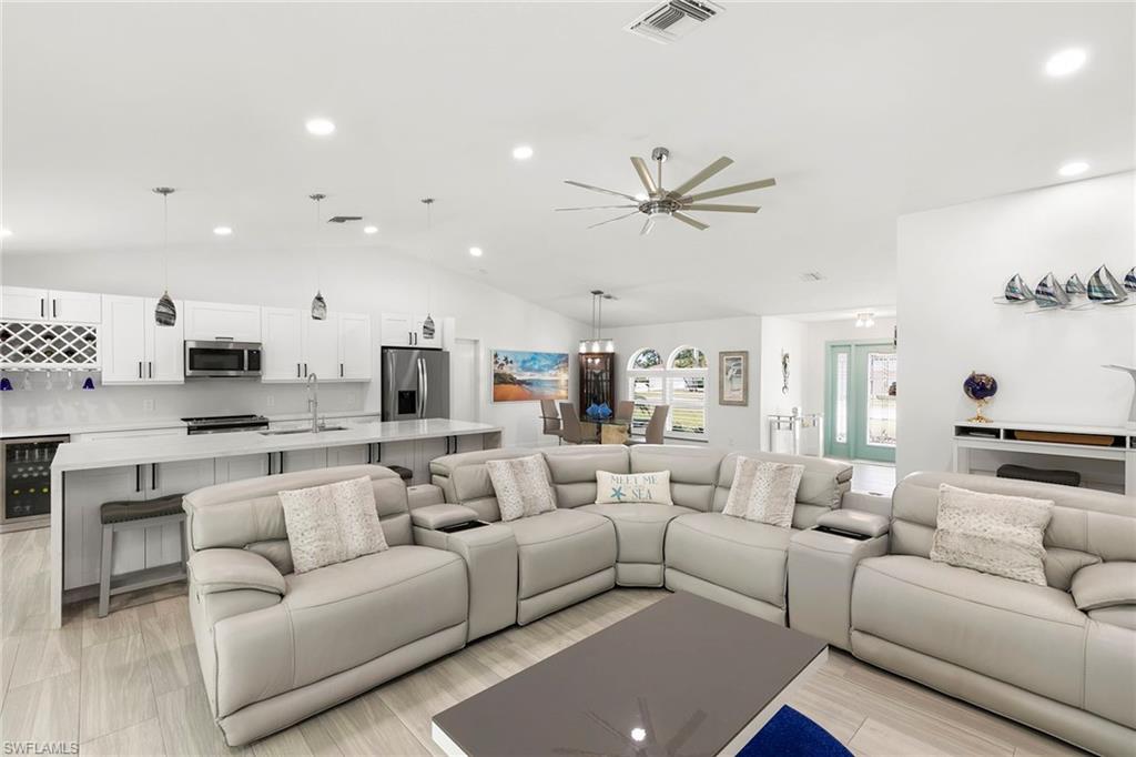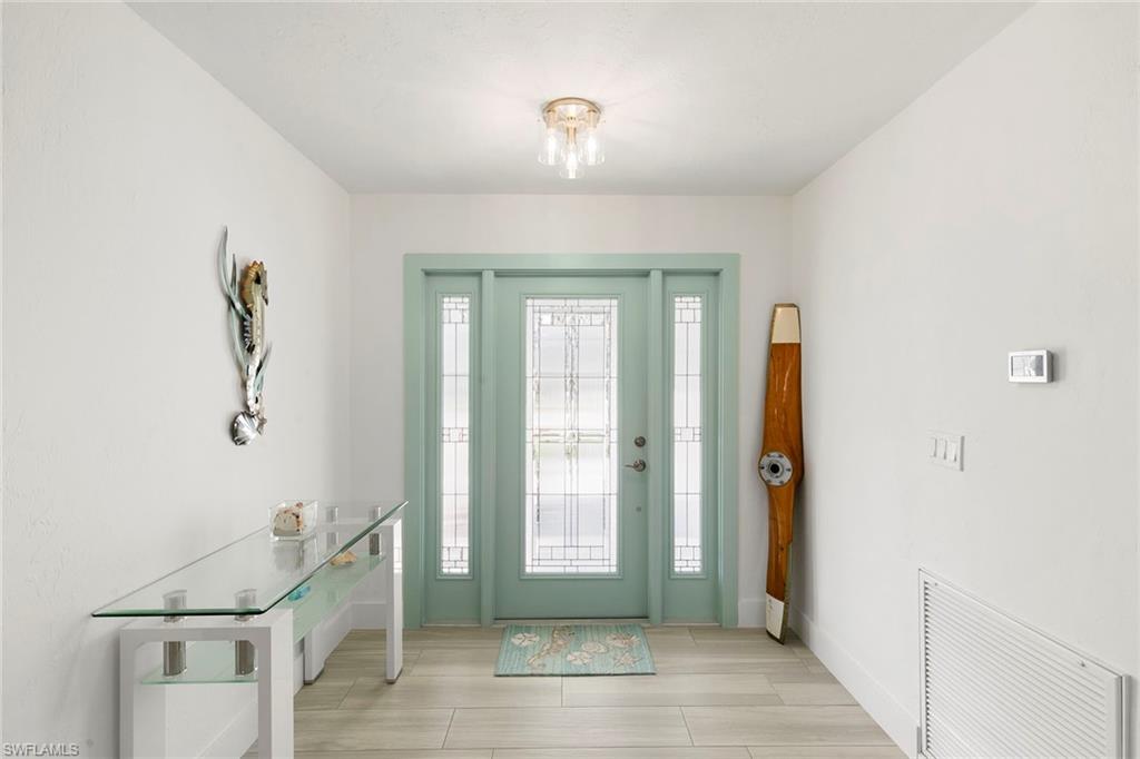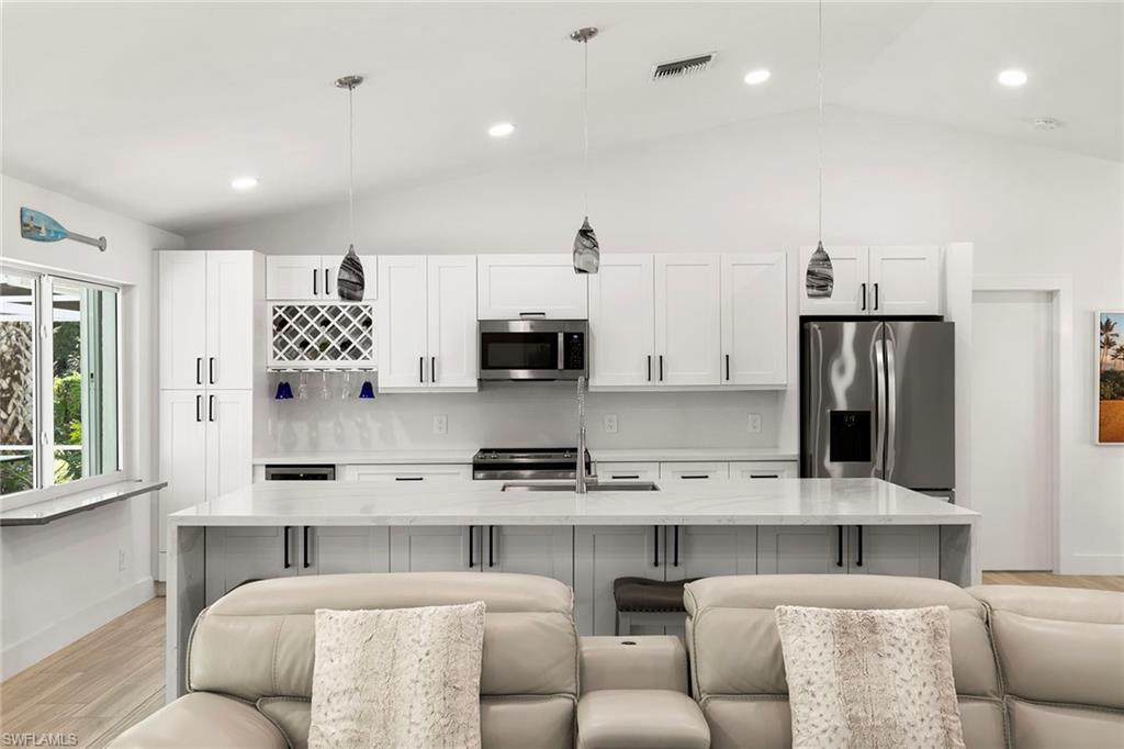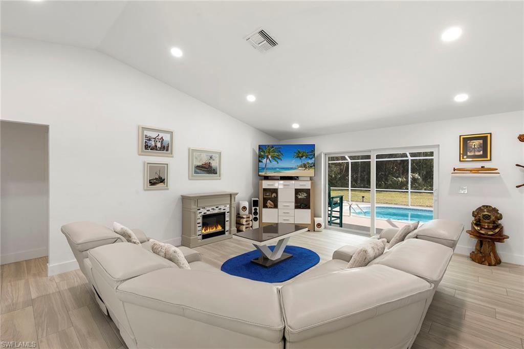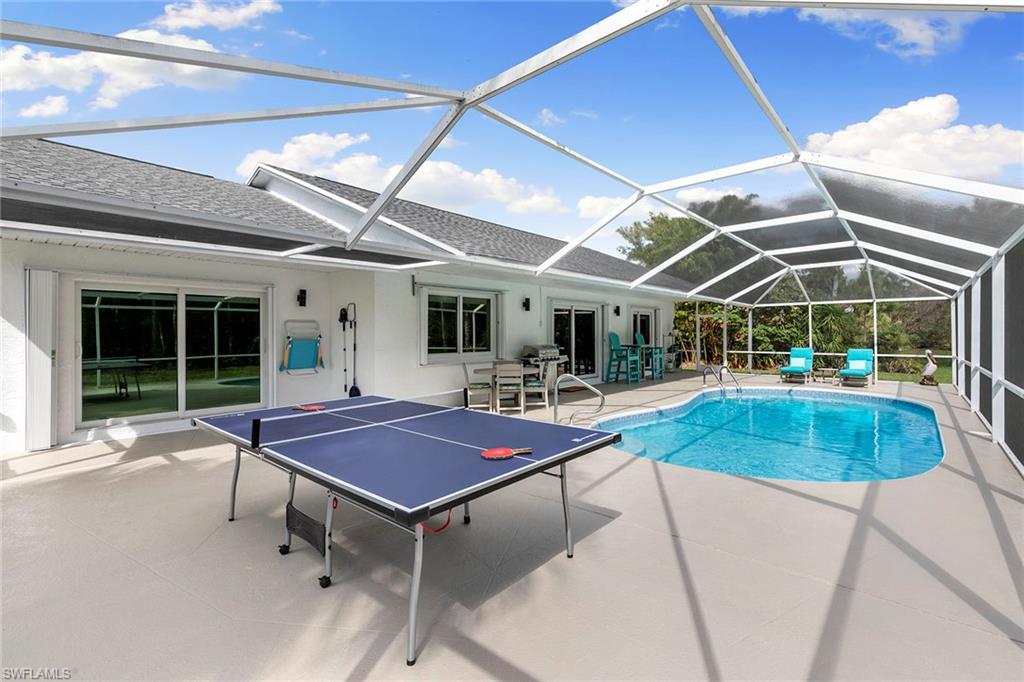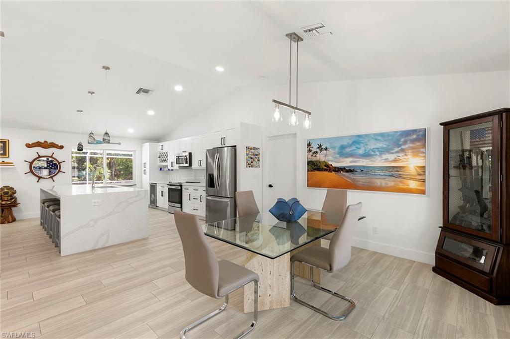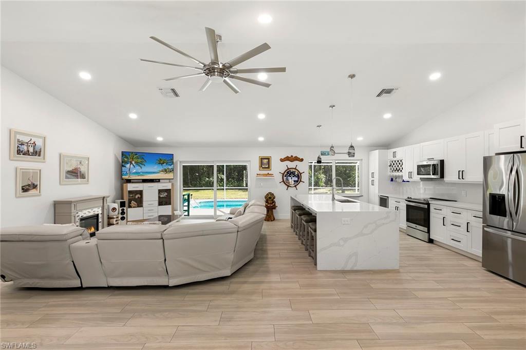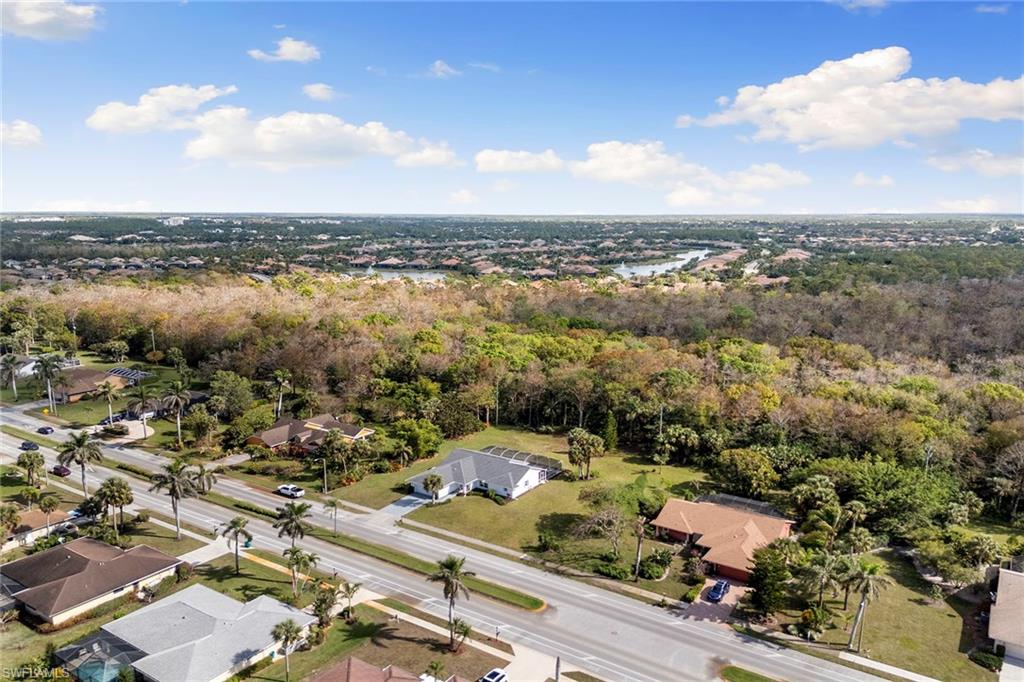 This beautifully renovated single-family home is on almost a full acre, an .86-acre lot making this prime property a unique hidden gem. Upon entering, one will encounter a light and bright open concept living and dining area with high ceilings. The gourmet chef’s kitchen includes a large island and breakfast bar, white shaker-style cabinets, quartz countertops and matching quartz backsplash, as well as new stainless steel appliances. The entire home features wood-look tile flooring, modern baseboards and trim. Additionally, the baths have been fully updated, and the home has been painted with new light and plumbing fixtures installed. The primary bedroom is generously sized, featuring two walk-in closets and sliding doors that lead to the lanai. The guest bedrooms are positioned on the opposite side of the home for privacy. Enjoy your morning coffee or evening cocktails from the expansive screened lanai with pool offering quiet serene tranquility views of the preserves that are often visited by deer. The laundry room has been expanded to include plenty of storage. New impact windows and doors installed in 2024, along with manual shutters for most windows, providing peace of mind. This property is conveniently about six miles from downtown 5th Avenue Naples, offering easy beach access, boating, shopping, dining and more. Don’t miss this wonderful opportunity to start living in paradise today.