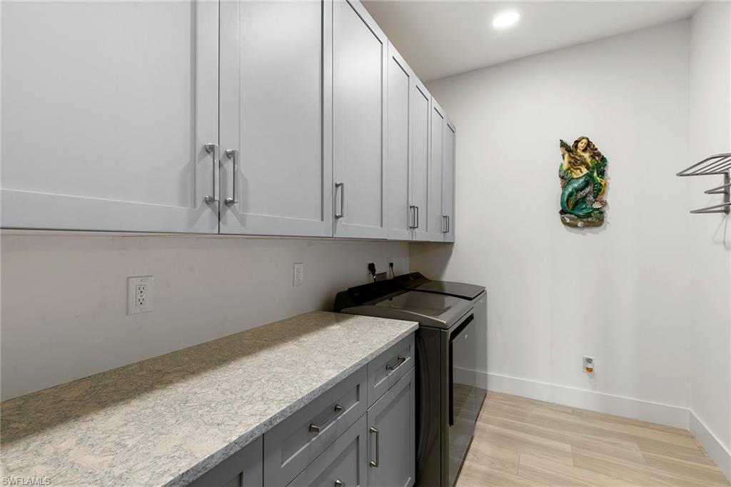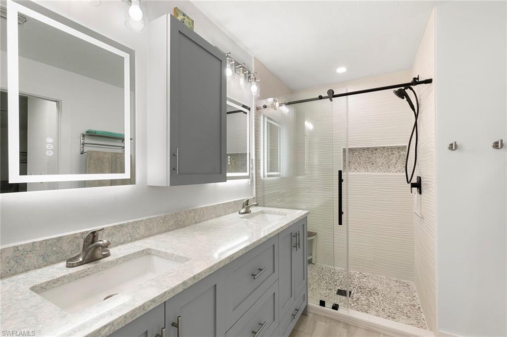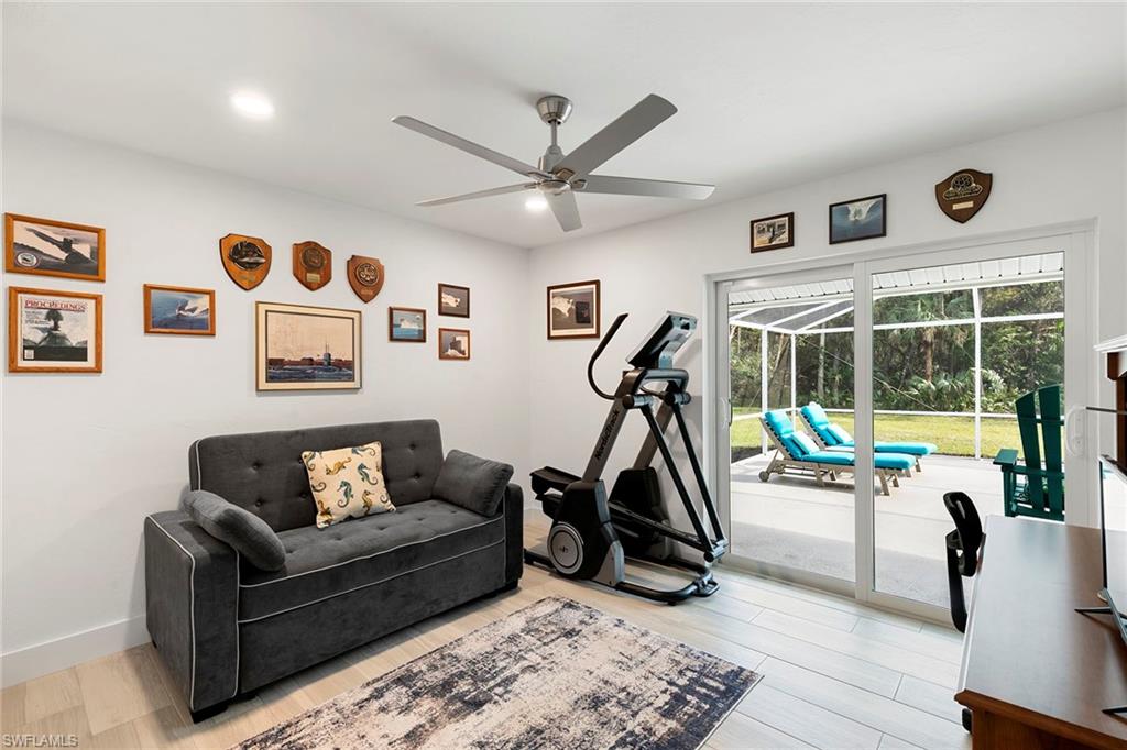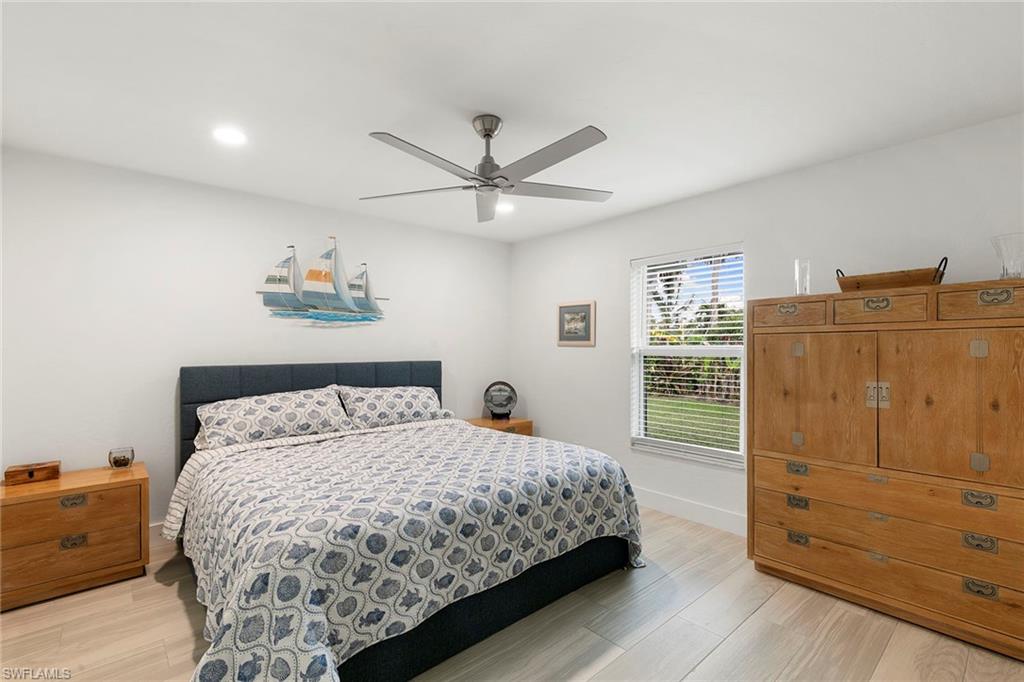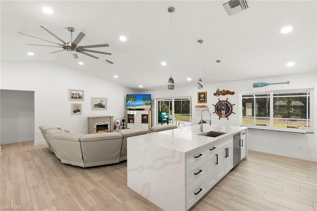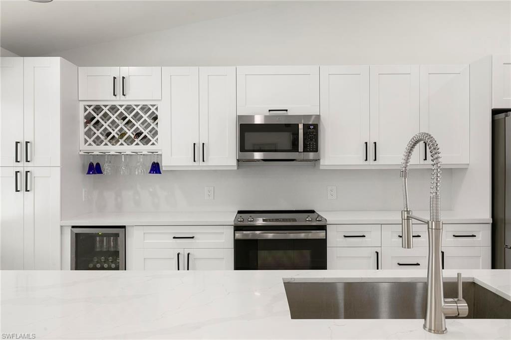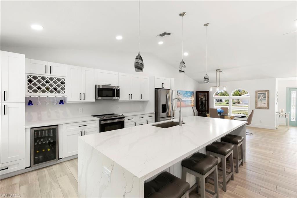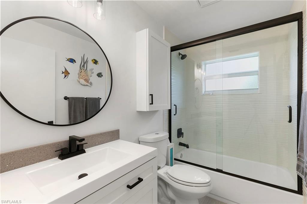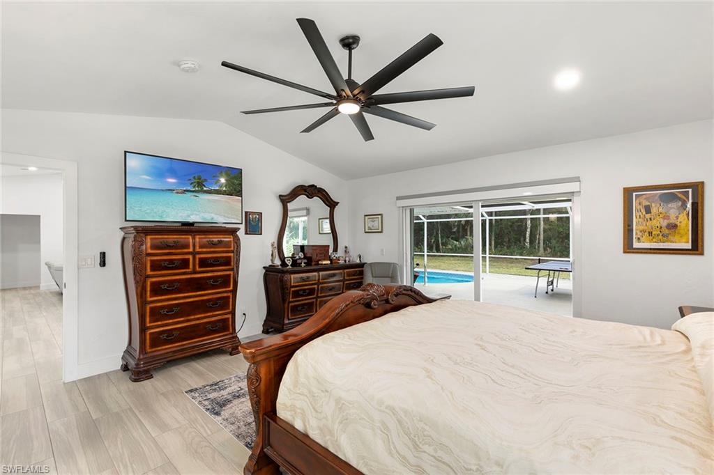 This beautifully renovated single-family home is on almost a full acre, an .86-acre lot making this prime property a unique hidden gem. Upon entering, one will encounter a light and bright open concept living and dining area with high ceilings. The gourmet chef’s kitchen includes a large island and breakfast bar, white shaker-style cabinets, quartz countertops and matching quartz backsplash, as well as new stainless steel appliances. The entire home features wood-look tile flooring, modern baseboards and trim. Additionally, the baths have been fully updated, and the home has been painted with new light and plumbing fixtures installed. The primary bedroom is generously sized, featuring two walk-in closets and sliding doors that lead to the lanai. The guest bedrooms are positioned on the opposite side of the home for privacy. Enjoy your morning coffee or evening cocktails from the expansive screened lanai with pool offering quiet serene tranquility views of the preserves that are often visited by deer. The laundry room has been expanded to include plenty of storage. New impact windows and doors installed in 2024, along with manual shutters for most windows, providing peace of mind. This property is conveniently about six miles from downtown 5th Avenue Naples, offering easy beach access, boating, shopping, dining and more. Don’t miss this wonderful opportunity to start living in paradise today.
