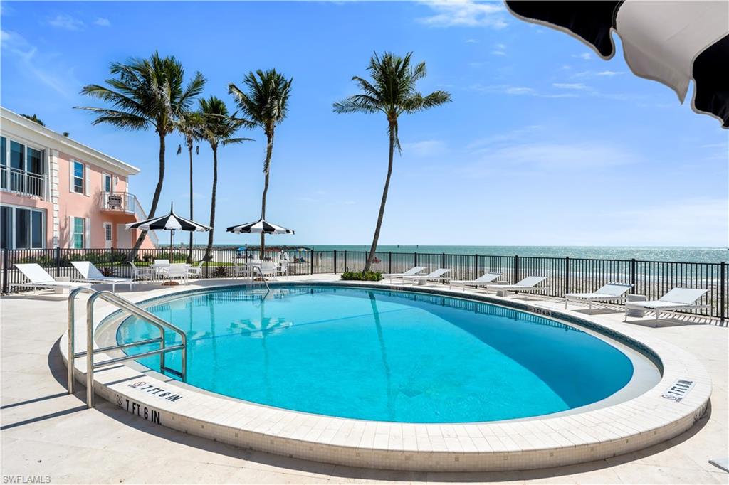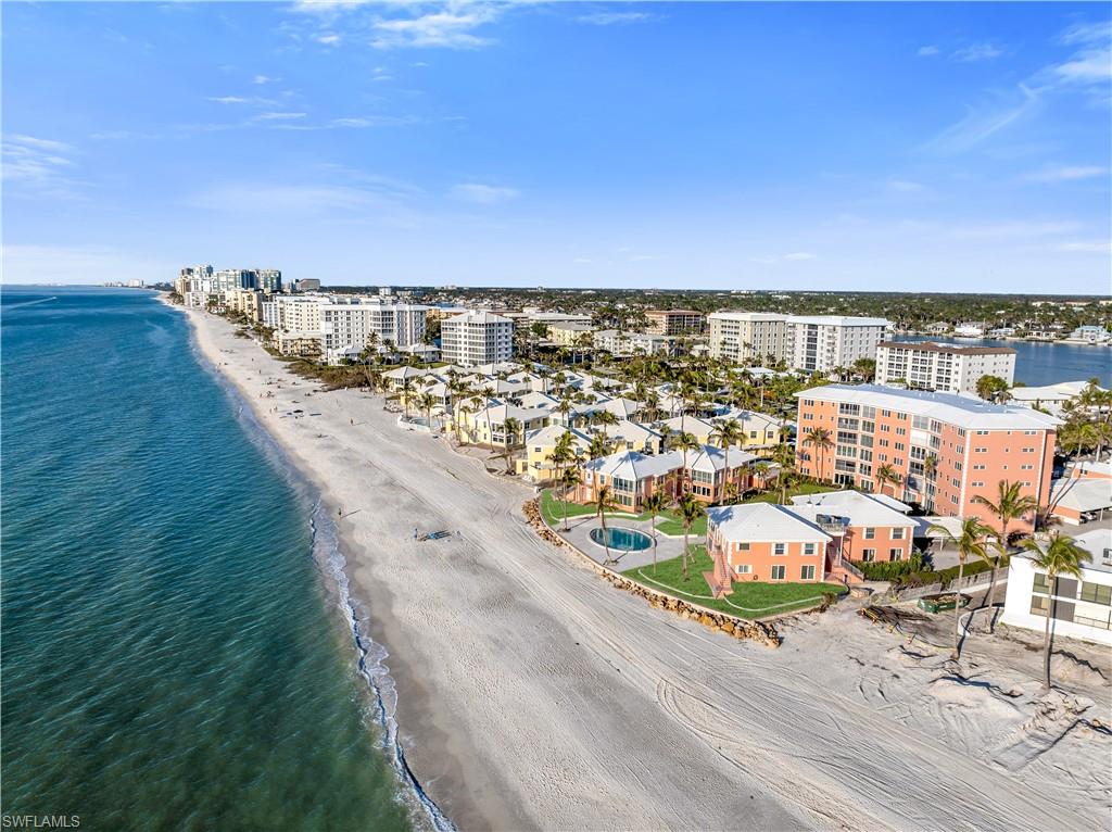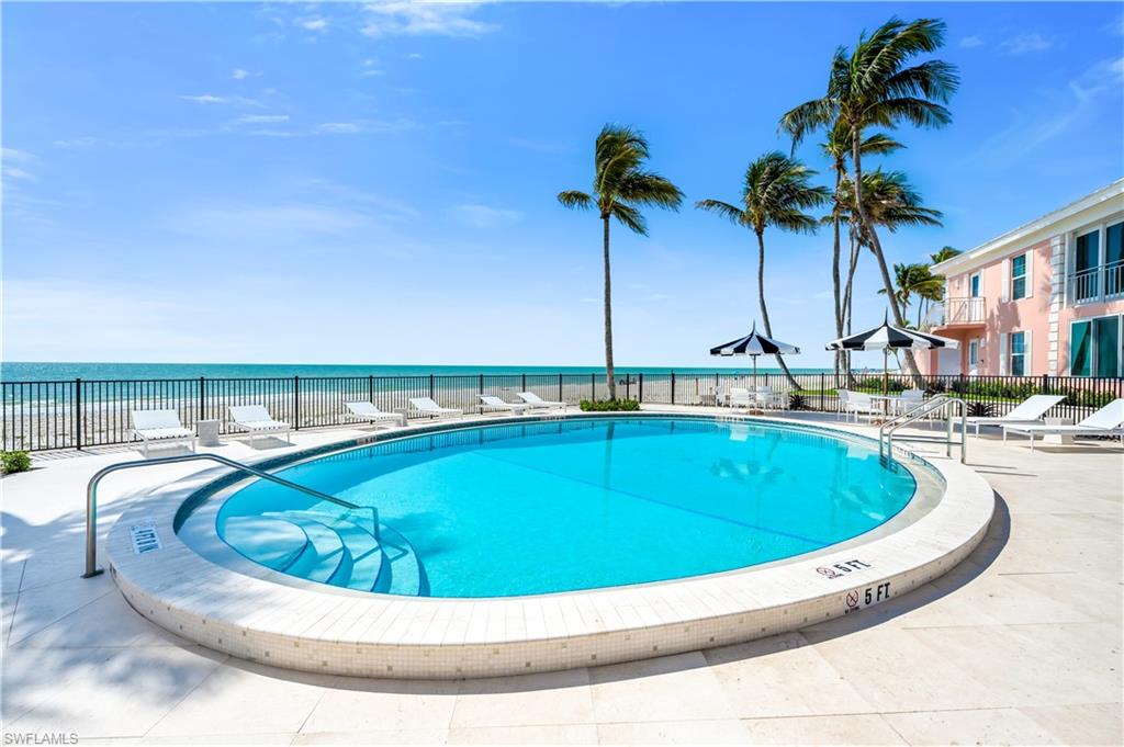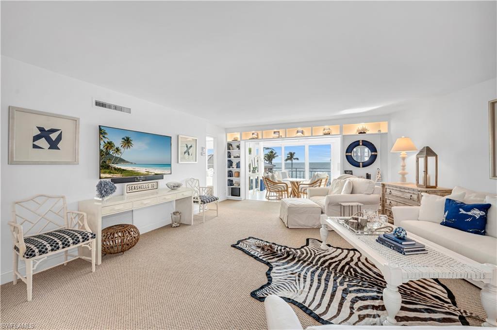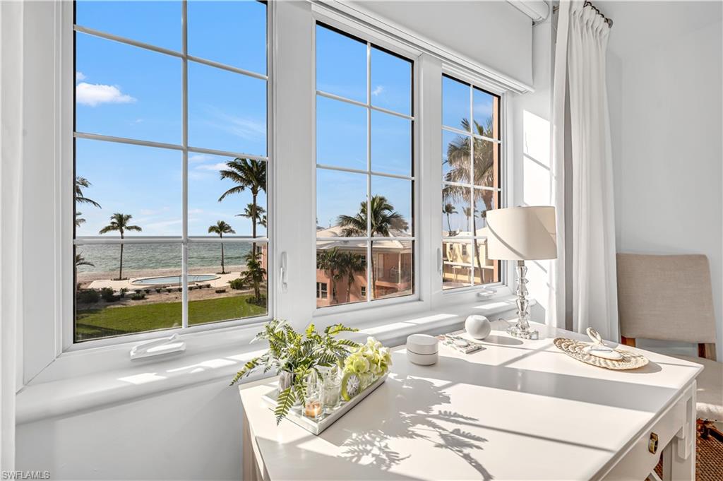 This luxurious condo offers courtyard views of The Gulf and features 2 bedrooms, 2 bathrooms, and 1518 sq/ft under air. Located on the 3rd floor this unit boasts a gourmet kitchen with Quartz countertops and Viking appliances, opened up to showcase Gulf views. A wine refrigerator is conveniently located near the dining room. The living area is adorned with sisal flooring, while the baths are tiled. The remarkable built-in bookcases with lighting adds a touch of class. The master bedroom enjoys glorious Gulf views, and the master bath is well-appointed with dual sinks and large walk-in shower. Guest bedroom includes California Closet built-in cabinets with plenty of storage. New AC has been recently installed. Additionally, the open-air front balcony is a delightful benefit adding to the total square footage. The Shores #33 has a pleasant, well put-together-feel, and the furnishings are included with the sale. Located on the quietest and perhaps the most beautiful stretch of Gulf Shore Blvd, less than 2 miles from the great restaurants and shops of Venetian Village. On a quiet and almost private part of the Gulf beach, less than 100 yards from Doctors Pass that provides easy access to peaceful kayaking and paddle boarding.