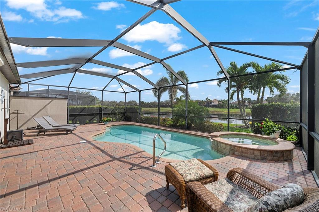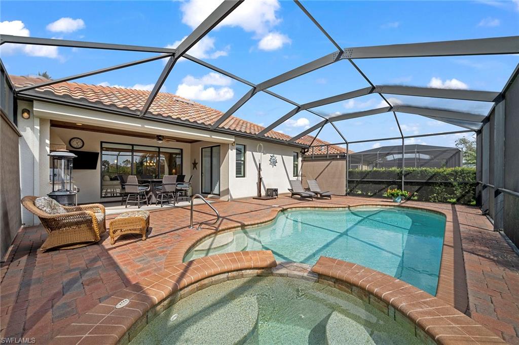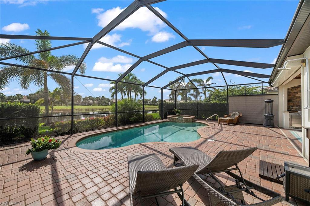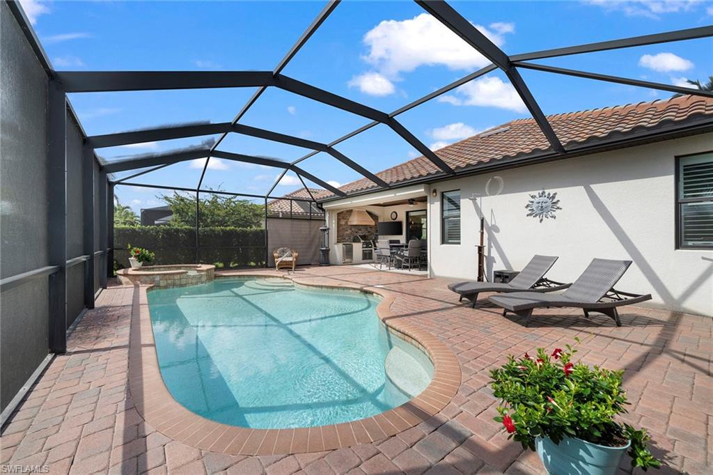 Step into the elegance of this Isabella floor plan featuring three bedrooms plus den and two full baths featuring full golf membership. Designed for comfort and style, this home boasts tile and wood flooring throughout, adding warmth and durability to every space. The expansive lanai with sought-after southern exposure, is an entertainer's dream. Complete with a private pool, spa and outdoor kitchen, all positioned to capture breathtaking lake and golf course views. Whether enjoying a morning coffee or hosting an evening gathering, this outdoor retreat offers tranquility and sophistication. Pride of ownership shines through, with a new high-efficiency air conditioner installed in 2024 and meticulous maintenance ensuring this home is in pristine condition. In the prestigious TwinEagles Club, this residence with full golf membership offers access to 36 holes of championship golf, making it a golfer's paradise. Recent community enhancements include an expanded and modernized clubhouse, a renovated Talon Golf Course and a host of resort-style amenities, providing an unparalleled lifestyle in Southwest Florida.