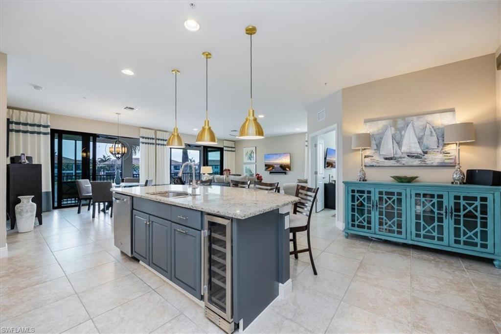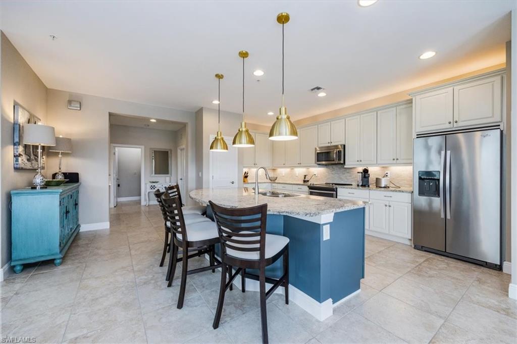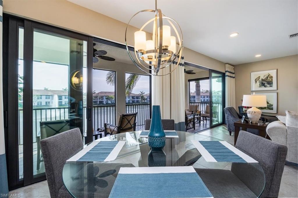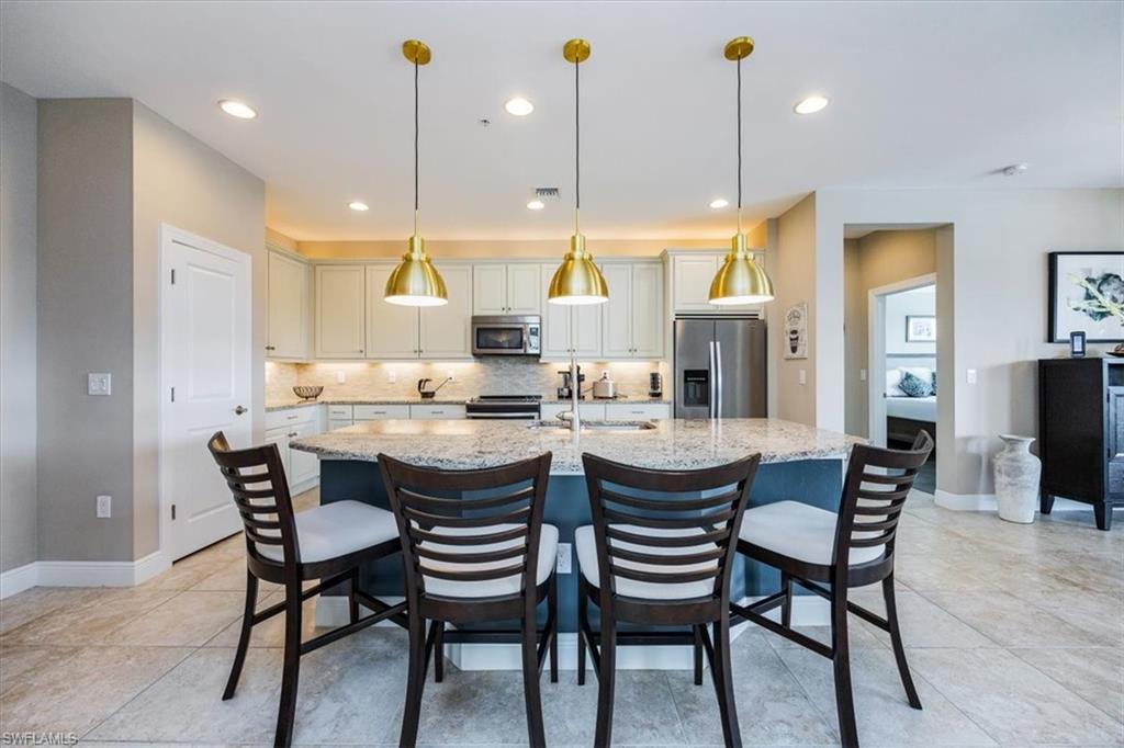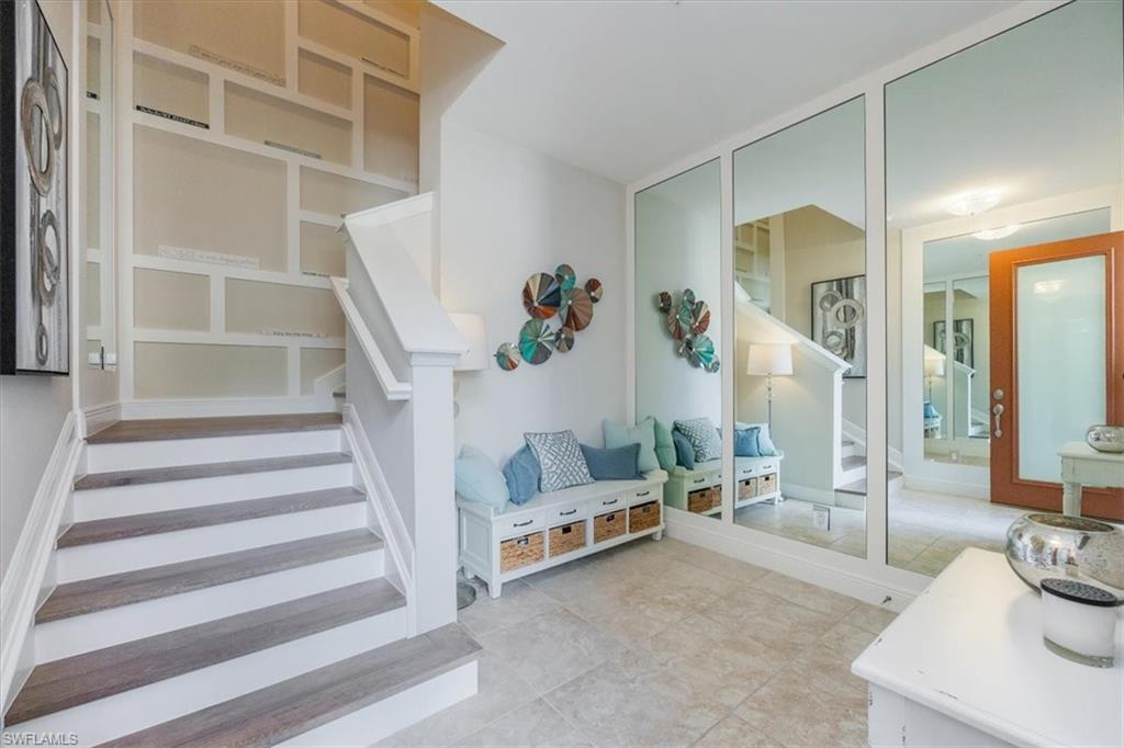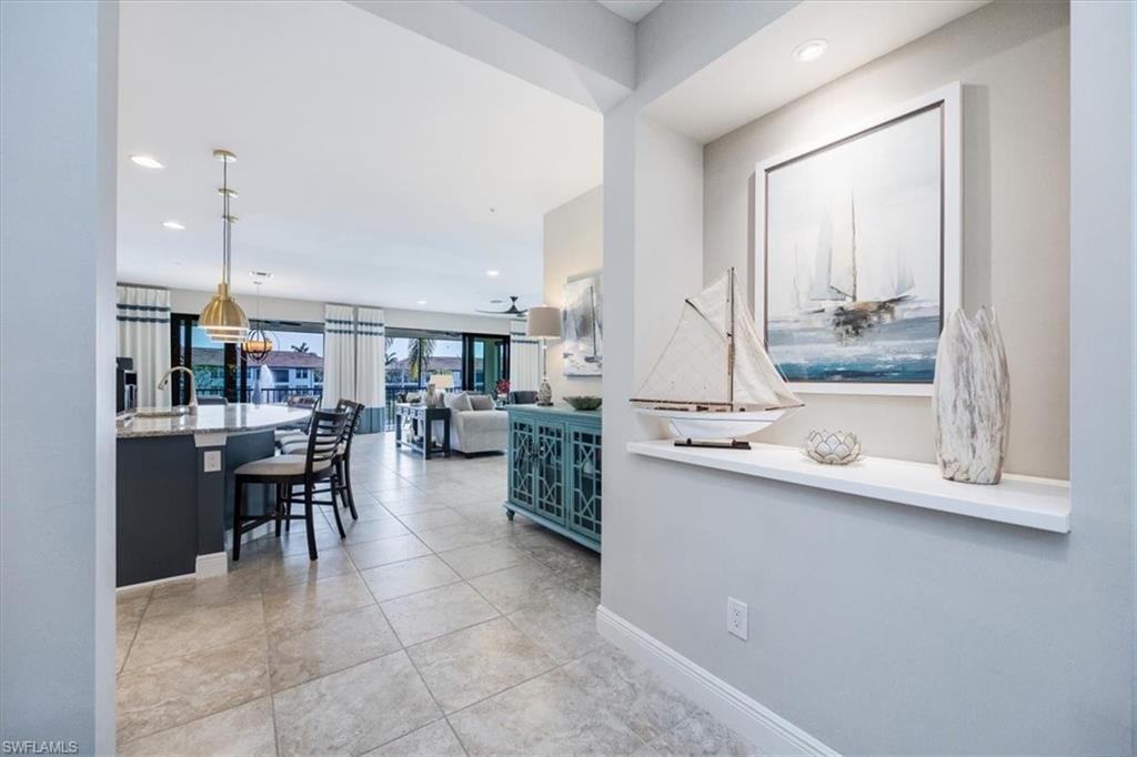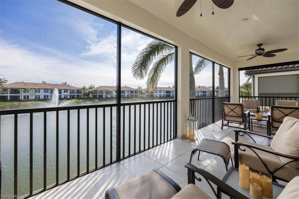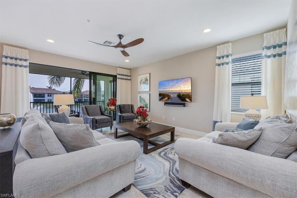 Welcome to this exquisite coastal-inspired retreat, where style meets comfort in the most breathtaking way. Second floor, end unit with southern exposure. The open-concept design is highlighted by the kitchen featuring an oversized granite island, a built-in wine cooler, and striking gold pendant lighting that adds a touch of elegance. The seamless flow into the spacious living and dining areas, framed by floor-to-ceiling sliding glass doors, invites in natural light and gorgeous lake and fountain views. One of the few Carriage Homes offering 3 true bedrooms plus a den. All bedrooms have engineered hardwood flooring. Geometric wall molding enhances the master bedroom wall as you head into the master bath with double vanity, floor to ceiling tiled shower with glass doors and reach your final destination of a masterfully created custom closet that maximizes storage space. Thoughtful details and modern finishes create a warm yet sophisticated ambiance throughout. Whether you're entertaining guests or enjoying a peaceful evening on the lanai, this home offers the perfect blend of luxury and relaxation. Impact windows and doors. Epoxy floor in the double garage. Nestled in the heart of North Naples, Livingston Lakes is a pet-friendly, gated community. With just 230 homes, this charming neighborhood boasts resort-style amenities, including a sparkling pool with lap lanes and cabanas, two built-in gas grills, a stylish clubhouse with a catering kitchen, a state-of-the-art fitness center, and a cozy outdoor fireplace and fountain—all with remarkably low fees. Next door to North Collier Regional Park, where miles of scenic nature trails, top-tier sports facilities, a water park, and the Golisano Children's Museum await. Plus, you’re less than five miles from the breathtaking white-sand beaches of the Gulf of Mexico. With endless shopping and dining options in every direction and convenient access to I-75 and multiple international airports, Livingston Lakes is the perfect place to call home.
