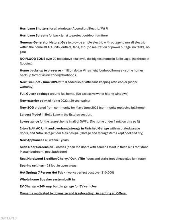 The best deal in SWFL. Welcome to your dream home in the highly sought-after Belle Lago community in the Estates! This exquisite 4,356 sq. ft. residence boasts unparalleled luxury and comfort, perfectly situated among lush landscapes, ensuring ultimate privacy. Key Features: Master Bedroom: Downstairs along with another bedroom. New Roof: Enjoy peace of mind with a brand-new roof completed in May 2024, offering durability and protection for years to come. Hurricane Preparedness: Equipped with hurricane shutters (2022), your home is ready to withstand the elements, providing safety during storm season. Power Outages? No Problem! A whole-home generator guarantees you're never without power, no matter the weather. Home Theater: Create unforgettable movie nights in your very own HD movie theater, perfect for entertaining family and friends. Luxurious Interiors: Revel in the beauty of real hardwood floors (no laminate here!) and crown molding that add elegance and warmth. Spacious Garage: Your insulated and fully air-conditioned garage offers ample space for vehicles and additional storage Buyers Rep will be satisfied