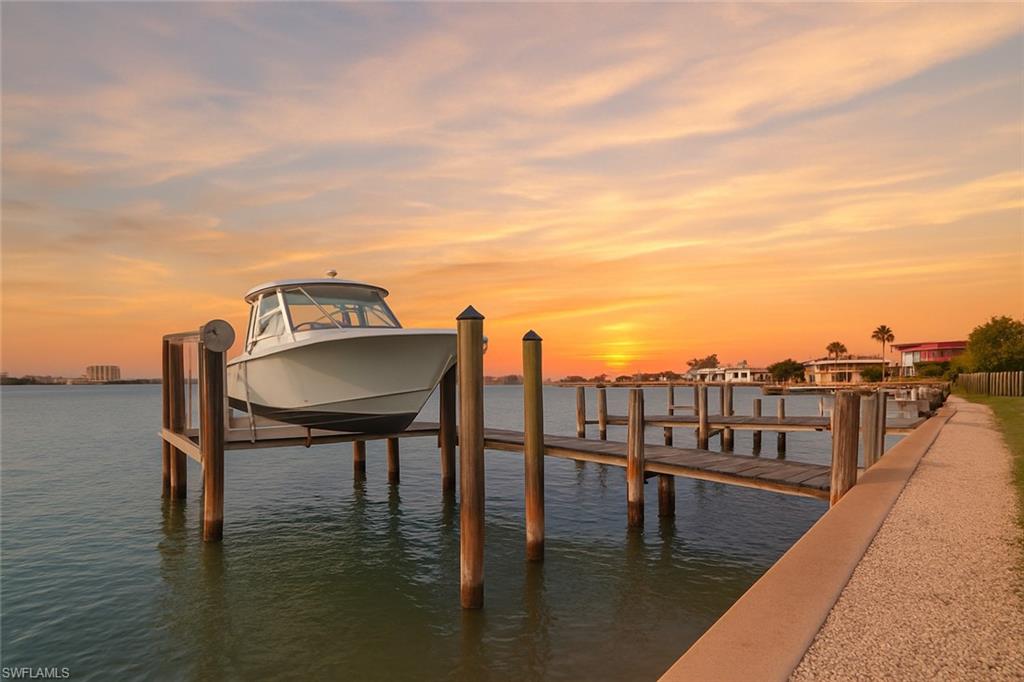 Rare Bayfront Opportunity in Royal Harbor – Lowest Priced Direct Bayfront Property on Naples Bay. Perfectly positioned with coveted western exposures, this home offers some of the best sunsets in all of Naples and a front-row seat to the annual 4th of July fireworks—right from your own backyard. Boaters will love the quick, no-bridge access to the Gulf of Mexico, making it effortless to be out on the open water in minutes. Set back from boating traffic in a calm no-wake zone, the dock is naturally shielded from disruptive wakes. With 80 feet of direct water frontage, two boat docks with lifts, and panoramic views across Naples Bay, this is truly a boater’s paradise. Located on Dolphin Lane, a quiet non-through street, the setting provides a peaceful and private atmosphere. Nearly every window frames stunning water views, filling the home with natural light and constant reminders of the remarkable location. Built of solid concrete block construction and perched at a higher elevation than neighboring properties, the residence has remained untouched by recent hurricanes, offering both durability and peace of mind. Whether you choose to renovate the existing home or design a custom-built masterpiece, this property provides an exceptional foundation for your vision. Royal Harbor is one of Naples’ most prestigious boating communities, just minutes from the world-class dining, shopping, and entertainment of 5th Avenue South and 3rd Street South—as well as the city’s pristine white sand beaches. Don’t miss this rare opportunity to own a panoramic Naples Bay view at an unmatched value.