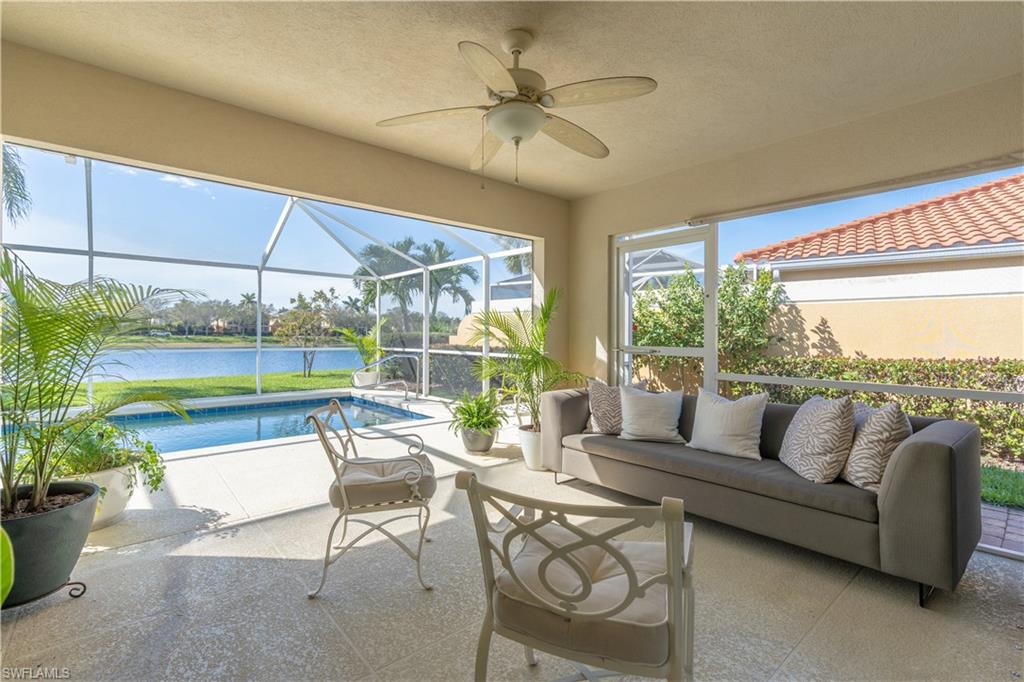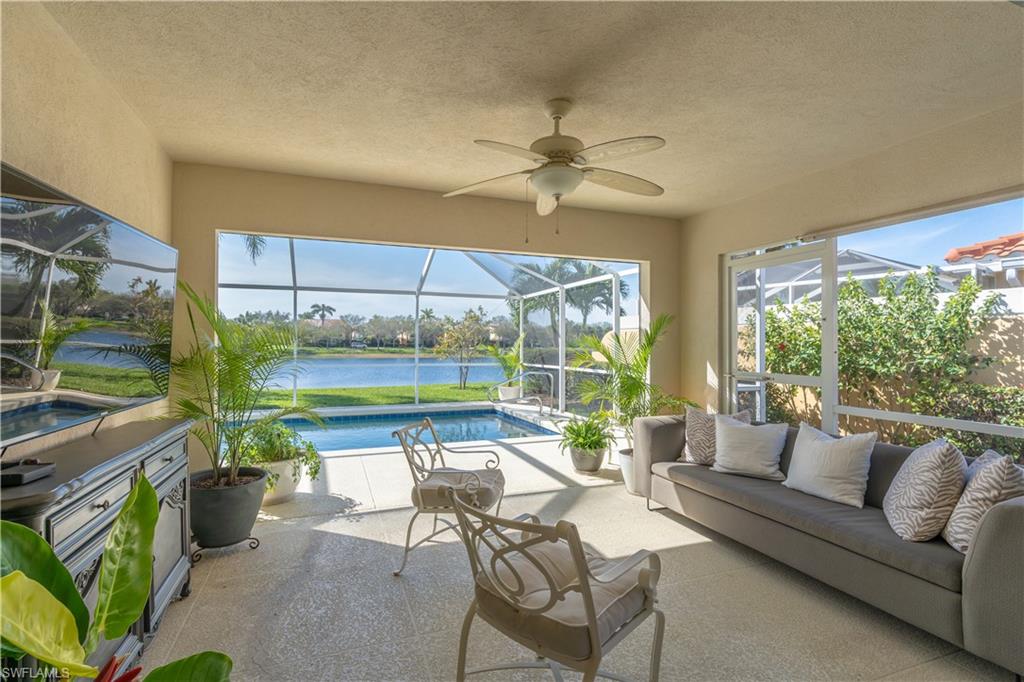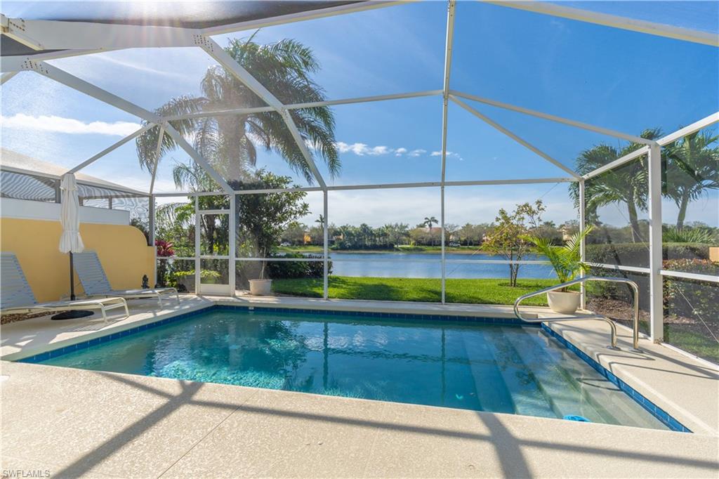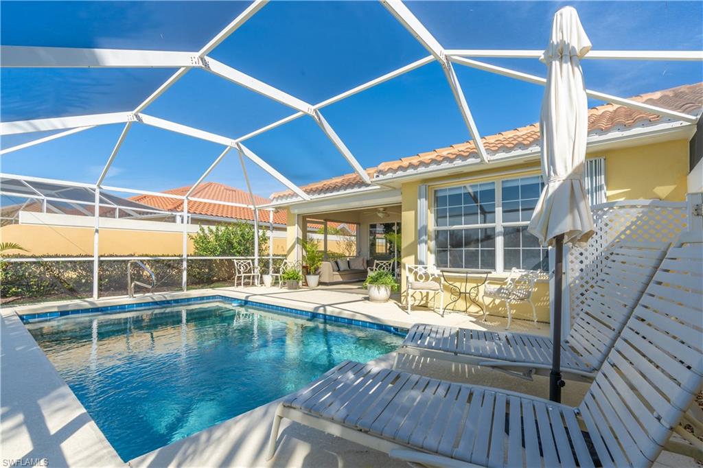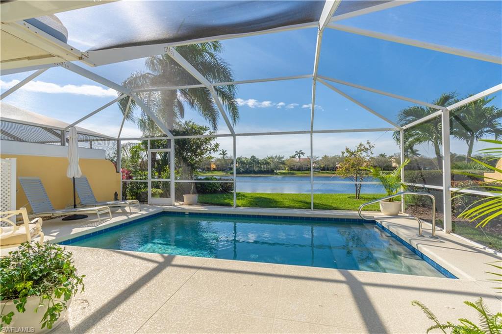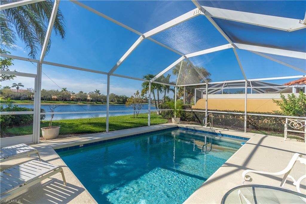 THIS HOME IS READY TO GO. This two bedrooms with den/two bath attached Capri villa in the gated community of VeronaWalk, is being offered partially furnished, making move in easy. Replacements include a new roof, A/C unit and hot water heater, so major mechanicals have been addressed. This original DiVosta built, poured concrete home has vaulted ceilings and tile in the main living area. Plank flooring has been installed in the bedrooms. A split floorplan has the bedrooms located on opposite sides of the home, with each having their own walk-in closet and full bath. The centrally located white kitchen has additional upgrades, such as, stainless appliances, tile backsplash, several glass cabinet doors for display and bead board beneath the spacious counters. Your covered lanai opens onto a screen enclosed patio with an inviting rectangular pool. From here, enjoy a wide water view and the abundant birds that visit. You are always storm ready with accordion and electric shutters. This well maintained home can be your Naples relaxing retreat away from it all. *Chandelier will not be included in sale