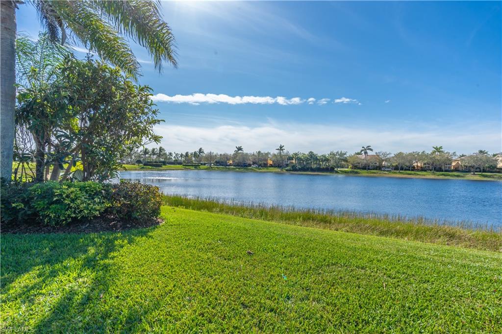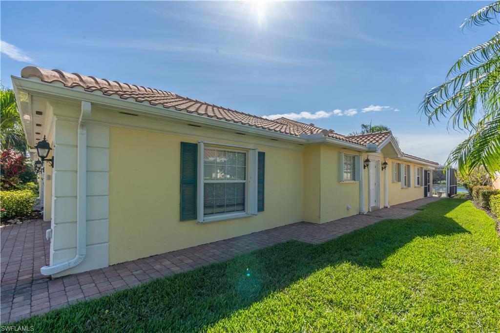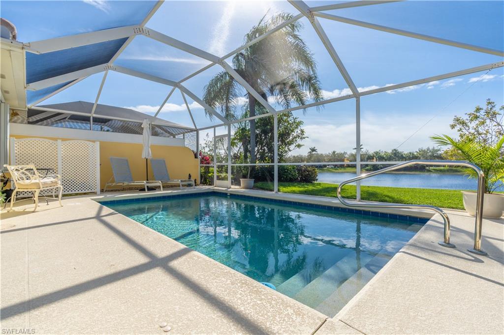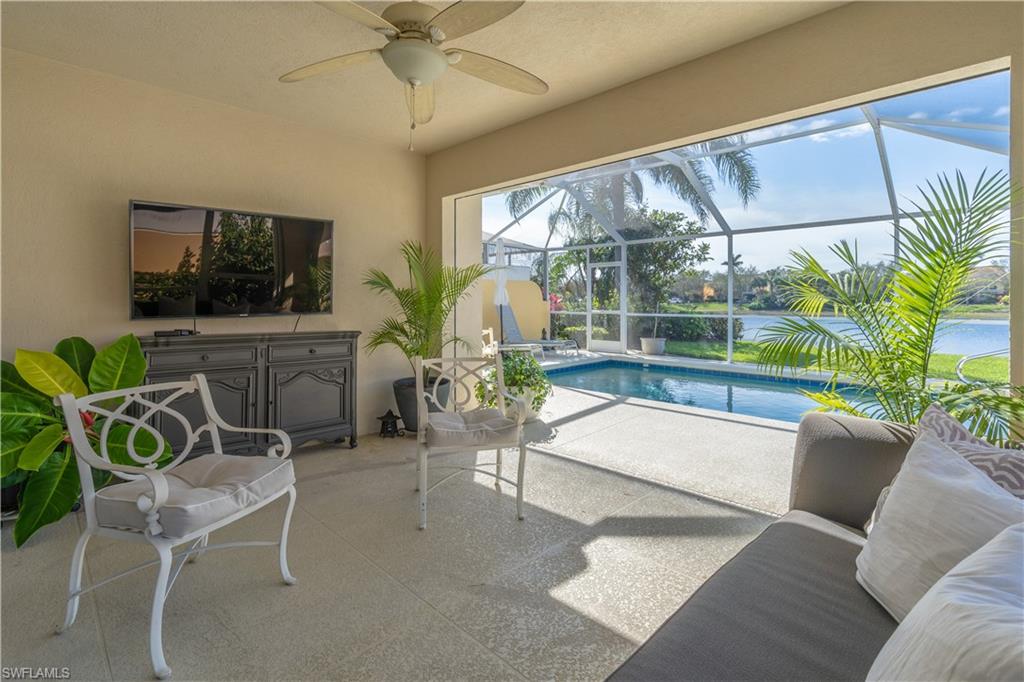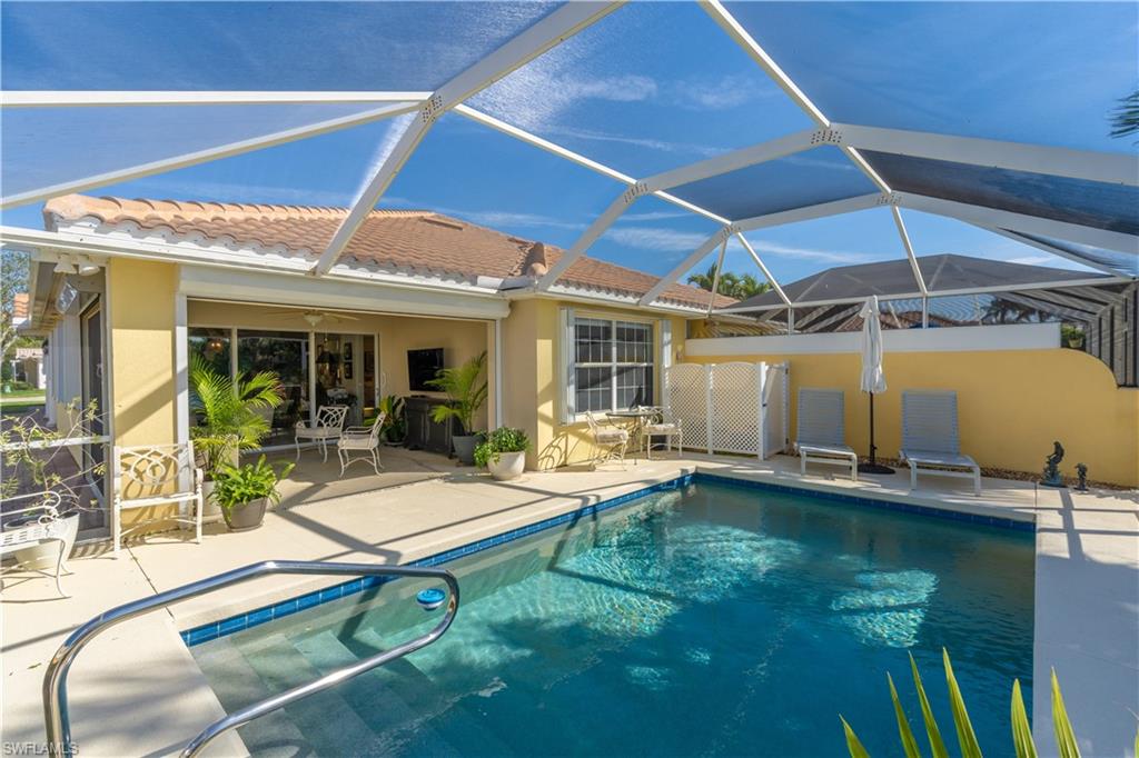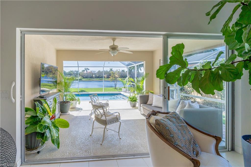 THIS HOME IS READY TO GO. This two bedrooms with den/two bath attached Capri villa in the gated community of VeronaWalk, is being offered partially furnished, making move in easy. Replacements include a new roof, A/C unit and hot water heater, so major mechanicals have been addressed. This original DiVosta built, poured concrete home has vaulted ceilings and tile in the main living area. Plank flooring has been installed in the bedrooms. A split floorplan has the bedrooms located on opposite sides of the home, with each having their own walk-in closet and full bath. The centrally located white kitchen has additional upgrades, such as, stainless appliances, tile backsplash, several glass cabinet doors for display and bead board beneath the spacious counters. Your covered lanai opens onto a screen enclosed patio with an inviting rectangular pool. From here, enjoy a wide water view and the abundant birds that visit. You are always storm ready with accordion and electric shutters. This well maintained home can be your Naples relaxing retreat away from it all. *Chandelier will not be included in sale