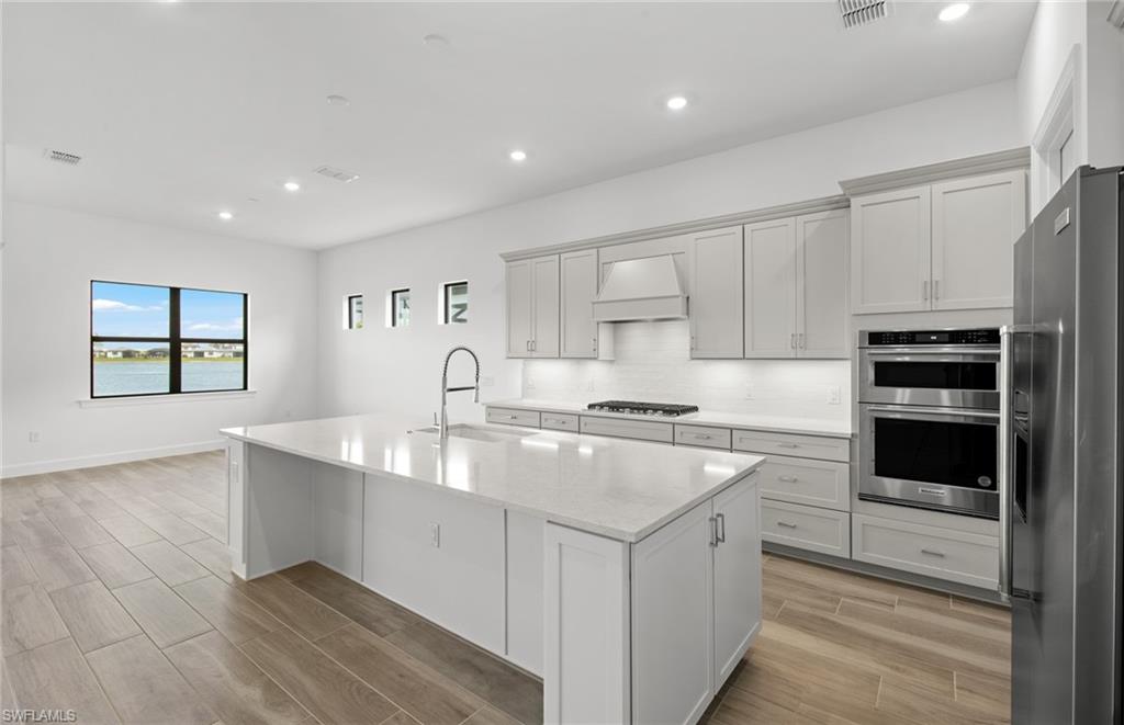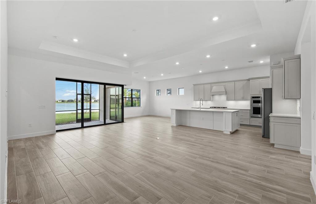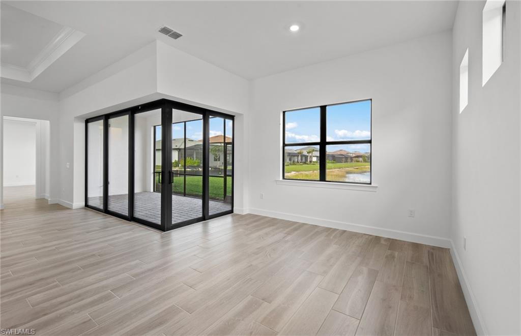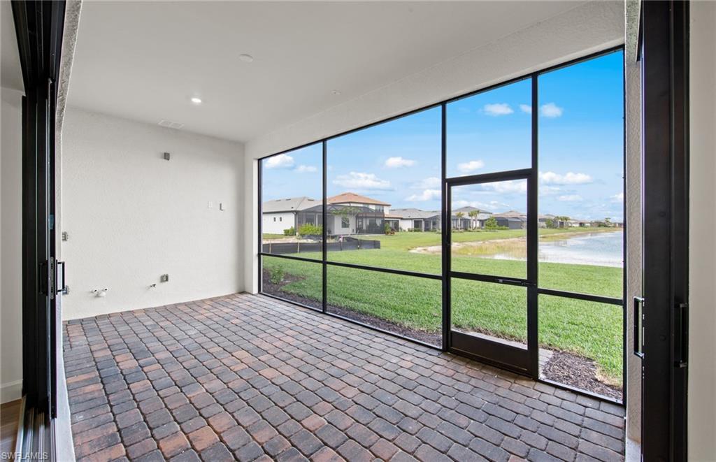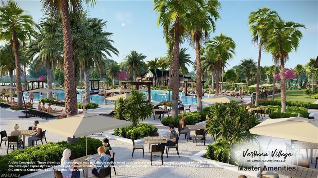 New construction Stellar plan AVAILABLE NOW at Verdana Village! The Stellar offers an efficient single-story, effortless lay out, providing comfortable daily living. This Stellar home has beautiful water views, and comes with a covered lanai area equiped with outdoor kitchen pre-plumbing setup, perfect for entertaining and enjoying the Florida sunsets! Room for pool to be added after closing! With just over 2,500 sqft of indoor living space, this 3 bedroom+den, 3 baths, 3-car garage beauty provides ample space for all occupants and guests. The kitchen is open to the cafe and gathering room, featuring a large center island, built-in appliance package with combo oven, extra storage, level four quartz countertops, level five cabinets with a beautiful cabinet style hood, stylish backsplash, walk-in pantry, and more! The details continue into the gathering room, with tray ceiling as well as a zero-corner sliding glass door leading onto the covered lanai, seamlessly connecting indoor and outdoor living. Guests will be impressed! The flex room is enclosed with dropped soffit, perfect for guests in town, a home office, school room, or gym. Your dream lifestyle awaits within the gates at Verdana Village, a premier Estero location with quick access to the best things that Southwest Florida has to offer. Here you will find an array of resort-style amenities right outside your front door including indoor and outdoor pickleball, indoor and outdoor tennis, indoor basketball court, bocceball, stunning resort style pool, fitness center, movement studio, dog park, cafe, & so much more on the horizon! Opportunities are endless at Verdana Village.