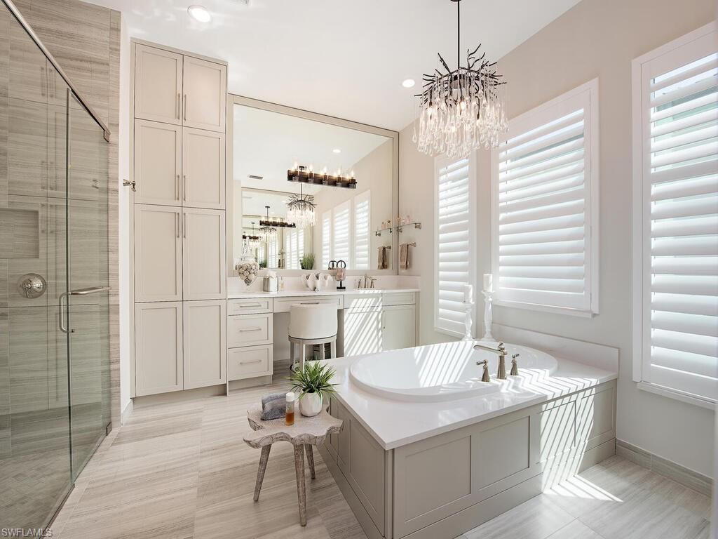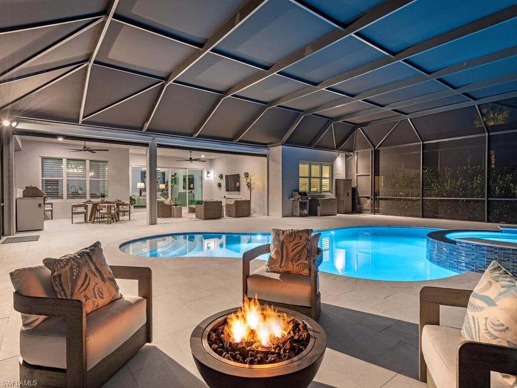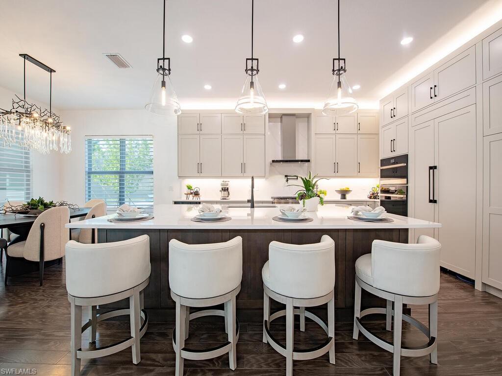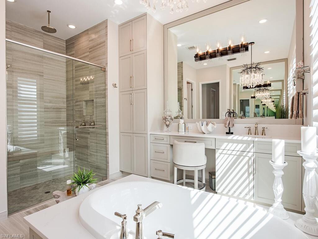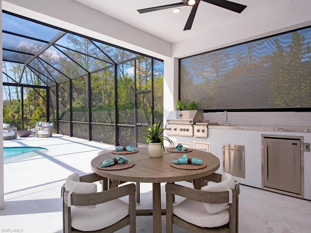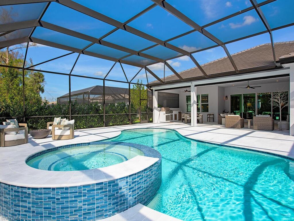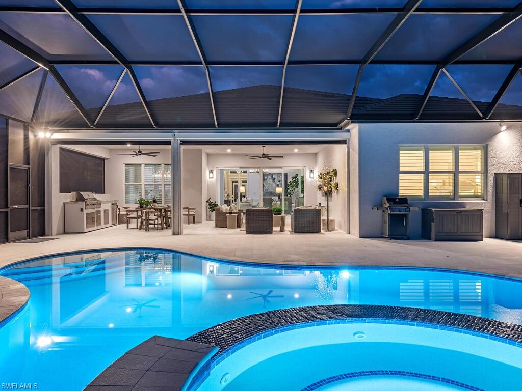 Introducing an unparalleled opportunity to experience luxury living in one of the most coveted homes within Valencia Trails. This meticulously curated & customized Sunrise floor plan offers an exceptional living experience with top-tier finishes that go beyond the builder level with flooring, kitchen & primary bath installed after closing. The open living space seamlessly blends magnificent interiors with the splendor of outdoor Florida living. The main living area flows effortlessly onto a sprawling, covered lanai. The outdoor space is a true masterpiece, featuring exquisite Akoya marble tile pavers, a sparkling free-form pool, and a spa – encased within a panoramic screen offering a tranquil preserve view with a lovely lake in the distance. For ultimate outdoor indulgence, a fully equipped summer kitchen awaits, ensuring that al fresco dining is always at your fingertips. As you enter through the sleek glass & metal front door, you are greeted by a grand foyer illuminated by dramatic lighting. The expansive living area is enhanced by an entertainer's dream kitchen, equipped with custom cabinetry, stunning quartz countertops/backsplash, and Jenn-Air appliances – including a paneled refrigerator/freezer, 6-burner gas cooktop, vented hood, wall oven, microwave & wine cooler. The oversized island offers additional storage & serves as the perfect gathering spot. The kitchen is completed by a Blanco granite composite sink, pendant & ambient lighting, and a pot filler. The master suite is an indulgent retreat, offering a spa-like bath with a frameless glass-enclosed rainfall shower, an oval soaking tub, and custom cabinetry. Each guest bath is its own sanctuary, featuring quartz countertops, walk-in showers with tile extending to the ceiling, upgraded cabinetry & designer fixtures. Additionally, this home is outfitted with Shaw hardwood flooring, plantation shutters, silhouette shades, custom closets throughout, millwork, fresh paint, a Culligan water softener & solid core doors. Hurricane impact windows & doors, along with electric hurricane-rated screens on the lanai ensure complete peace of mind. The laundry room features custom cabinetry, a sink, and GE Power Steam washer & dryer. The finished garage offers polyurea flooring, storage cabinetry, an extra fridge & insulated ceiling. There is also a 6’x10’ fenced dog run and lush, tropical landscaping surrounds this incredible home. Valencia Trails is more than just a community; it's a lifestyle. This exclusive 55+ community boasts world-class amenities, including a 43,000 square-foot clubhouse with a gourmet restaurant, poolside bar, and resort-style pools. Whether you enjoy tennis, pickleball, bocce, or more tranquil activities like yoga or art classes, Valencia Trails has it all. Additional features include a fitness center, sports lounge, card rooms, cooking studio, spa, dog park & a vibrant calendar of events so every day feels like a vacation. This is your invitation to live life luxuriously.