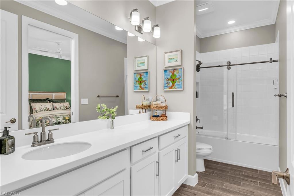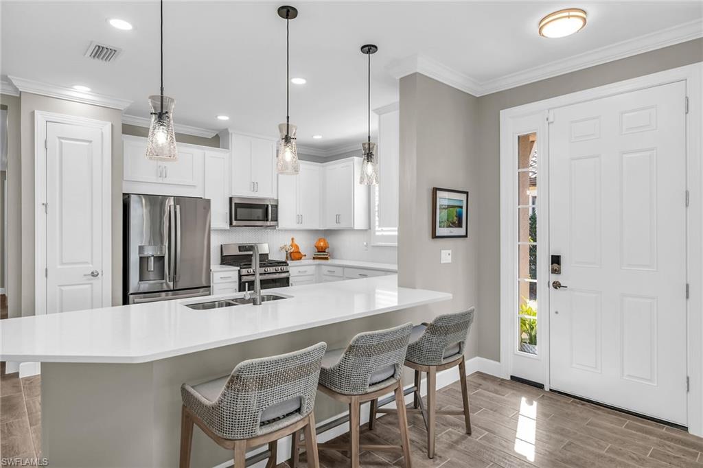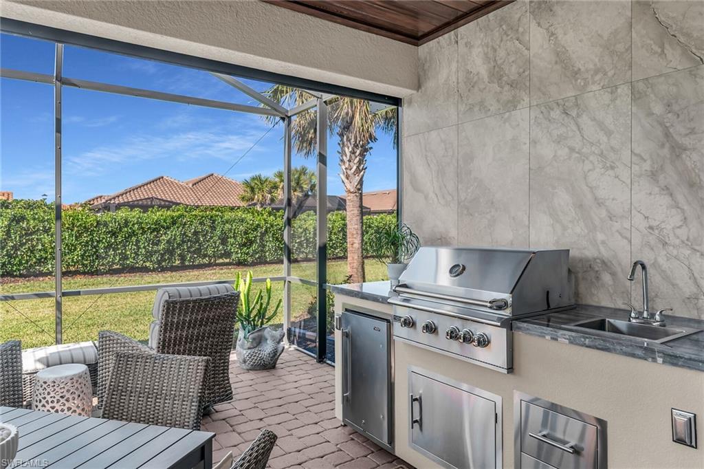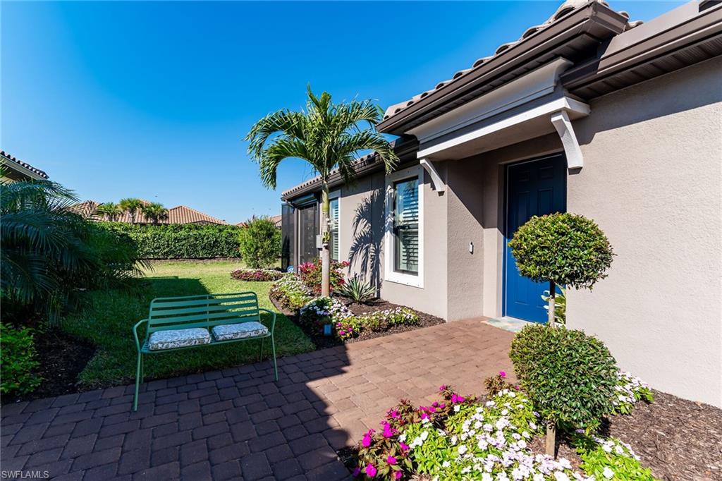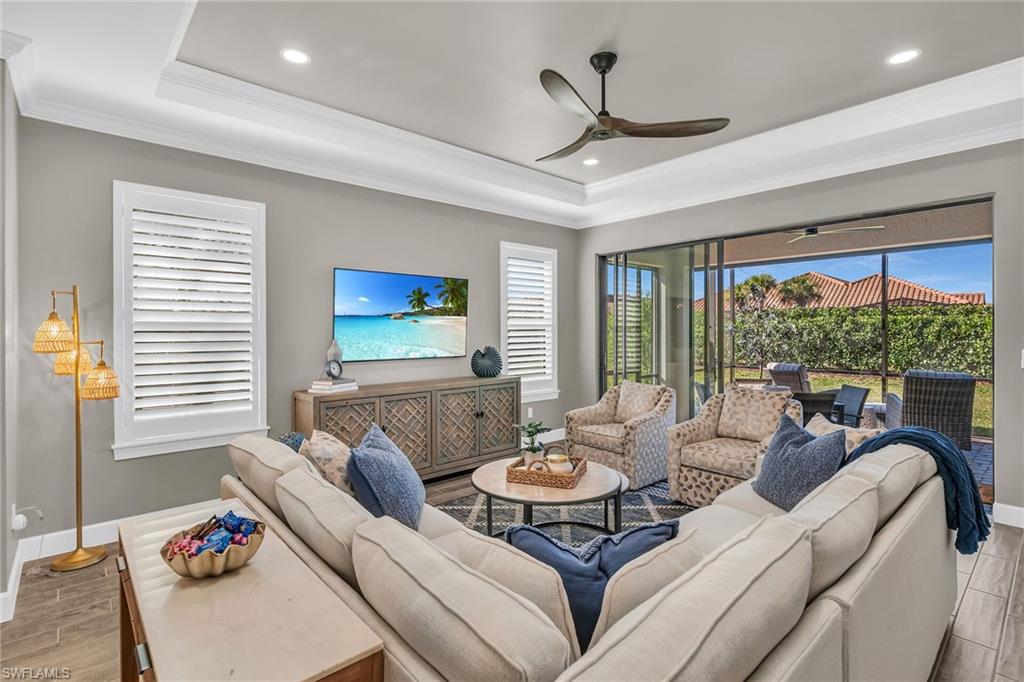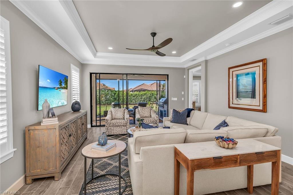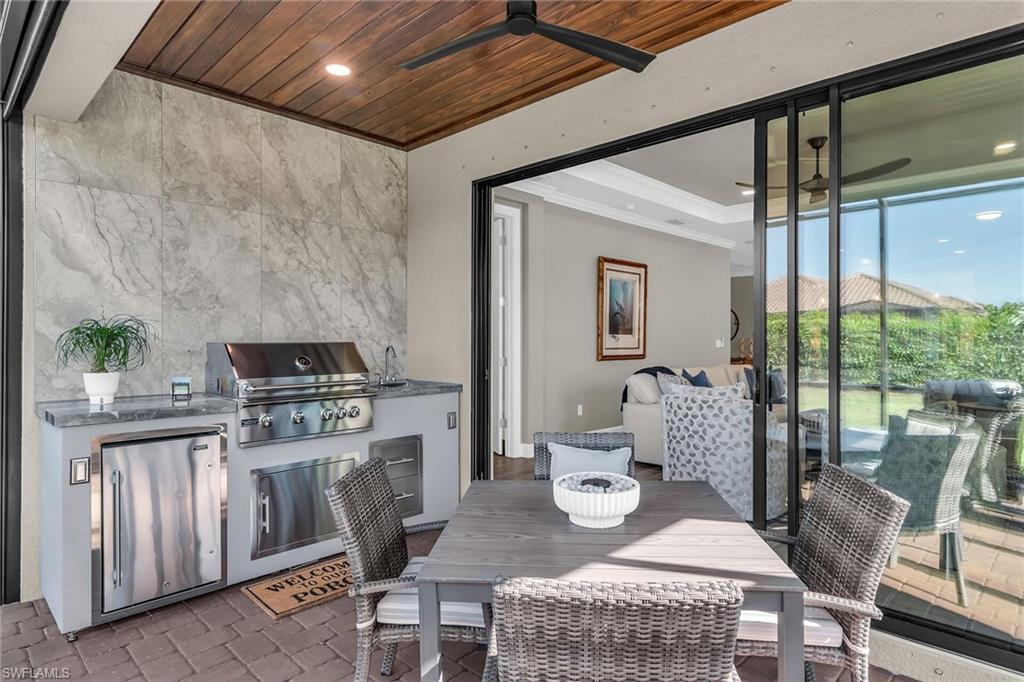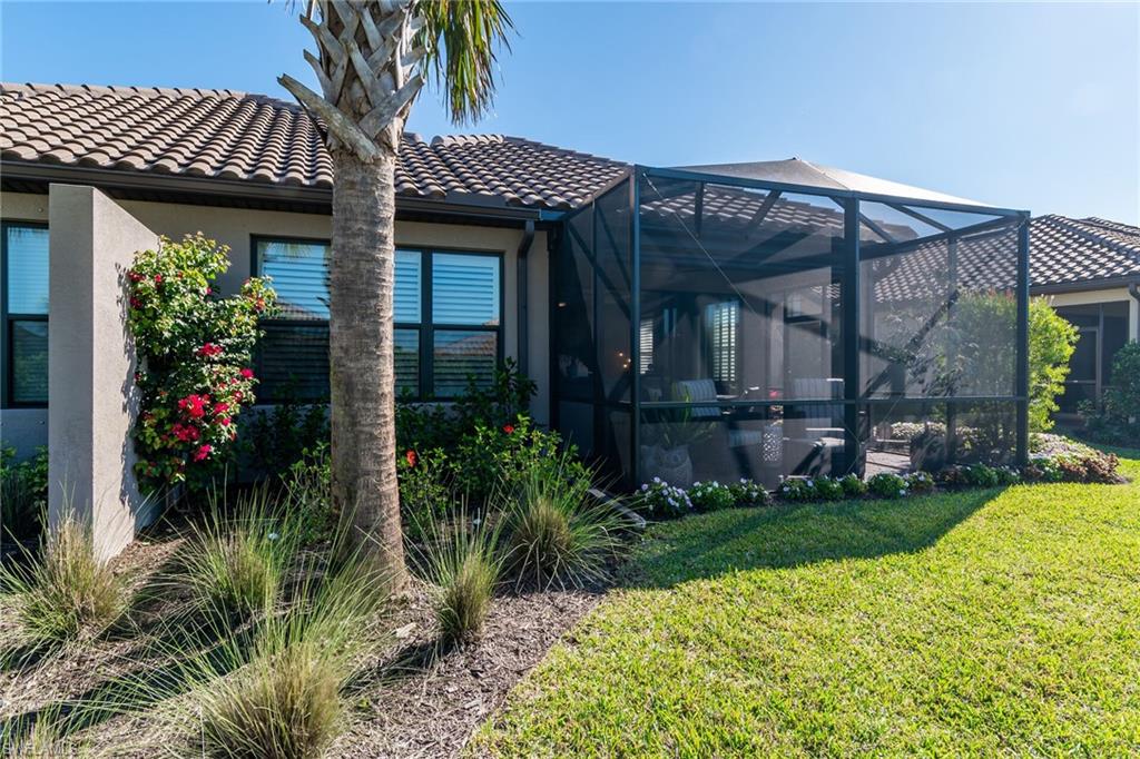 PRISTINE & BEAUTIFULLY FURNISHED, 3-bedroom plus office villa, where luxury meets comfort in every detail. LOCATED in the heart of the community. This beautifully appointed home boasts custom finishes throughout, including recessed LED lighting, crown molding, and exquisite decorative trim work. The open concept design flows seamlessly from room to room, with tile floors throughout and plantation shutters that add elegance and privacy. The heart of the home is the stunning outdoor kitchen, complete with a wood ceiling and a beautifully tiled wall, perfect for entertaining. The extended screened lanai invites you to relax and enjoy the Florida weather, while the newly landscaped front lawn and solar outdoor lighting enhance the home’s curb appeal. Inside, you'll find spacious, custom closets, upgraded lighting and fans, and a finished garage with a sealed floor. The air-conditioned garage features custom cabinets, and the laundry room includes beautiful cabinetry for added storage. For added peace of mind, this home comes with a whole-house Generac generator and hurricane screen shutters. Tech-savvy features include a Ring front doorbell camera, five mounted TVs, and under-counter LED lighting in the kitchen and bathrooms. The built-in safe provides a secure space for valuables, while the dimmer switches throughout the home offer customizable lighting for any mood.This villa is not only beautifully furnished but also thoughtfully designed for convenience and security, with automatic outside security lights on a timer, and it is located outside of a flood zone. Lastly, elevate your everyday living at the luxurious clubhouse, where every amenity is designed for relaxation and recreation. Unwind at the full-service spa, stay active in the state-of-the-art fitness center, or sip your favorite cocktail at the tiki bar while soaking in the breathtaking views. For those who enjoy an active lifestyle, indulge in the infinity pool or take your game to the next level with pickleball, bocce ball, and tennis courts right at your doorstep. This stunning villa, paired with world-class amenities, is the ultimate in upscale living.