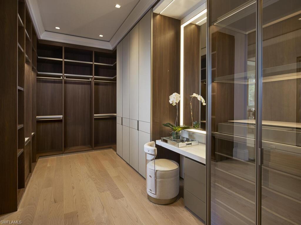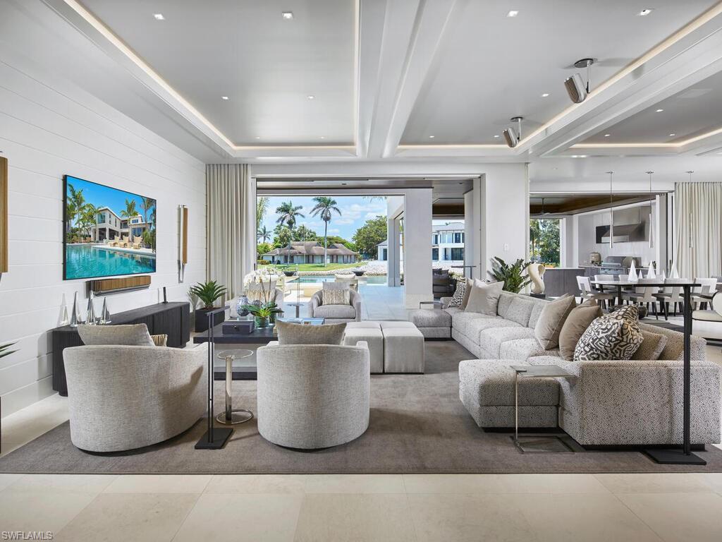 London Bay redefines luxury and encapsulates the essence of Naples’ exclusive Port Royal lifestyle in this stunning waterfront estate, which boasts 107 feet of Hidden Bay shoreline and direct access to the Gulf of Mexico. The estate’s architecture, designed by the acclaimed Kukk Architecture & Design, makes a bold statement and includes all the necessary amenities for stylish entertaining. Interior design, furnishings, finishes, and custom selections by Romanza Interior Design create a unique palette that balances elegance and effortless living. The soft contemporary aesthetic features limestone floors in the main living areas and pewter white oak wood flooring in the primary suite, study, and throughout the second floor. The open floor plan captivates with expansive living spaces, all offering beautiful bay views. Pocketing Weiland lift-and-slide doors seamlessly extend the spacious great room, kitchen, and dining area to both covered and open-air alfresco living spaces with uninterrupted flush flooring. The kitchen is tailored with Poliform cabinetry and an oversized island, a Galley workstation sink, and a built-in table for casual dining. The elegant primary suite includes an impressive gallery and a boutique-style oversized Poliform walk-in closet with custom Casali doors. Featuring luxurious dual baths connected by a shared shower, this light-filled suite boasts walls and ceilings adorned with Venetian plaster and floor-to-ceiling glass leads to a tranquil outdoor retreat. The second floor offers a VIP suite and three spacious en-suite guest rooms, as well as a dedicated exercise studio and a second laundry room that encircle a well-appointed loft. The loft features a morning kitchen and sliding glass doors that open to a bay-facing balcony. The covered lanai provides outdoor living, dining, and a large well-equipped kitchen for entertaining. Water cascades from the raised spa into the infinity edge pool’s sun shelf, which is connected by stepping stones leading to a sunning deck and a secluded lounge with a fire table. The estate also includes the conveniences of an air-conditioned three-car garage, elevator, and a generator. Eligible for Port Royal membership.