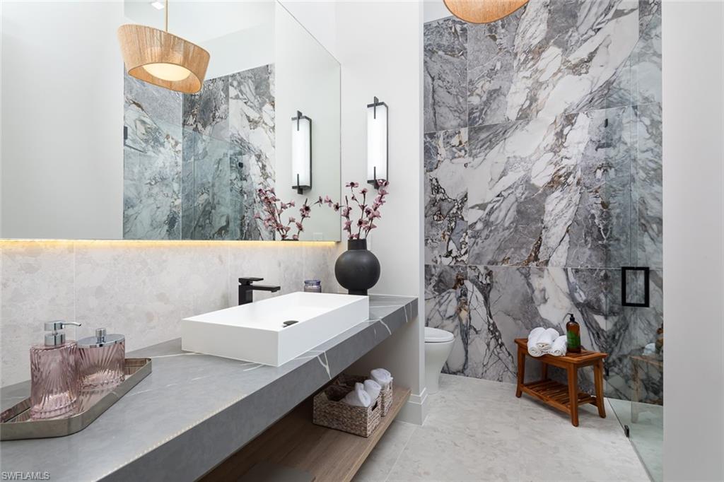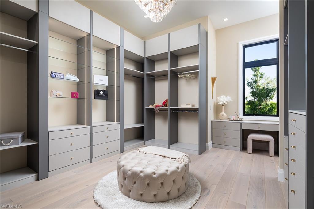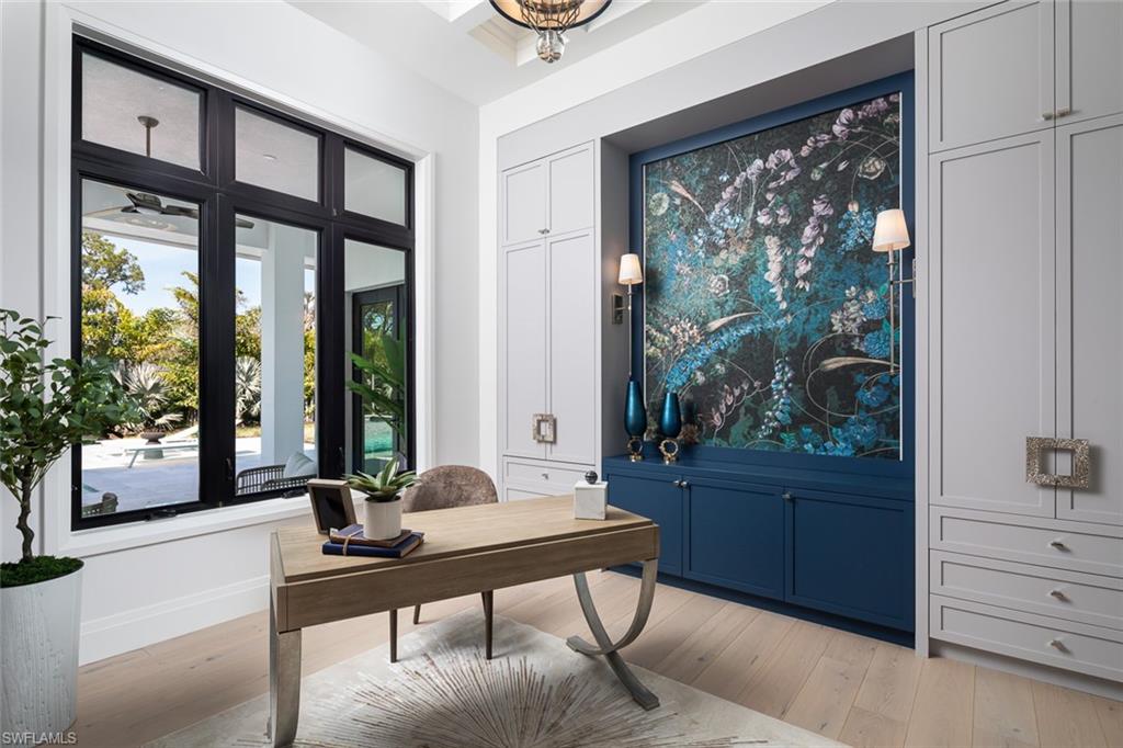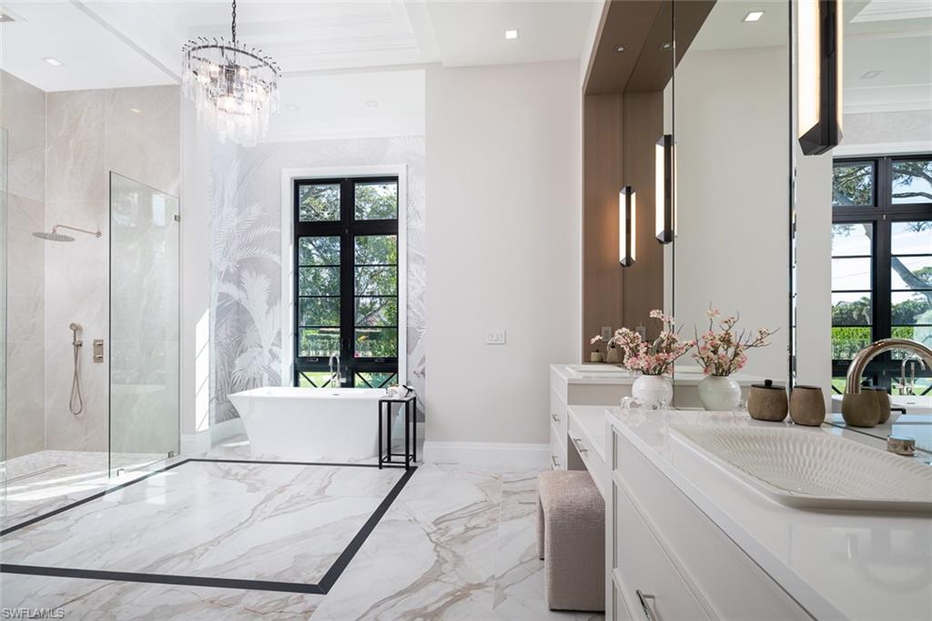 Discover a new standard of sophistication at 445 West Street, an exceptional custom-built residence that redefines the art of living in the heart of Naples. Nestled on a pristine 1.2-acre corner lot, this brand-new estate offers unparalleled privacy, seamlessly blending meticulous craftsmanship with timeless elegance. Upon arrival, you are greeted by meticulously landscaped grounds and a fully fenced perimeter, setting the stage for the architectural brilliance within. This 5-bedroom, 5-full-bath, and 1-half-bath residence is designed with the utmost attention to detail, incorporating a versatile den, a flex room, and expansive living spaces to meet every modern need. The home’s open-concept layout boasts exquisite finishes, from intricate coffered ceilings and mosaic tile accents to rich white oak wood floors and custom cabinetry. Chic light fixtures and hardware further elevate the space, creating an atmosphere of elegance at every turn. As you step into the grand foyer, your eyes are immediately drawn to breathtaking views of the saltwater pool, spa, and fountain, offering a serene and inviting backdrop. To the right, the primary suite is a true retreat, offering a spa-like bath, oversized closets, and a private office for moments of inspiration and productivity. To the left of the foyer, the great room elegantly combines the living, dining, and kitchen areas – a space designed for both grand entertaining and intimate gatherings. The gourmet kitchen is a culinary dream, featuring top-tier appliances, a gas range, and stunning Cambria quartz countertops. Custom cabinetry, a walk-in butler’s pantry, and a striking backsplash add both form and function. The adjacent dining area, with its floor-to-ceiling wine display, invites guests to indulge in fine dining while taking in the views. A sun-drenched breakfast nook overlooks the lanai, where the indoor-outdoor flow is seamless. Step outside into the expansive outdoor living area, designed for entertaining with a fully equipped summer kitchen. Positioned to capture the stunning western exposure, this private oasis offers panoramic views of Naples’ celebrated sunsets. For ultimate relaxation, the property features a sauna adjacent to the pool bath, providing a sanctuary to unwind and recharge. Surrounded by lush greenery, this residence offers the rare combination of privacy, tranquility, and the convenience of being moments from all the luxury Naples has to offer. At 445 West Street, the ultimate blend of unparalleled luxury, timeless design, and natural beauty awaits you.