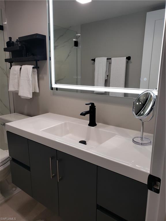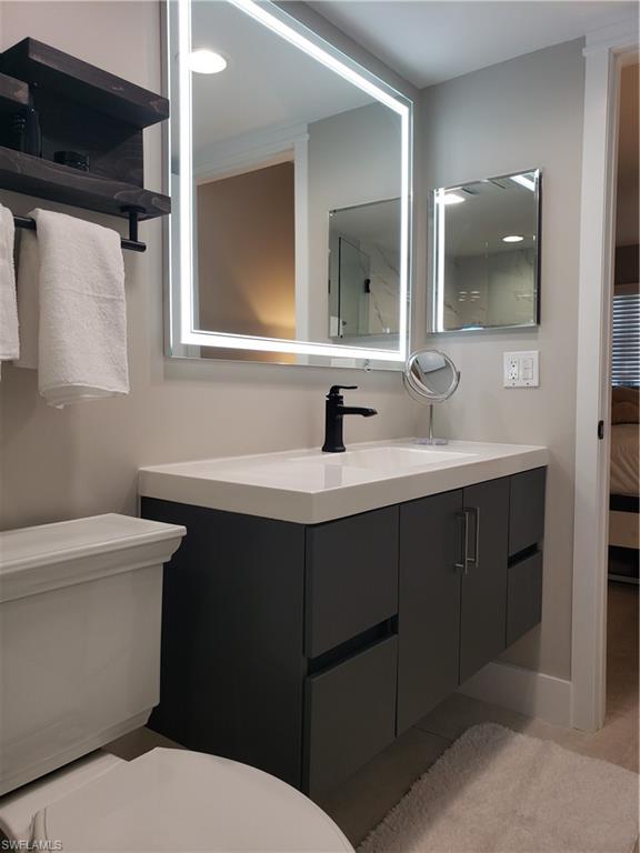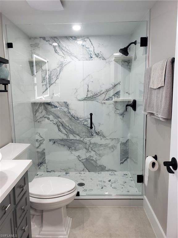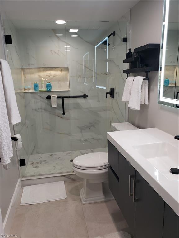 High End custom designed full remodel. This condo has every inch of it remodeled and nicely appointed extras. 2 bedrooms and 2 baths with screened and tiled lanai overlooking water and golf course view. First floor for easy access. Kitchen remodeled with white shaker cabinets, quartz countertops, stainless-steel appliances and trayed ceiling with enhanced lighting. Pass through window to dining room with quartz countertop. Large master bedroom with large walk in closet and gorgeous remodeled bathroom. Master bath has floating vanity with lighted mirror. Very large wall tile in shower with lighted shampoo niche and custom glass and door. Pocket door encloses a guest suite with large bedroom and beautifully remodeled bathroom. Bathroom has new vanity with vessel sink and lighted mirror. Walk in shower with custom glass door. Large format tile throughout. All woodwork and doors have been upgraded. Large wood baseboards, all doors have custom designed trim and all new shaker style doors throughout. Designer decor and furnishings are negotiable. Laundry. Newer mechanicals. Community Pool. Close to downtown Naples beaches, shopping and many restaurants. A public golf course is next door. Perfect location to get away and enjoy our beautiful Florida sunshine. This is a 55+ community.