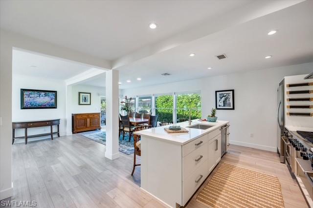 This charming water-direct 3 bed 2 bath home has been completely remodeled and offers a fantastic chance for you to create your dream living space. Situated on a spacious lot in a serene neighborhood, this property has plenty of room for a pool or the potential to build your dream home. The possibilities are truly endless with this property, allowing you to tailor it to your unique preferences and lifestyle As you step inside the home, you will be greeted by an open floor plan that is ideal for hosting gatherings with family and friends. The home is tastefully furnished with elegant Tommy Bahama furniture, adding a touch of sophistication to the living space. The kitchen is a chef's delight, featuring two Viking convection ovens, a full-size stand-up freezer, and a Thermador gas range complemented by exquisite quartz countertops, creating a hub for culinary exploration and creativity. Both bathrooms have been updated to include modern and stylish renovations ensuring comfort and luxury. Additionally, the home is equipped with hurricane impact windows and plantation shutters, ensuring your safety and providing peace of mind. Outside, you can look forward to peaceful evenings in tranquil surroundings, as you enjoy direct access to the Gulf right from your doorstep! Don’t let this opportunity slip away…