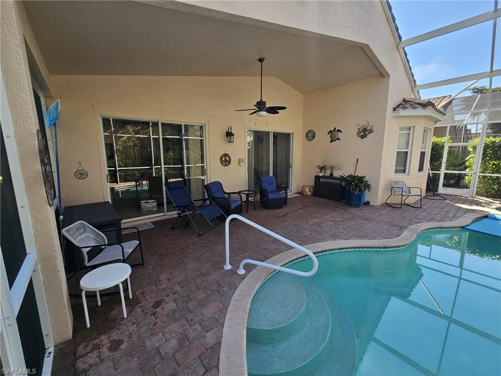 Looking for a Beautiful Home with a Private Pool and Jacuzzi in a 55+ gated community? This Cascades home offers resort-style amenities: Tennis, Pickleball, Bocce, a Clubhouse with indoor/outdoor pools, jacuzzi, fitness center, sauna, pottery, billiards, exercise classes & an active community social calendar. This home offers 10ft ceilings with 8ft doors, 2 bedrooms plus a den, laundry room, spacious great room with formal dining area, upgraded kitchen cabinets, granite countertops and tile backsplash, large master bedroom, walk in closets. His/hers sinks with a separate tub and shower in the master bath. Kitchen appliances and the washer and dryer are included. Recent updates: AC in 2016, hot water heater, dishwasher in 2017, refrigerator, range, microwave in 2022, floor tiles in 2023, pool pump & heater in 2024. Cascades at Estero is one of the true vibrant 55+ communities in Southwest Florida for those wanting to live an active adult lifestyle. Minutes from 3 major outdoor shopping malls, countless dining options, public golf courses and more. Just a short drive to sugary white sand beaches of the Gulf. This home also has the most desired St. Kitts floorplan with screened Lanai.