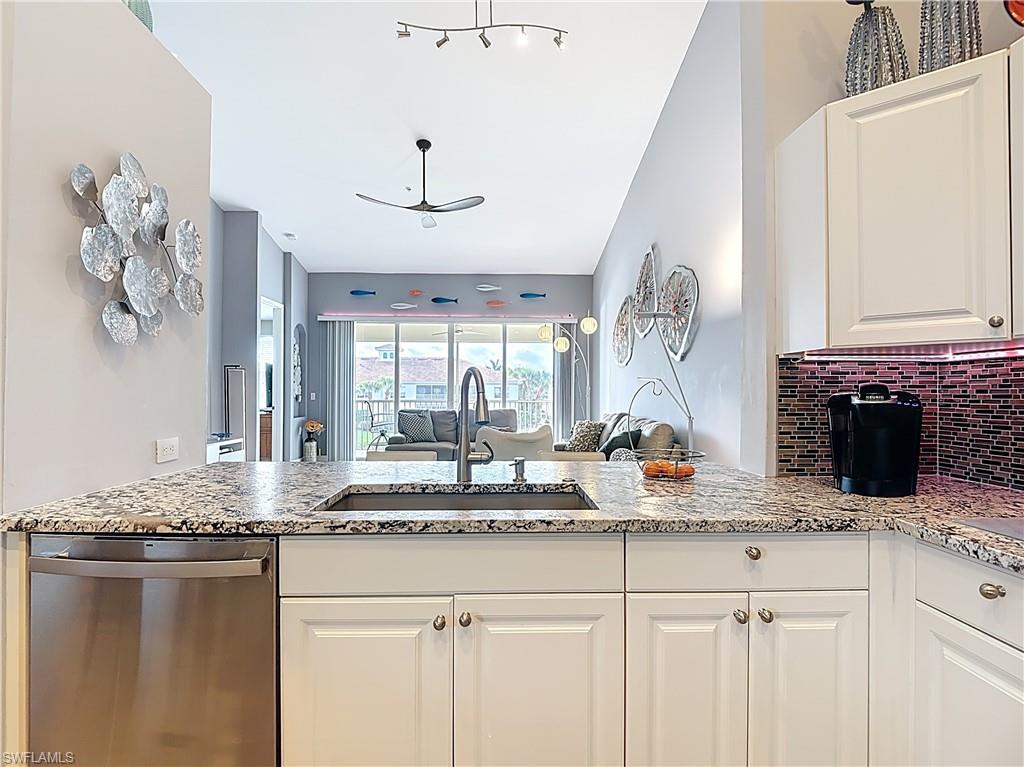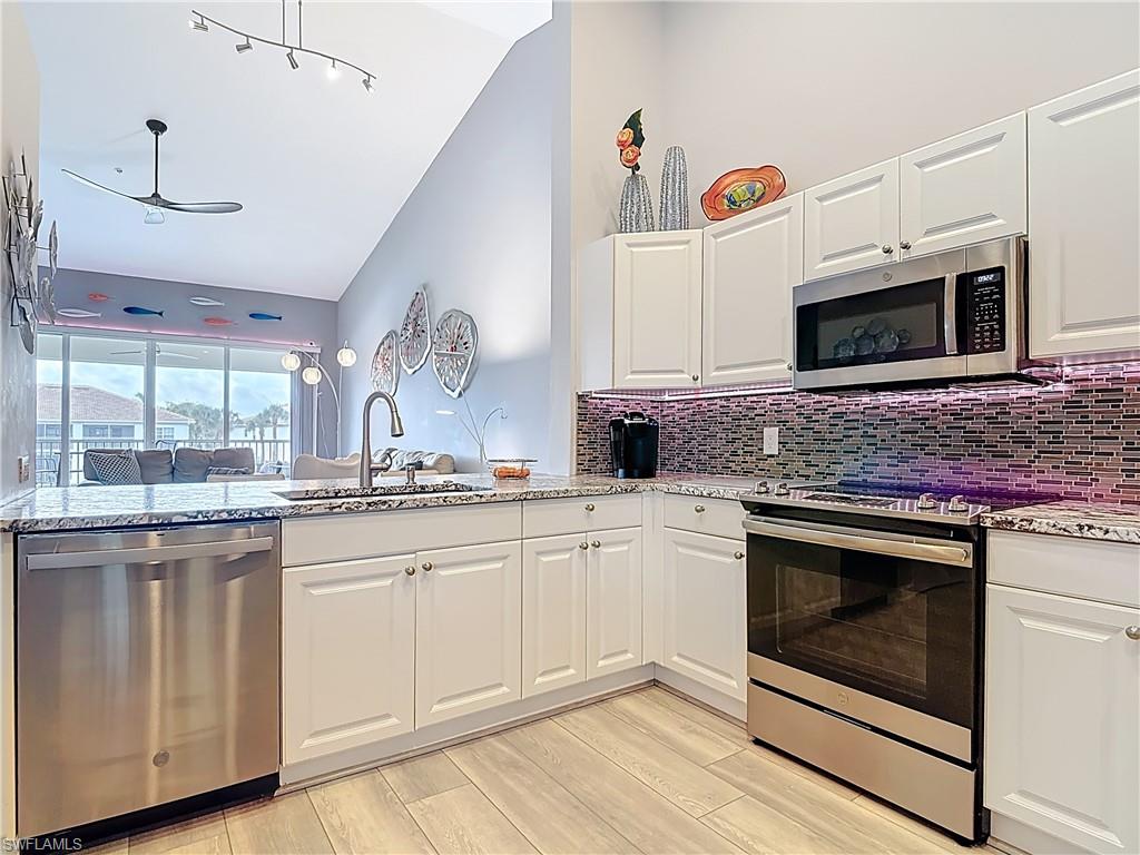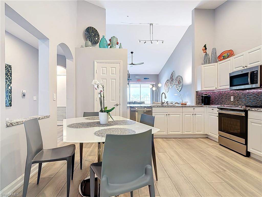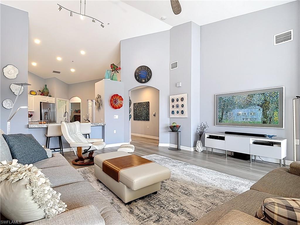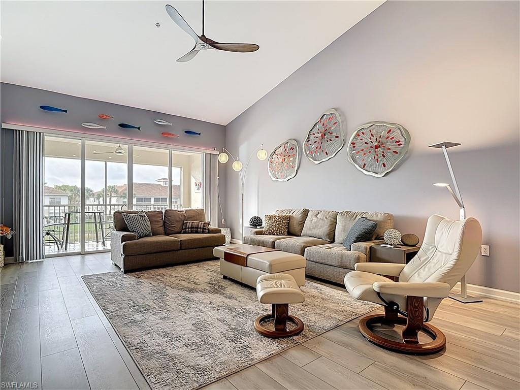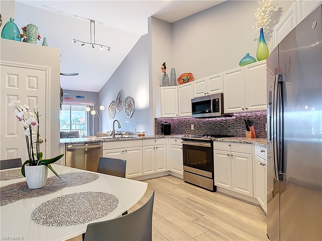 Welcome to this beautifully updated 2nd floor "Carriage" home in the highly sought-after community of Bridgewater Bay! This awesome south-facing condo receives more direct sunlight throughout the day, creating a bright and cheerful living space. With 1818 sq. ft. under air and vaulted cathedral ceilings, this freshly painted home includes 3 full bedrooms and 2 1/2 bathrooms, with updated ceiling fans and Smart Home lighting. This gorgeous home is being offered furnished with some exclusions. Beautifully maintained, the spacious kitchen has been updated with high-end leather granite countertops and a granite composite sink, both resistant to scratches, stains, and heat. The newer GE stainless steel appliances and expandable frosted glass dining set complete a kitchen you'll love to entertain in! You'll find wide, beveled edge Cortec flooring throughout the condo, providing a beautiful and carefree living space. This home is a must see! The master bath has been recently updated with oversize tile, creating an attractive open shower, with gorgeous dual sinks and a beautiful quartz countertop. This spectacular condo is located just steps away from the amenity-rich Bridgewater Bay Clubhouse. The attached one-stall garage is sizeable and provides ample storage space. Bridgewater Bay is a centrally located gated community that is close to the beach, the fine dining of 5th Avenue, and in close proximity to area shopping. The spectacular amenities include a resort style pool, screened-in lap pool, newly updated social room, pickleball, tennis, fitness room, community hot tub, steam room, sauna, and so much more! Residents do enjoy a full calendar of community events each season! Buy this lovely condo today to experience everything this friendly and welcoming community has to offer!