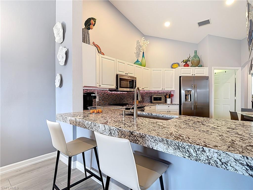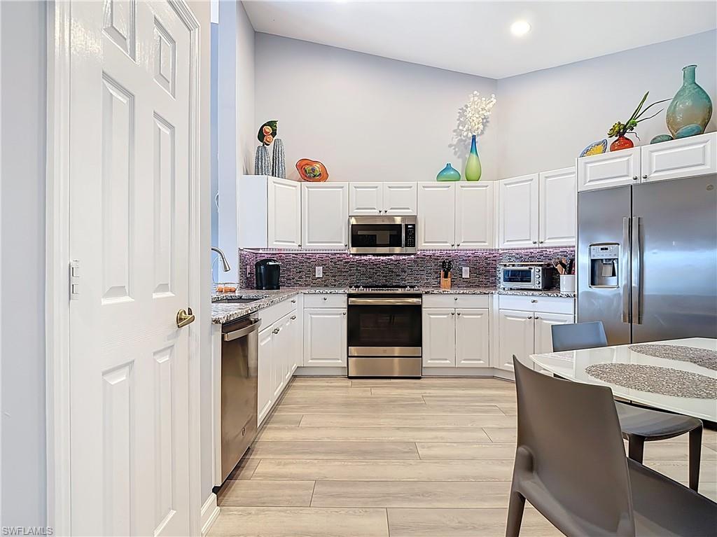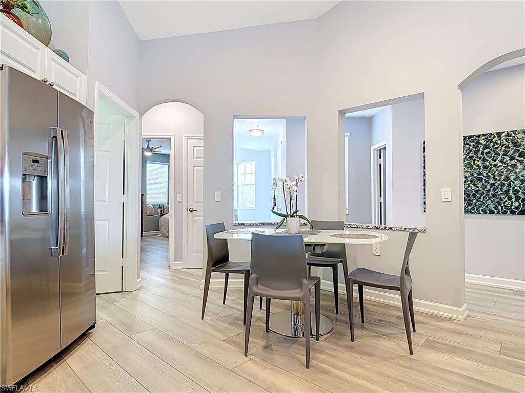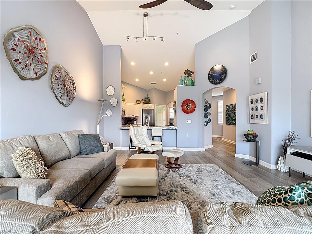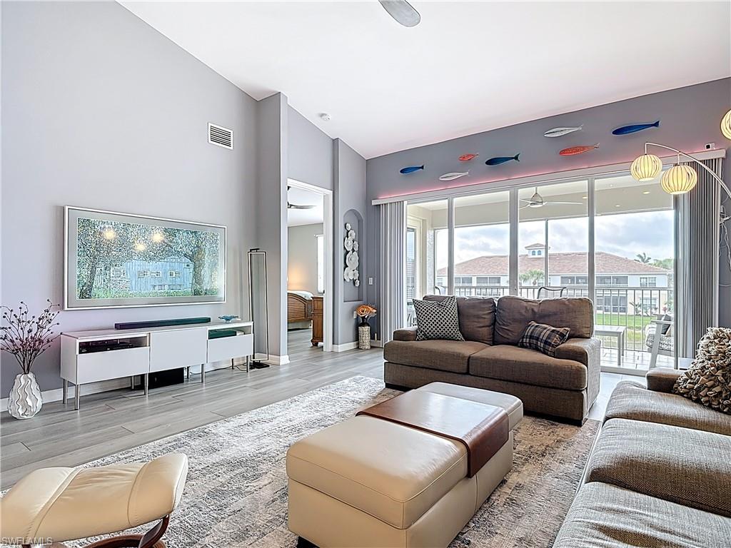 Welcome to this beautifully updated 2nd floor "Carriage" home in the highly sought-after community of Bridgewater Bay! This awesome south-facing condo receives more direct sunlight throughout the day, creating a bright and cheerful living space. With 1818 sq. ft. under air and vaulted cathedral ceilings, this freshly painted home includes 3 full bedrooms and 2 1/2 bathrooms, with updated ceiling fans and Smart Home lighting. This gorgeous home is being offered furnished with some exclusions. Beautifully maintained, the spacious kitchen has been updated with high-end leather granite countertops and a granite composite sink, both resistant to scratches, stains, and heat. The newer GE stainless steel appliances and expandable frosted glass dining set complete a kitchen you'll love to entertain in! You'll find wide, beveled edge Cortec flooring throughout the condo, providing a beautiful and carefree living space. This home is a must see! The master bath has been recently updated with oversize tile, creating an attractive open shower, with gorgeous dual sinks and a beautiful quartz countertop. This spectacular condo is located just steps away from the amenity-rich Bridgewater Bay Clubhouse. The attached one-stall garage is sizeable and provides ample storage space. Bridgewater Bay is a centrally located gated community that is close to the beach, the fine dining of 5th Avenue, and in close proximity to area shopping. The spectacular amenities include a resort style pool, screened-in lap pool, newly updated social room, pickleball, tennis, fitness room, community hot tub, steam room, sauna, and so much more! Residents do enjoy a full calendar of community events each season! Buy this lovely condo today to experience everything this friendly and welcoming community has to offer!