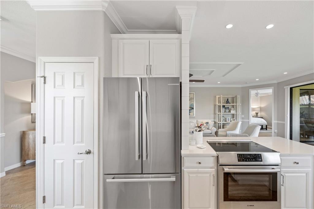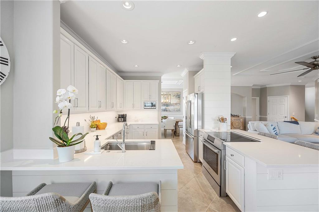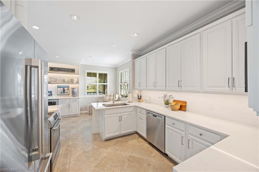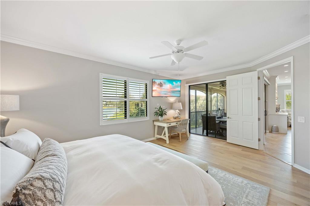 IMMACULATE 2nd floor Coach Home in Treviso Bay – WITH TPC GOLF MEMBERSHIP! This 2,100 square foot property is located DIRECTLY ACROSS from the Di Napoli satellite pool and has been thoroughly upgraded and meticulously cared for. Enjoy the LONG LAKE VIEW (away from 41) from your tranquil, tiled lanai with no-see-um and remote controlled storm screens. SO MANY UPGRADES in this home – including: OPEN KITCHEN where the wall has been removed for an open concept which incorporates the main living area, Bosch appliances, white cabinets with pullouts/tile backsplash/quartz countertops, plantation shutters throughout, no carpet (wood-plank flooring in all 3 spacious bedrooms), custom closets in all bedrooms, many lighting upgrades (recessed and under cabinet), frameless shower door and updated cabinet/countertop in the guest bath, beverage bar with Subzero beverage refrigerator, and epoxy floor in the 2+ car tandem garage. New HVAC - Fall 2024! Treviso Bay features an 18 hole - par 72, Arthur Hills designed, championship golf course. Enormous clubhouse with full-service restaurant/bar, locker & card rooms, social activities room and well-stocked pro shop. Looking for a day away from the golf course? Treviso Bay has unmatched amenities, featuring: on-site spa/salon, fitness center with instructors and daily classes, 8 tennis courts, resort style pool with recently renovated poolside restaurant/tiki bar with daily happy hour specials, bocce, pickleball, and SO MUCH MORE. The 24-hour guarded; gated community is located approximately 5 miles from 5th Ave/downtown Naples which offers world class shopping & dining as well as some of the most spectacular sunsets you will find anywhere in the world. You do not want to miss the opportunity to own this home in paradise. It is truly a MUST SEE!