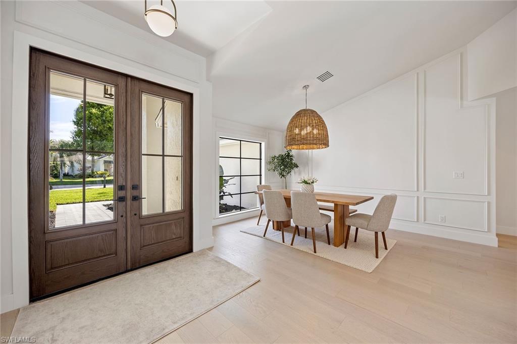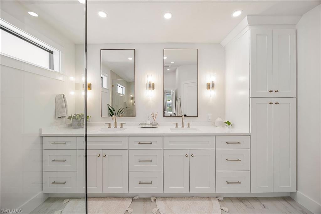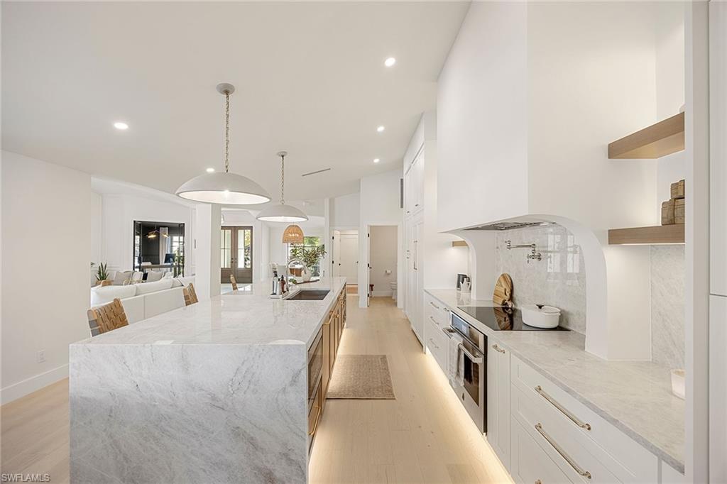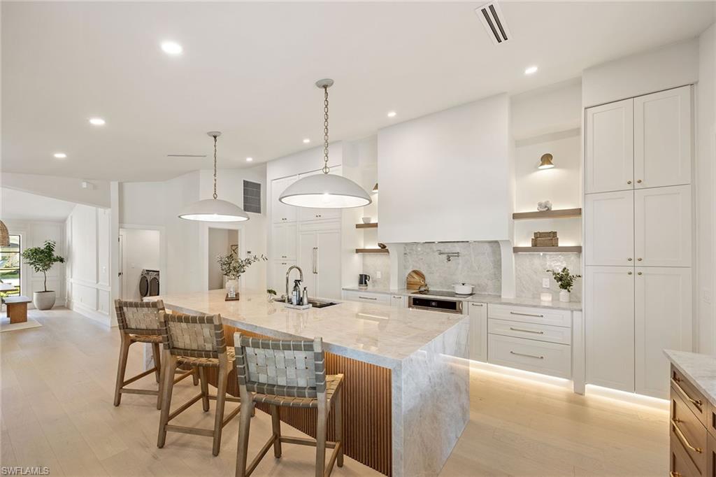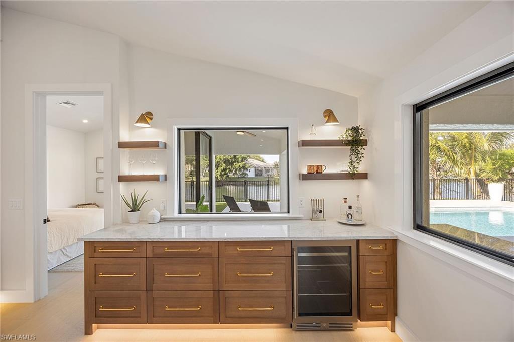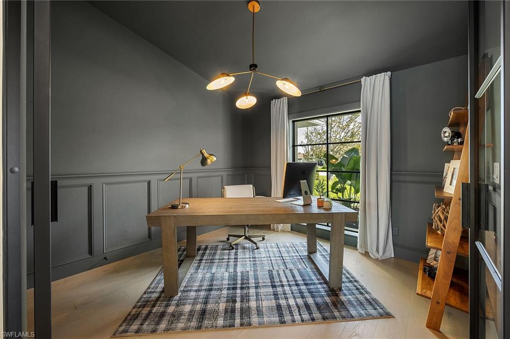 Look no further than this reimagined, redesigned, stunning Monterey residence. This meticulously renovated home boasts four bedrooms plus den/office with three full baths and powder room. Thoughtfully designed, open concept floor plan that flows effortlessly for your comfort and enjoyment. The gourmet kitchen boasts JennAir appliances, Bosch dishwasher, Taj Mahal quartzite counters, custom kitchen shelves and cabinetry with Rejuvenation Brass hardware, LED lighting under cabinets and shelves, custom fluted wood under island, Zephyr beverage refrigerator, Zephyr monsoon hood vent and gorgeous Visual Comfort concrete pendant lights. Additional features are the beautiful white oak hardwood flooring throughout, extensive custom trim work, black iron and glass custom French doors to the office, built-ins in all closets, exquisite tiles and finishes in baths, frameless shower doors, impact 9-foot sliders, 8-foot front doors, new roof and impact windows throughout. Step outside to the expansive open lanai with pool and spa and your putting green. Monterey, is an amenity-rich community and near excellent public and private schools. Amazing location for shopping, dining and our gorgeous beaches! Don’t miss this Monterey gem.