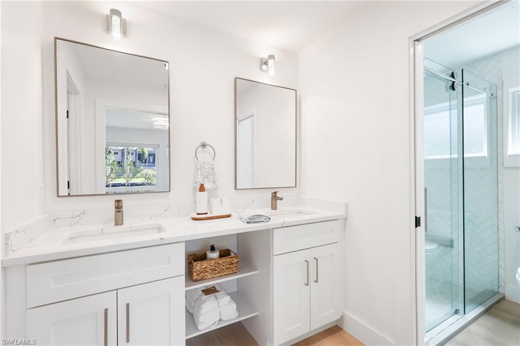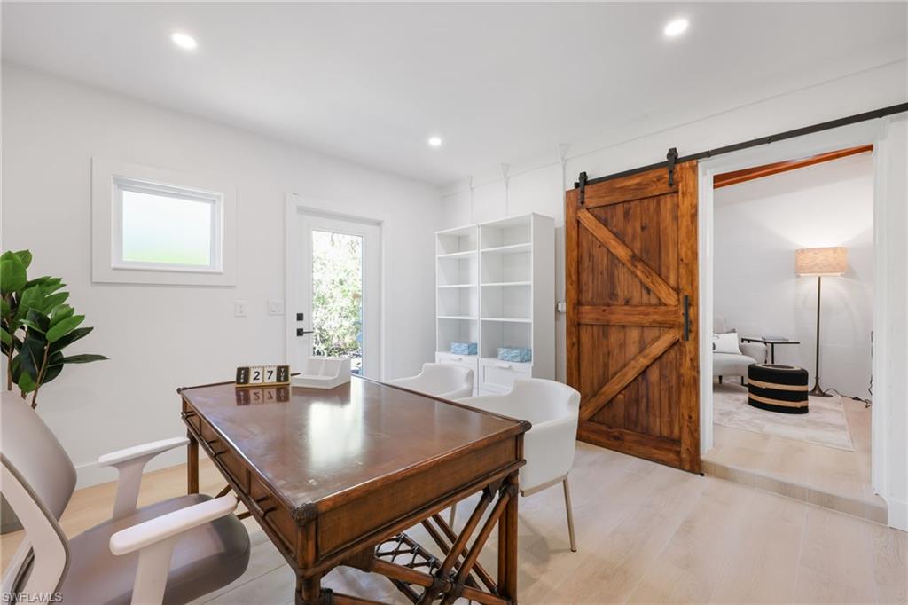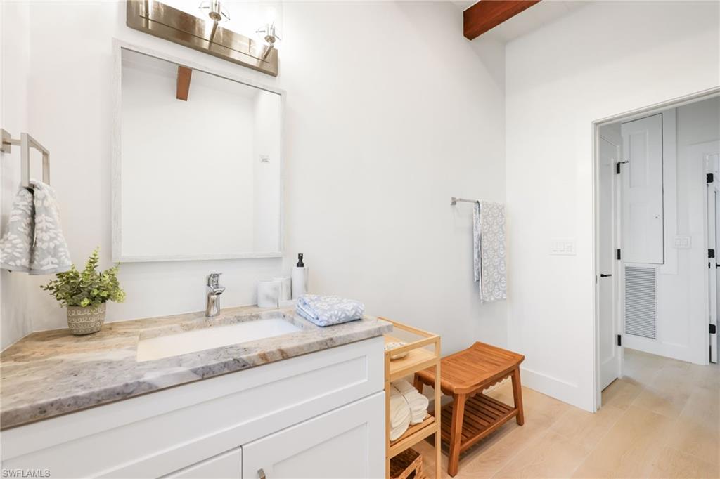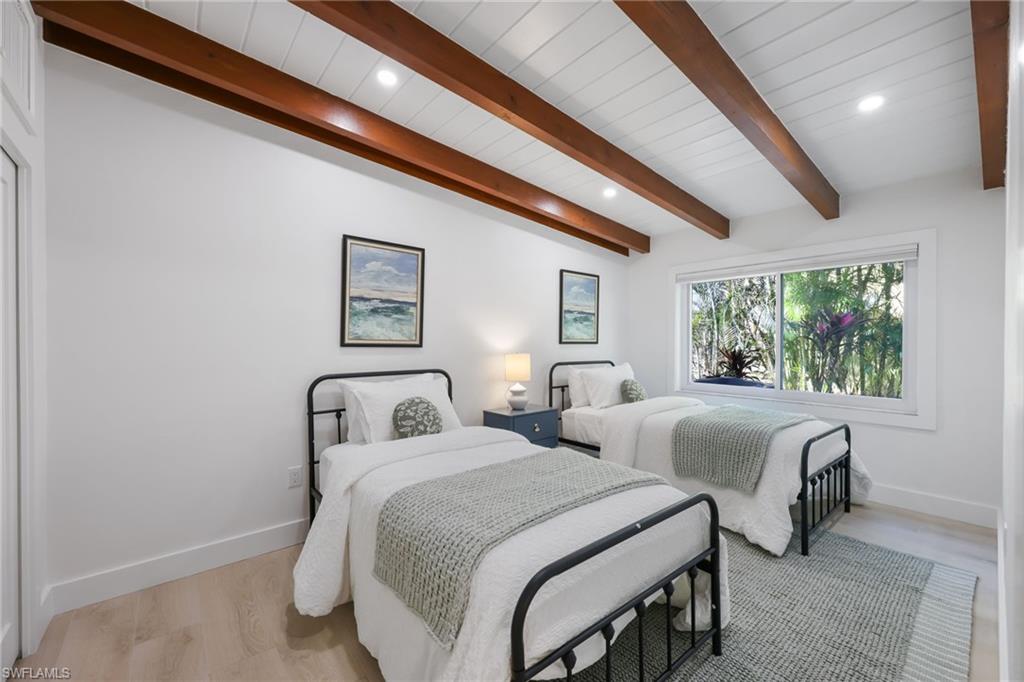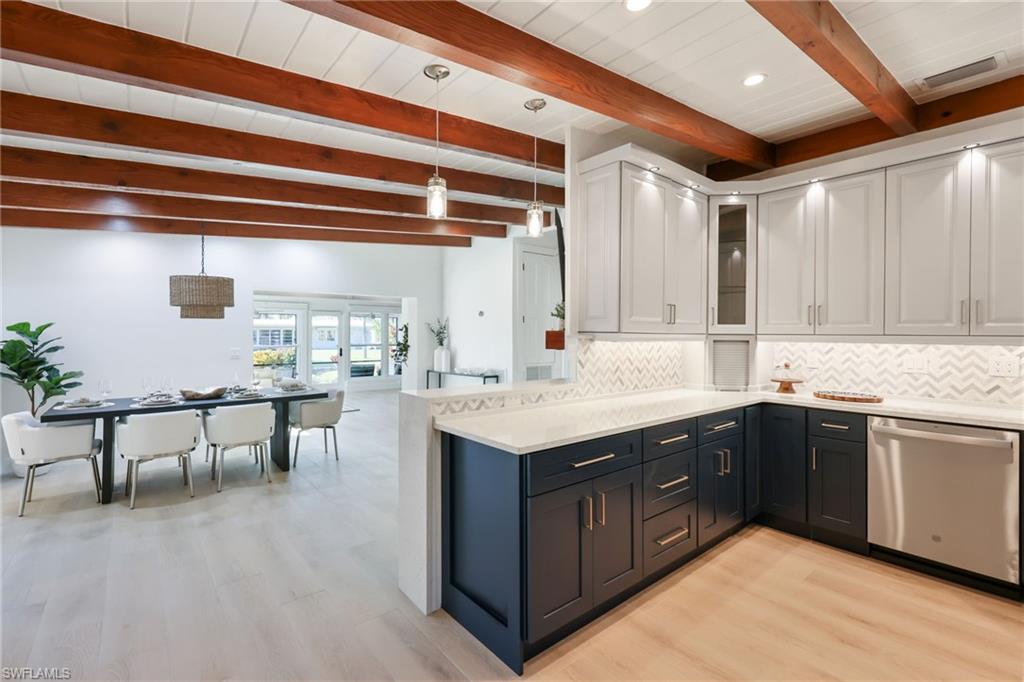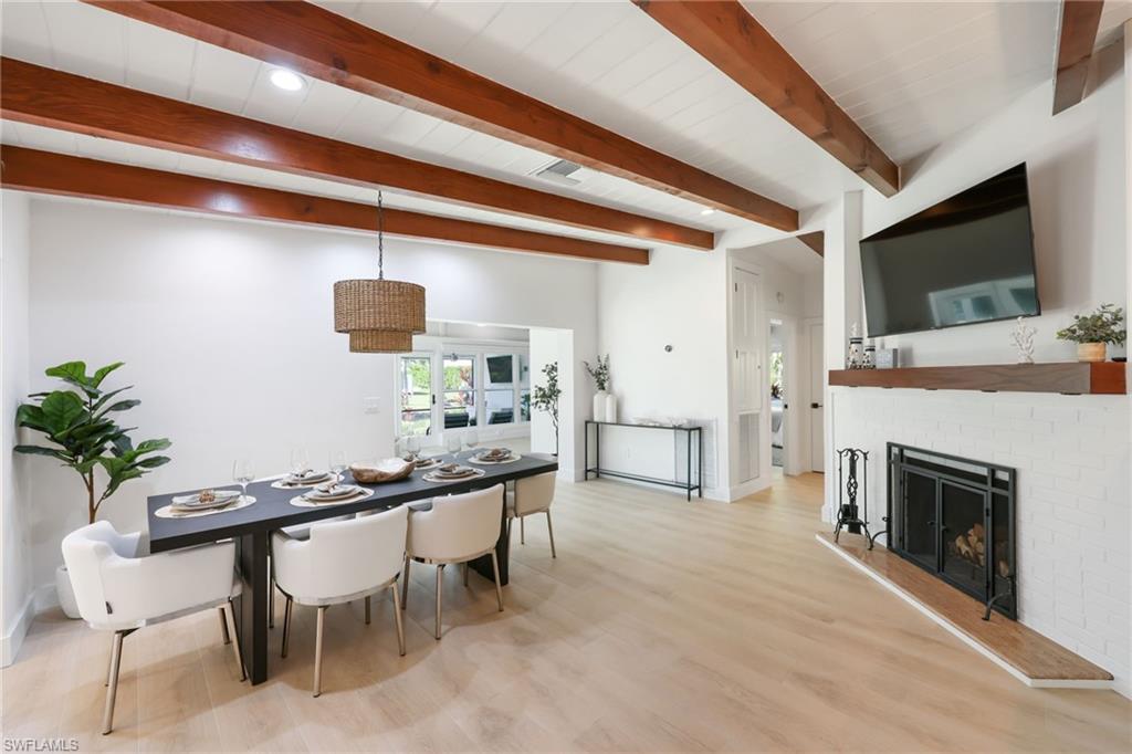 Discover the ultimate waterfront lifestyle in this beautifully renovated 4-bedroom + den, 2-bathroom home, perfectly situated on an oversized 0.4-acre lot with no HOA fees or rental restrictions—ideal for a primary residence or lucrative vacation rental. Vaulted wood-beam ceilings add warmth and character, while elegant wood-look porcelain tile flooring flows throughout. The open-concept layout features a spacious living room, family room, and enclosed lanai, perfect for entertaining. A fireplace with accent lighting enhances the cozy ambiance. The gourmet chef’s kitchen boasts two-tone cabinetry, granite countertops, a sleek tile backsplash, and high-end stainless steel appliances. Every detail is designed for both style and functionality. Additional upgrades include a new HVAC system with UV light, updated ductwork & electrical, hurricane-impact windows, sliders & doors, custom Hunter Douglas blinds, a brand-new water heater, and Roof replaced 2016. Step outside and enjoy a botanical paradise, professionally landscaped with a butterfly garden and tropical greenery. A paved walkway leads to your private boat dock with a 10,000-lb boat lift & remote control operation, making boating effortless. Located on a quiet, palm-lined street, yet just minutes from Bonita Springs' pristine beaches, top-rated schools, hospitals, shopping, and dining. This move-in-ready home offers luxury, location & lifestyle. Schedule your private tour today!