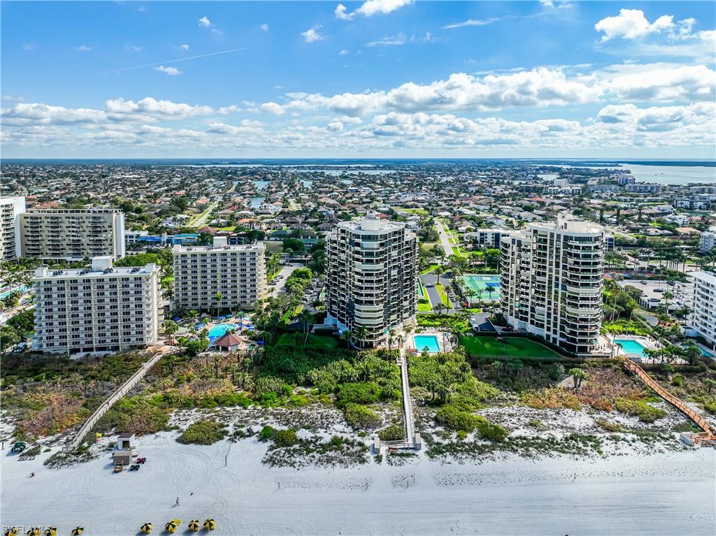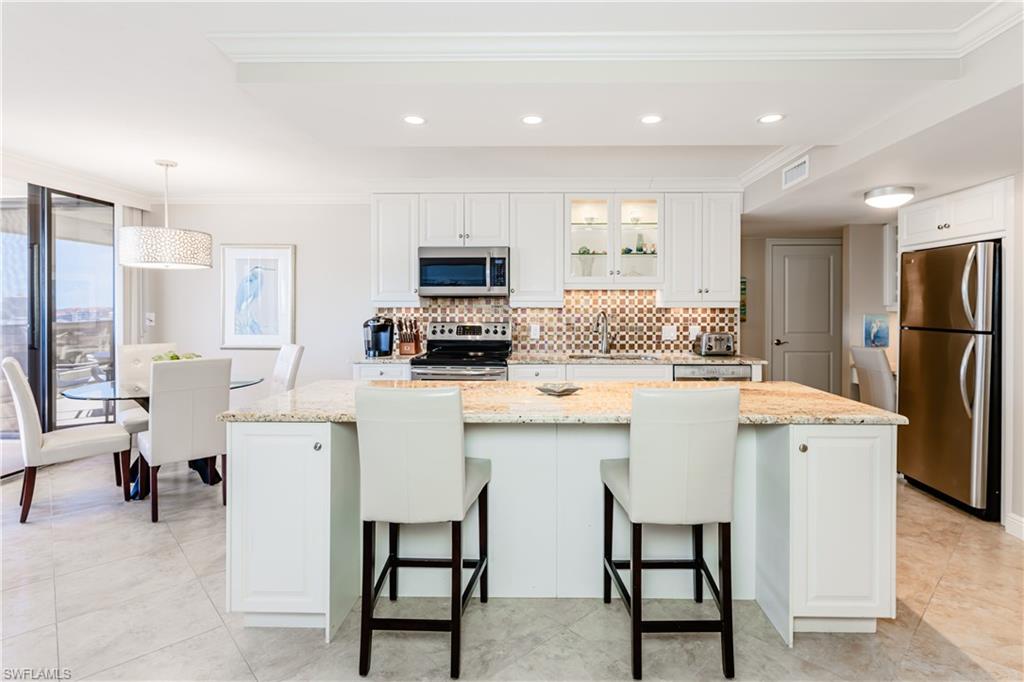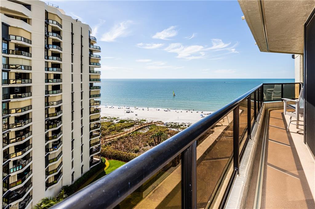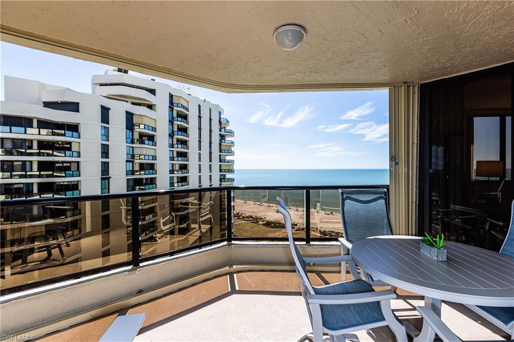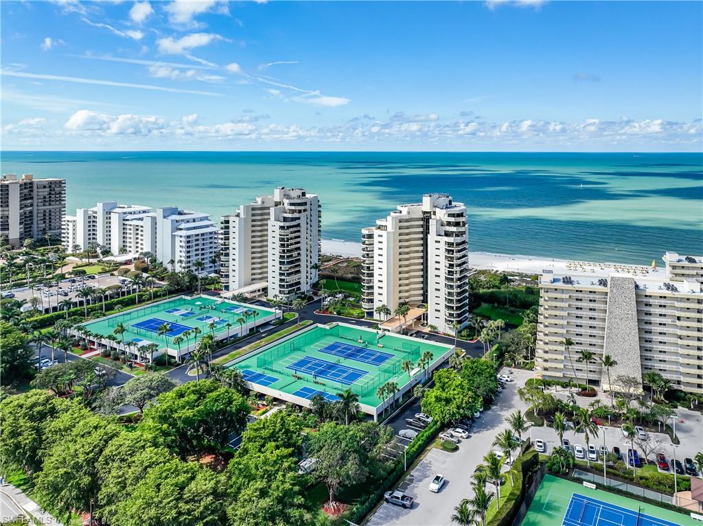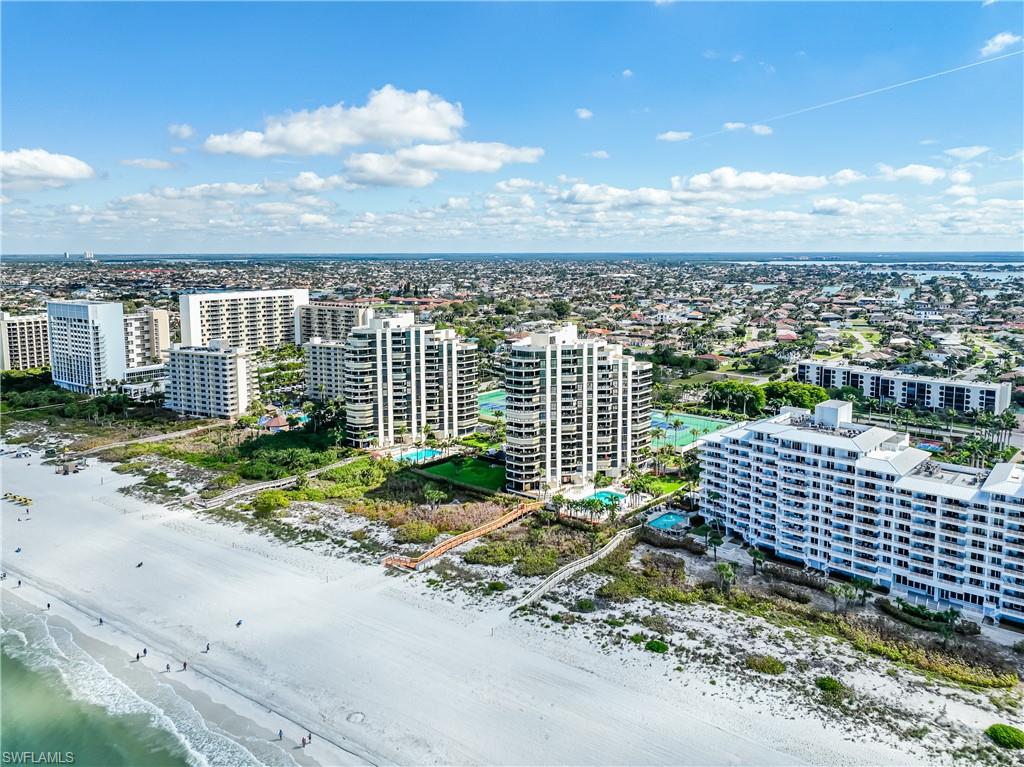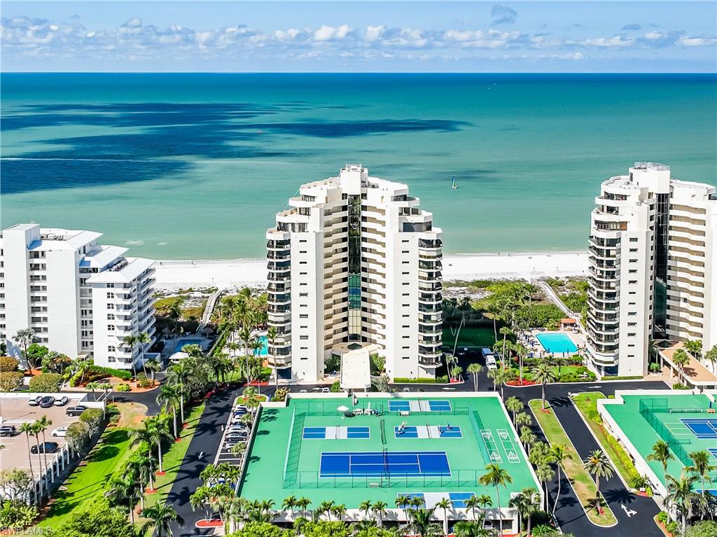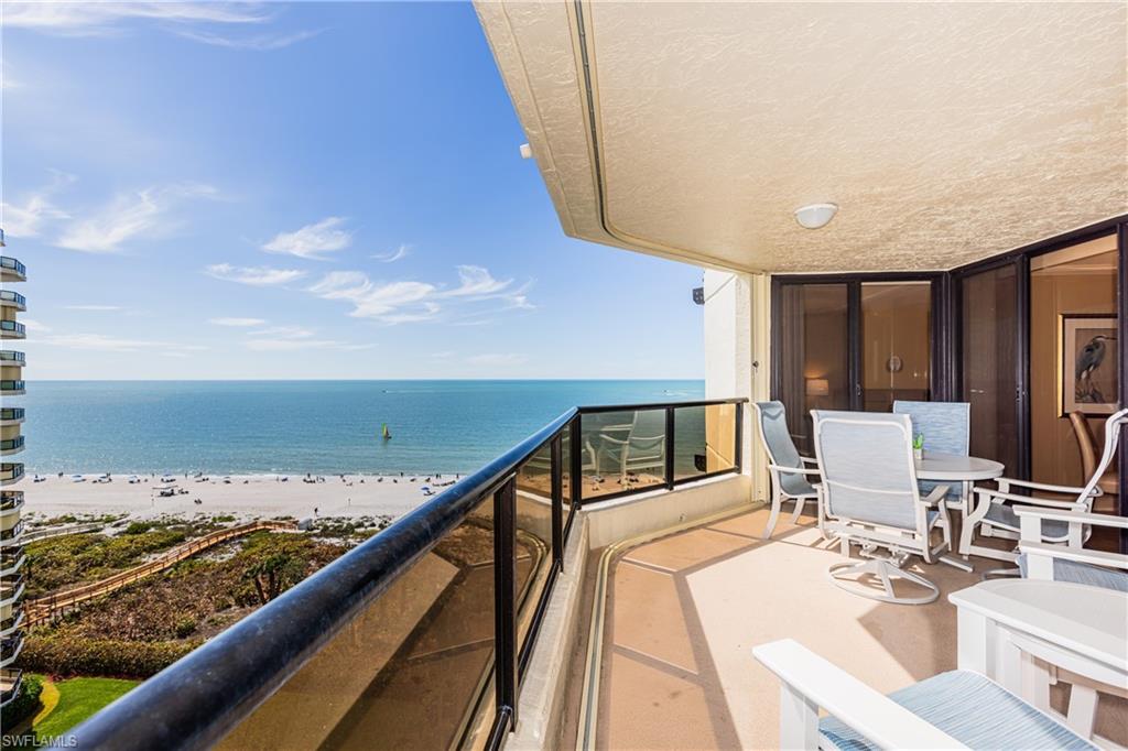 Enjoy both Evening/Dusk’s GLORIOUS SUNSETS from the South Side Lanai & Wake Up to Morning/Dawn’s MAGICAL SUNRISES from The Wrap-Around East Rear Lanai with Clear Plexi Glass Enclosures! Rarely do you find both Exposures in such A GEM of a condo In a Beautiful High Rise at the Desirable South End of Marco’s world class beach! The moment you open the Door to this privately located CORNER Spacious 2 Bedroom Condo, offering a Total of 1,568 SF of Living Space on the ideal 10th floor, you will be greeted with Beaming Natural Light Inviting you inside to delight in the WIDE-OPEN SPLIT FLOORPLAN. Low maintenance Tile & Laminate Flooring flows throughout this unit which features a walk-in Storage/Owners’ Closet in its foyer! The Stunning White, Granite, SS Eat-In Kitchen – boasting Under Cabinet Lighting, Self-Closing Cabinetry, a Desk Area with Custom Wine Rack above it plus A HUGE CENTER ISLAND with Seating/Extra Storage - is OPEN to A Sumptuous Living Area with White Sectional Sofa and Delightful Dining Space with Glass Top Table & New Fixture all of which have Lanai Access to be mesmerized by the Pool/10,000 Island/Beach/Gulf VIEWS. The Adjacent Laundry Area, which features a 2yo Stacked LG Washer/Dryer, leads to the Private Guest Wing offering High Vanity & Combo Shower/Tub Bathroom (that can be used as Powder Room), 2 Walk-In Closets, New Queen Size LIFT BED for storage below it & Sliders to Lanai plus fixed window to enjoy the VIEWS. Opposite the Guest Area Via A Pocket Door is the Private Master Suite boasting WALLS OF SLIDING GLASS DOORS & Access to the Rear East Lanai with PANORAMIC ISLAND VISTAS That twinkle at night & dazzle in the Morning Sunrise Glows. It presents a Spacious Bath w Double Window that Opens, Sprawling Wood/Granite Vanity w Custom Framed Mirror & Ample Storage Space, Adjacent Semi Glass-Enclosed FLOOR TO CEILING TILED ‘HUGE’ Shower with Lovely Glass Tiled Listello, Niche and Seat + Walk-In Closet. Also, there is a private water closet with Commode & Second Wood/Granite Vanity with Wood Framed Mirror! This truly is a Well-Designed Floorplan providing A Substantial Living/Entertainment Space as well as Bedroom Privacy with a Sprawling Lanai Area to MAXIMIZE THE VIEWS from every room. You “MUST SEE” this Jewel to Appreciate all its Unique Facets & Features and the Fine Lifestyle this Beach Tower’s Amenities and Convenient LOCATION - merely a short stroll to Casual and Fine Dining, Hotels, Entertainment, Movie Theatre, Post Office/Book Store, Retail, Mini Golf and MORE - Render! This 'BEACH RESIDENCE at the preferred South End of The Beach truly is "PARADISE FOUND"!