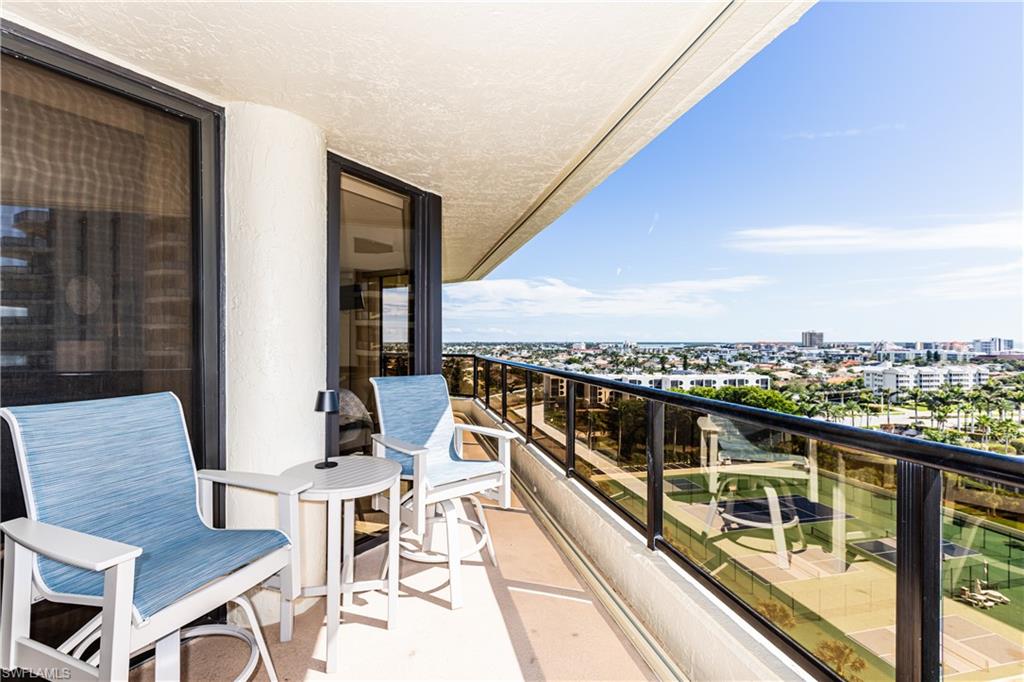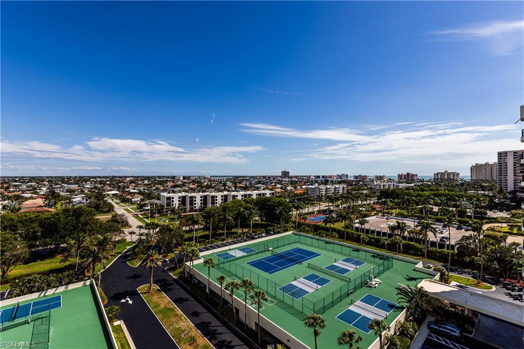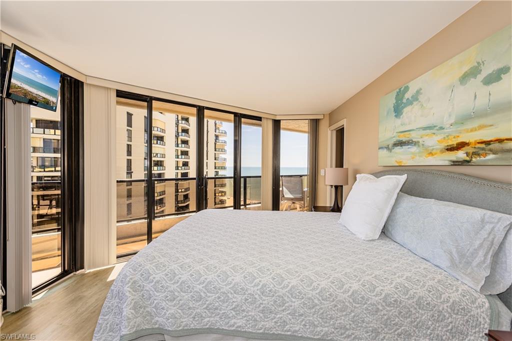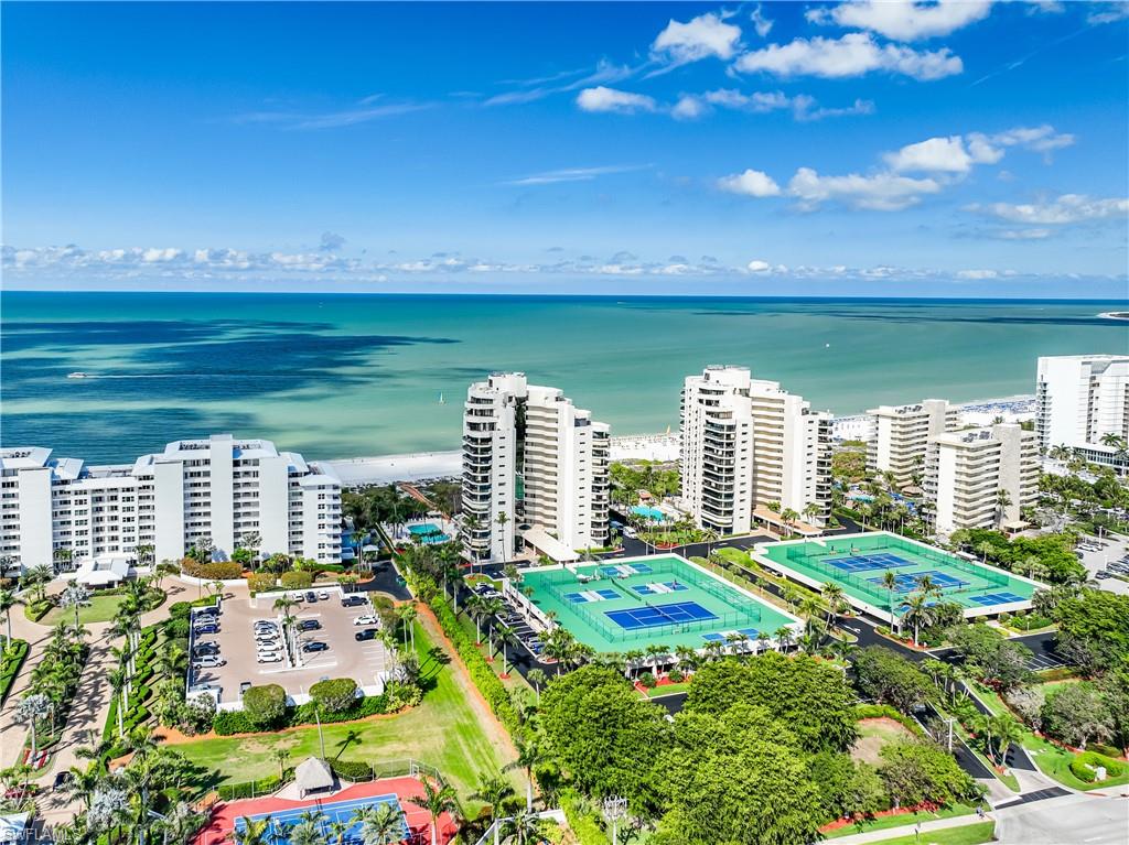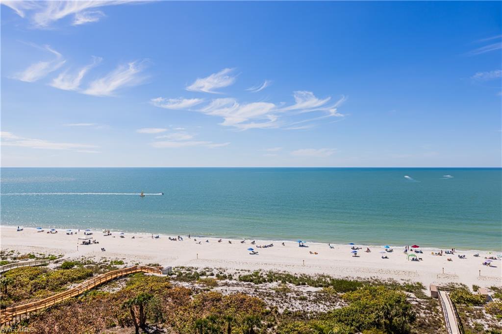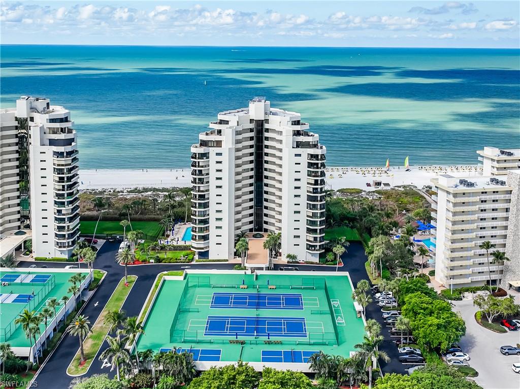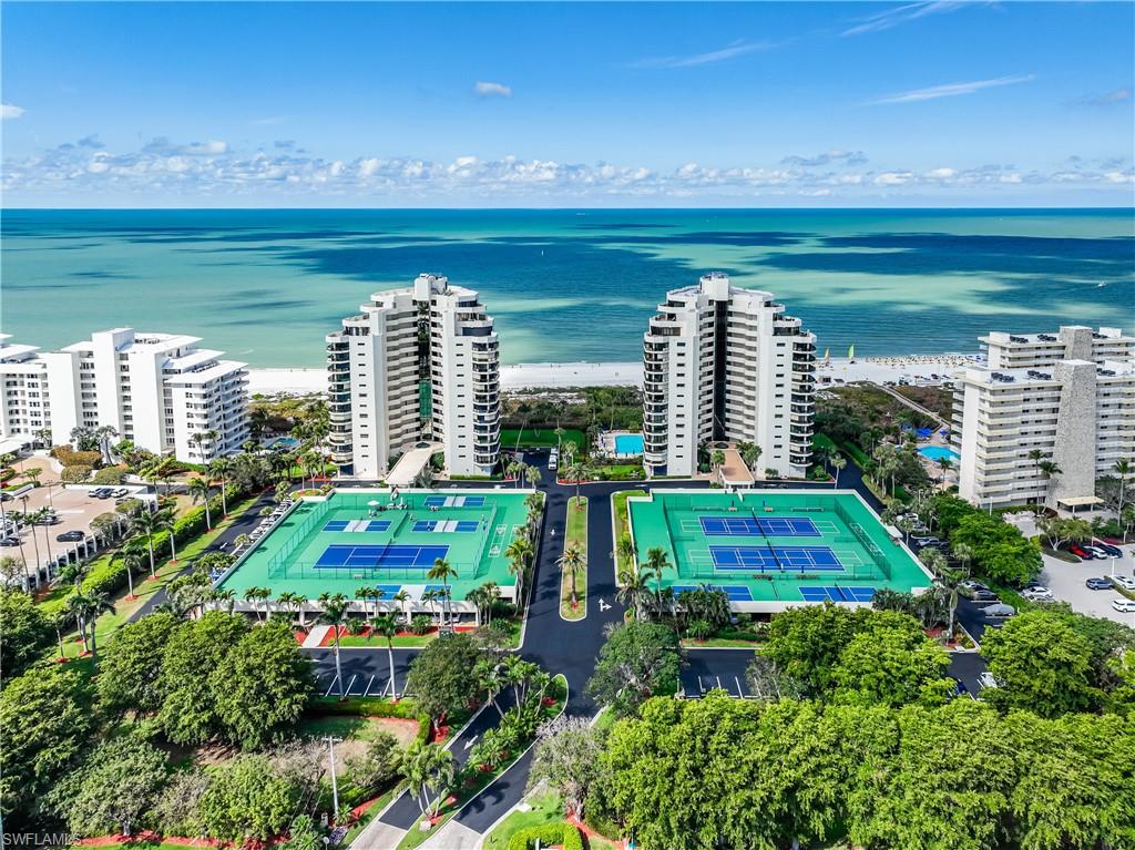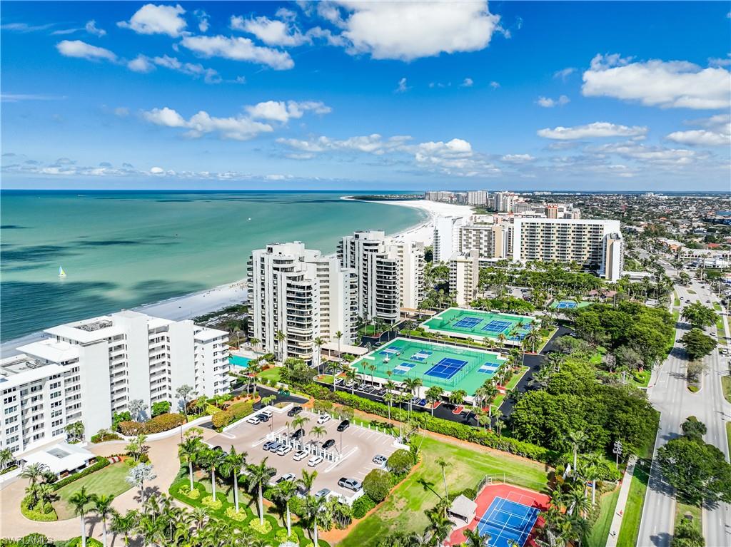 Enjoy both Evening/Dusk’s GLORIOUS SUNSETS from the South Side Lanai & Wake Up to Morning/Dawn’s MAGICAL SUNRISES from The Wrap-Around East Rear Lanai with Clear Plexi Glass Enclosures! Rarely do you find both Exposures in such A GEM of a condo In a Beautiful High Rise at the Desirable South End of Marco’s world class beach! The moment you open the Door to this privately located CORNER Spacious 2 Bedroom Condo, offering a Total of 1,568 SF of Living Space on the ideal 10th floor, you will be greeted with Beaming Natural Light Inviting you inside to delight in the WIDE-OPEN SPLIT FLOORPLAN. Low maintenance Tile & Laminate Flooring flows throughout this unit which features a walk-in Storage/Owners’ Closet in its foyer! The Stunning White, Granite, SS Eat-In Kitchen – boasting Under Cabinet Lighting, Self-Closing Cabinetry, a Desk Area with Custom Wine Rack above it plus A HUGE CENTER ISLAND with Seating/Extra Storage - is OPEN to A Sumptuous Living Area with White Sectional Sofa and Delightful Dining Space with Glass Top Table & New Fixture all of which have Lanai Access to be mesmerized by the Pool/10,000 Island/Beach/Gulf VIEWS. The Adjacent Laundry Area, which features a 2yo Stacked LG Washer/Dryer, leads to the Private Guest Wing offering High Vanity & Combo Shower/Tub Bathroom (that can be used as Powder Room), 2 Walk-In Closets, New Queen Size LIFT BED for storage below it & Sliders to Lanai plus fixed window to enjoy the VIEWS. Opposite the Guest Area Via A Pocket Door is the Private Master Suite boasting WALLS OF SLIDING GLASS DOORS & Access to the Rear East Lanai with PANORAMIC ISLAND VISTAS That twinkle at night & dazzle in the Morning Sunrise Glows. It presents a Spacious Bath w Double Window that Opens, Sprawling Wood/Granite Vanity w Custom Framed Mirror & Ample Storage Space, Adjacent Semi Glass-Enclosed FLOOR TO CEILING TILED ‘HUGE’ Shower with Lovely Glass Tiled Listello, Niche and Seat + Walk-In Closet. Also, there is a private water closet with Commode & Second Wood/Granite Vanity with Wood Framed Mirror! This truly is a Well-Designed Floorplan providing A Substantial Living/Entertainment Space as well as Bedroom Privacy with a Sprawling Lanai Area to MAXIMIZE THE VIEWS from every room. You “MUST SEE” this Jewel to Appreciate all its Unique Facets & Features and the Fine Lifestyle this Beach Tower’s Amenities and Convenient LOCATION - merely a short stroll to Casual and Fine Dining, Hotels, Entertainment, Movie Theatre, Post Office/Book Store, Retail, Mini Golf and MORE - Render! This 'BEACH RESIDENCE at the preferred South End of The Beach truly is "PARADISE FOUND"!