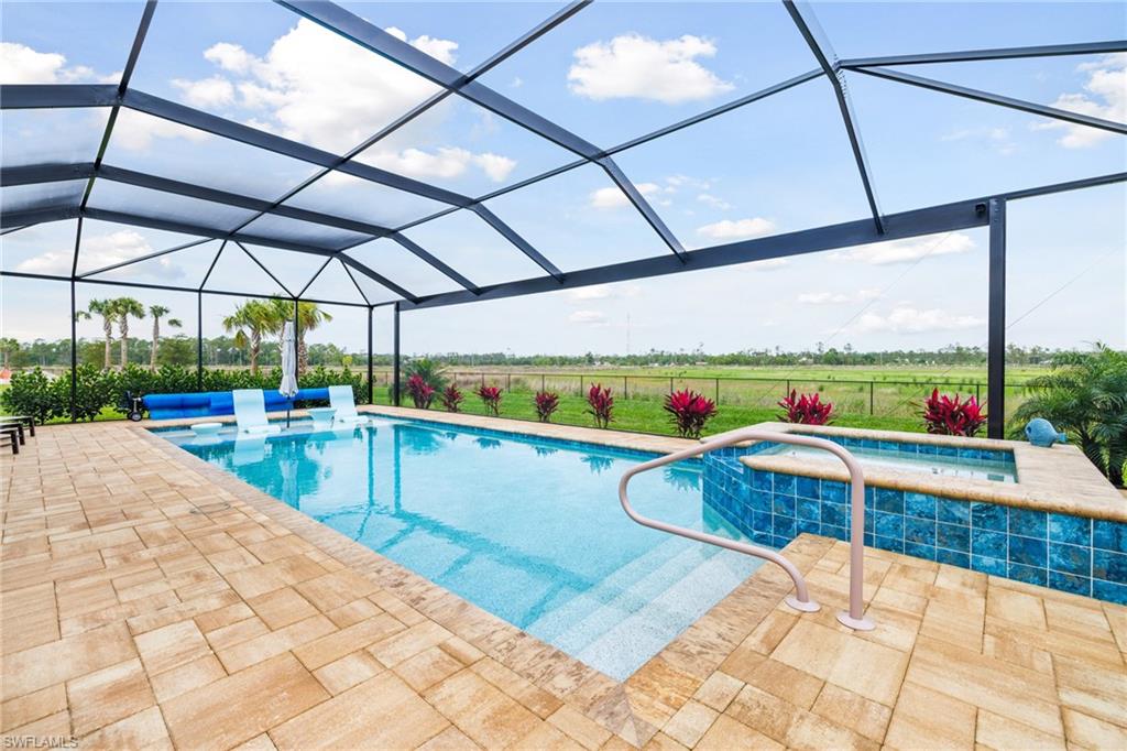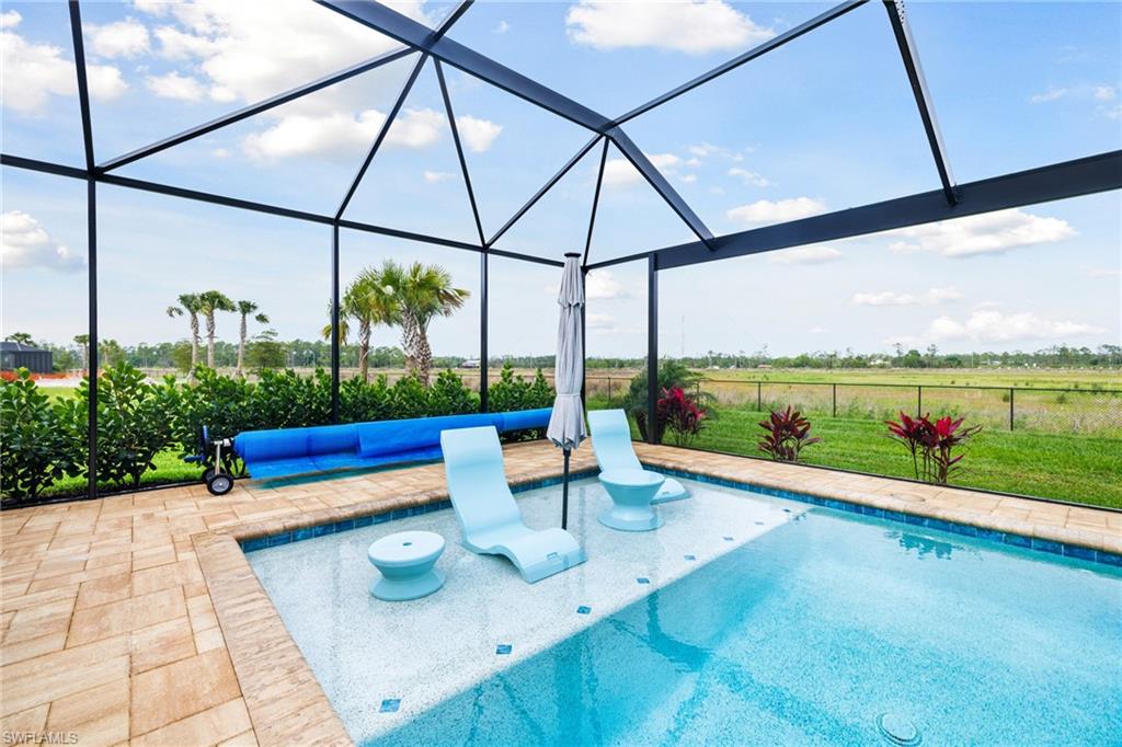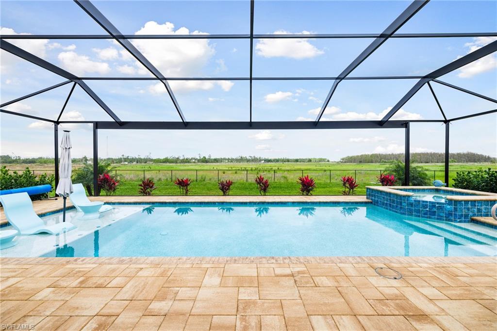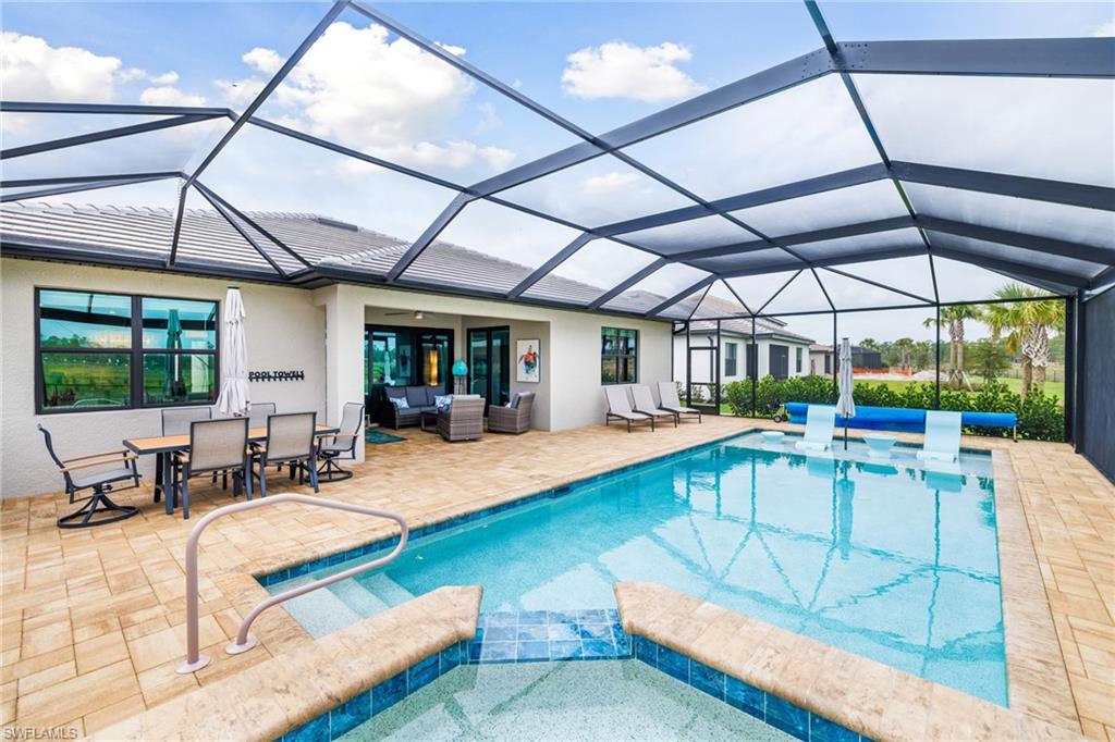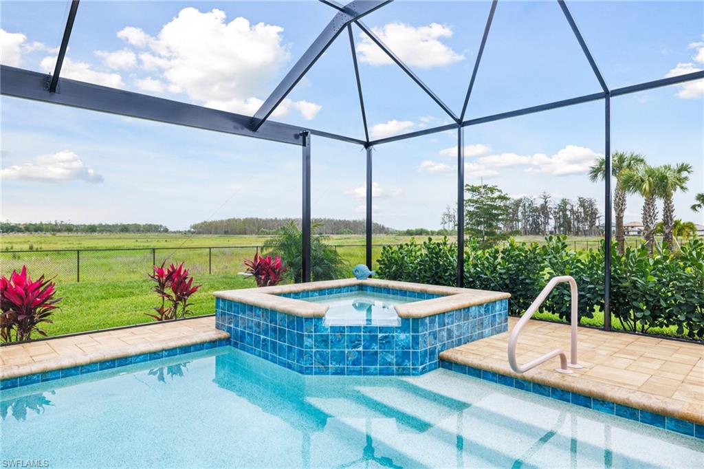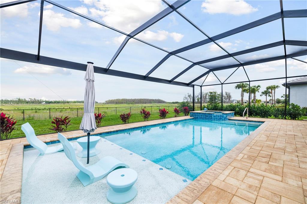 Discover a haven of luxury and tranquility in this exquisite three-bedroom + den, three-bathroom home. Meticulously landscaped grounds, showcasing lush new grass and vibrant landscaping, create a captivating first impression as you arrive via the long paver driveway to this beautiful oasis, instantly revealing the tranquility and luxury within. Upon entering, a warm ambiance welcomes you into the bright entryway with plank tile flooring throughout. Double doors reveal a versatile flex/den, while the entryway seamlessly transitions into the expansive family room and chef’s kitchen. The kitchen boasts new, upgraded appliances, 42-inch cabinets with under-cabinet lighting, and quartz countertops with a tile backsplash. An oversized island provides ample workspace, and an adjacent eat-in dining area is perfect for entertaining. Glass sliding doors open to a screened patio, fostering a harmonious blend of indoor and outdoor spaces. The owner's suite is a true retreat, featuring two spacious custom closets and a luxurious spa-like bathroom with an oversized shower and separate vanities. Sliding glass doors provide direct access to the pool area. Two spacious guest bedrooms, each with custom closets, provide comfortable accommodations; one features a private bath, while the other shares a full bath. Step outside through the sliding glass doors onto an oversized, screened in, covered lanai and patio, where you can slip into the soothing waters of the heated saltwater pool, soak in the hot tub, or relax on the large sun shelf as a breathtaking sunset shimmers across the water, while Florida wildlife grace the endless preserved landscape. Every detail of this well-cared-for home has been thoughtfully considered. Additional features enhance this exceptional property: a three-car garage with AC and dehumidification, added storage with wall and ceiling-mounted racks, custom lighting throughout, impact-resistant windows and generator for extra peace of mind. As evening falls, landscape lighting transforms the property into a magical oasis. Verdana Village features a unique Amenity Center including resort-style pool and spa, restaurant, café, fitness center, indoor/outdoor pickleball courts, tennis courts, indoor basketball court and much more. Conveniently located to I-75 and RSW Airport, FGCU, Restaurants, Shopping, a two-story grocery store and a short drive to some of Florida’s most beautiful beaches.