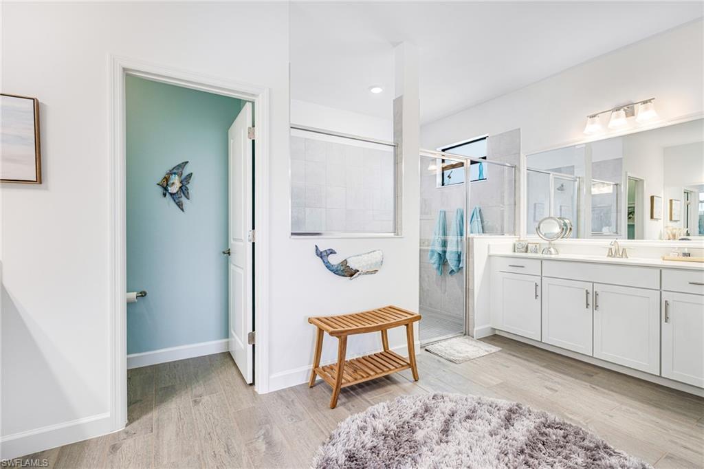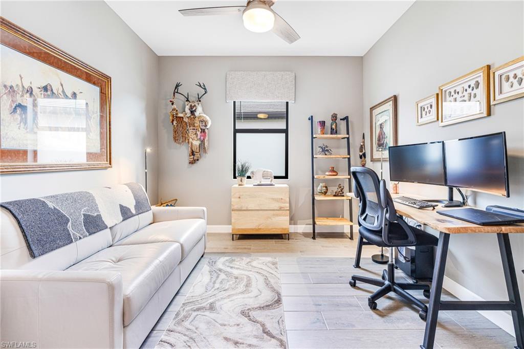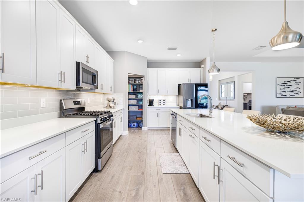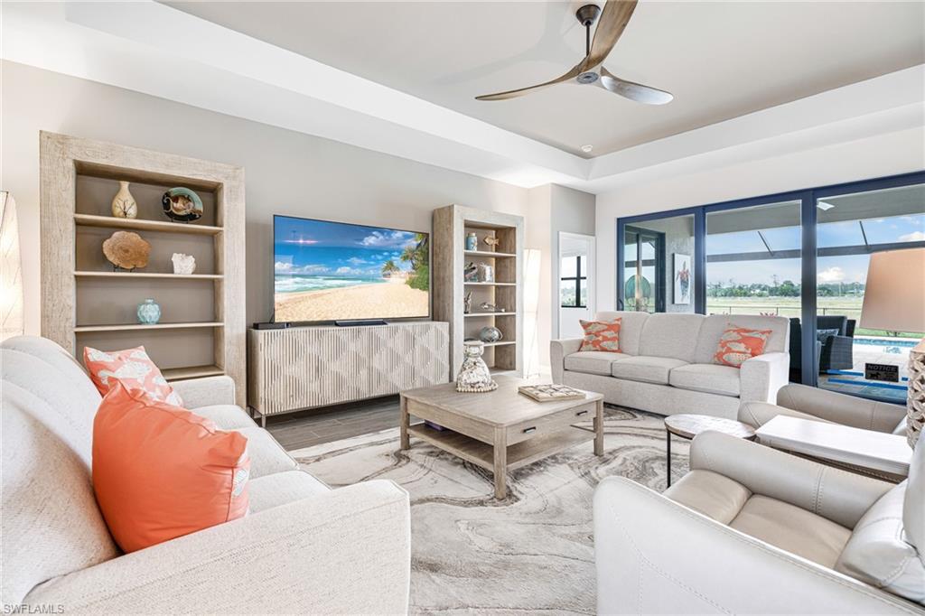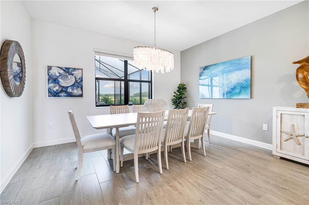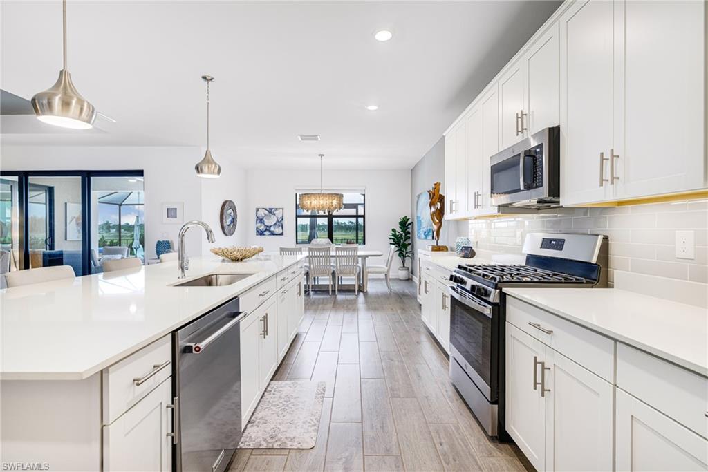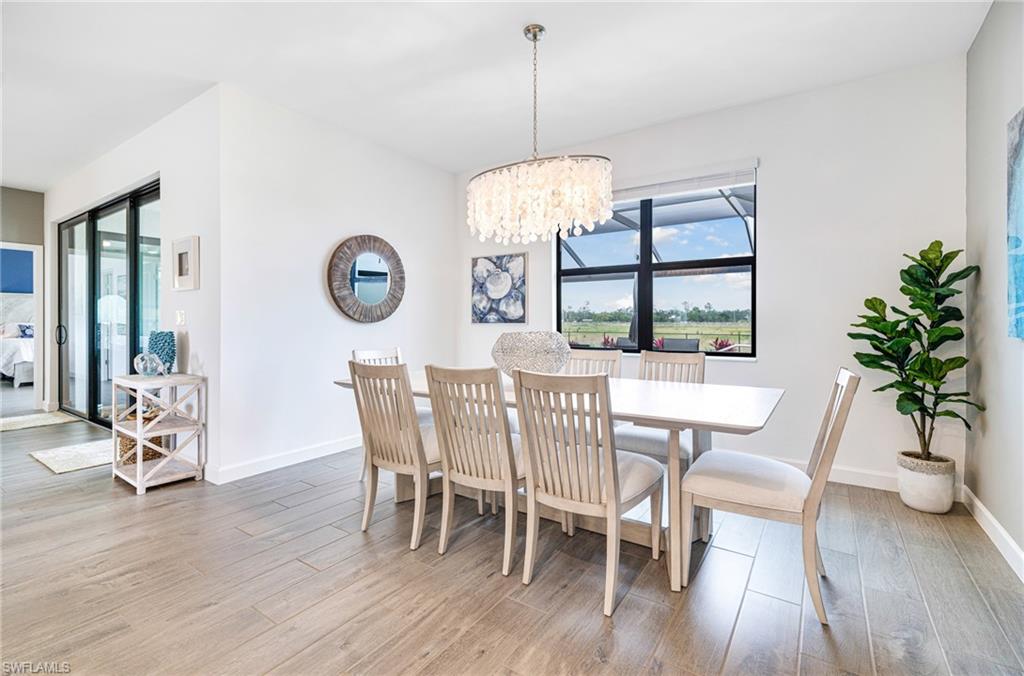 Discover a haven of luxury and tranquility in this exquisite three-bedroom + den, three-bathroom home. Meticulously landscaped grounds, showcasing lush new grass and vibrant landscaping, create a captivating first impression as you arrive via the long paver driveway to this beautiful oasis, instantly revealing the tranquility and luxury within. Upon entering, a warm ambiance welcomes you into the bright entryway with plank tile flooring throughout. Double doors reveal a versatile flex/den, while the entryway seamlessly transitions into the expansive family room and chef’s kitchen. The kitchen boasts new, upgraded appliances, 42-inch cabinets with under-cabinet lighting, and quartz countertops with a tile backsplash. An oversized island provides ample workspace, and an adjacent eat-in dining area is perfect for entertaining. Glass sliding doors open to a screened patio, fostering a harmonious blend of indoor and outdoor spaces. The owner's suite is a true retreat, featuring two spacious custom closets and a luxurious spa-like bathroom with an oversized shower and separate vanities. Sliding glass doors provide direct access to the pool area. Two spacious guest bedrooms, each with custom closets, provide comfortable accommodations; one features a private bath, while the other shares a full bath. Step outside through the sliding glass doors onto an oversized, screened in, covered lanai and patio, where you can slip into the soothing waters of the heated saltwater pool, soak in the hot tub, or relax on the large sun shelf as a breathtaking sunset shimmers across the water, while Florida wildlife grace the endless preserved landscape. Every detail of this well-cared-for home has been thoughtfully considered. Additional features enhance this exceptional property: a three-car garage with AC and dehumidification, added storage with wall and ceiling-mounted racks, custom lighting throughout, impact-resistant windows and generator for extra peace of mind. As evening falls, landscape lighting transforms the property into a magical oasis. Verdana Village features a unique Amenity Center including resort-style pool and spa, restaurant, café, fitness center, indoor/outdoor pickleball courts, tennis courts, indoor basketball court and much more. Conveniently located to I-75 and RSW Airport, FGCU, Restaurants, Shopping, a two-story grocery store and a short drive to some of Florida’s most beautiful beaches.