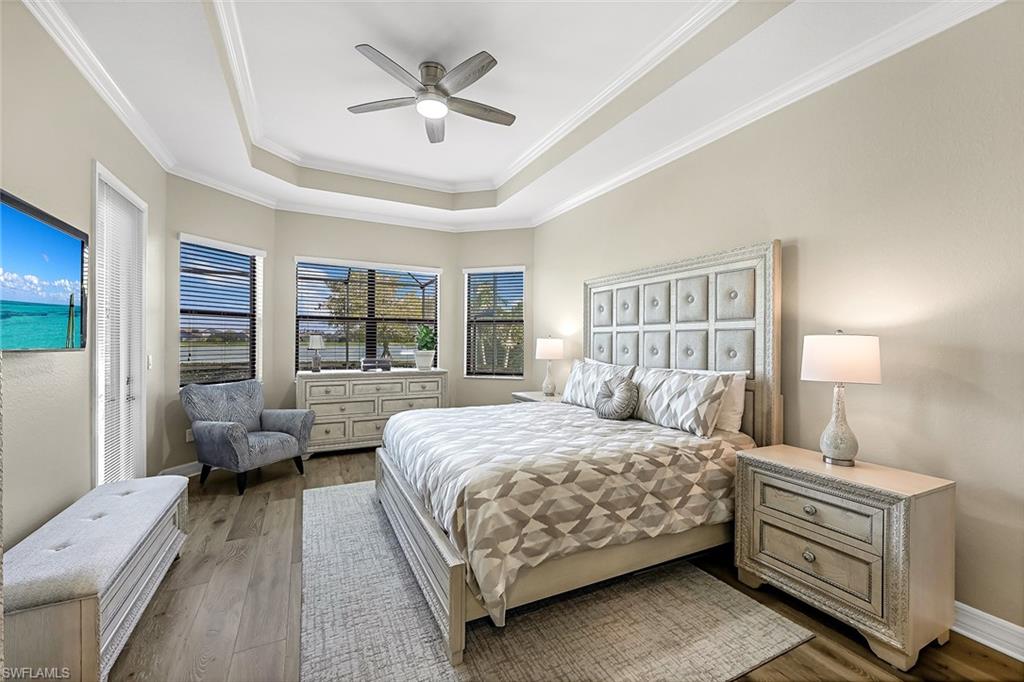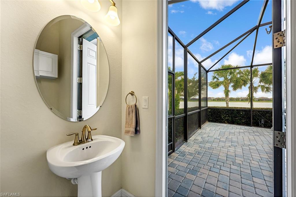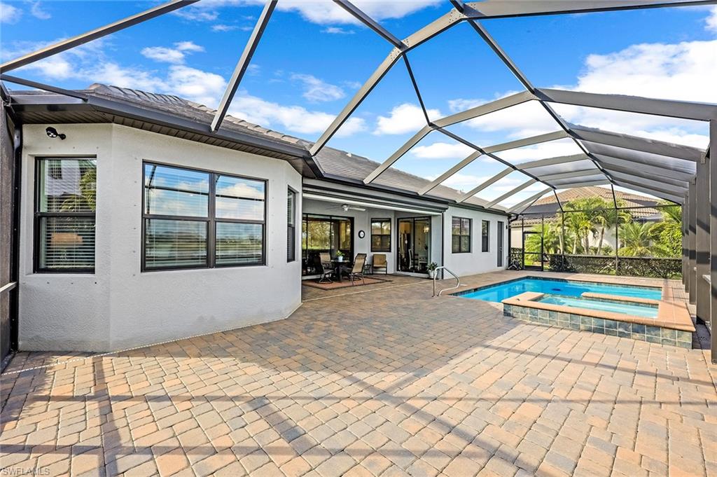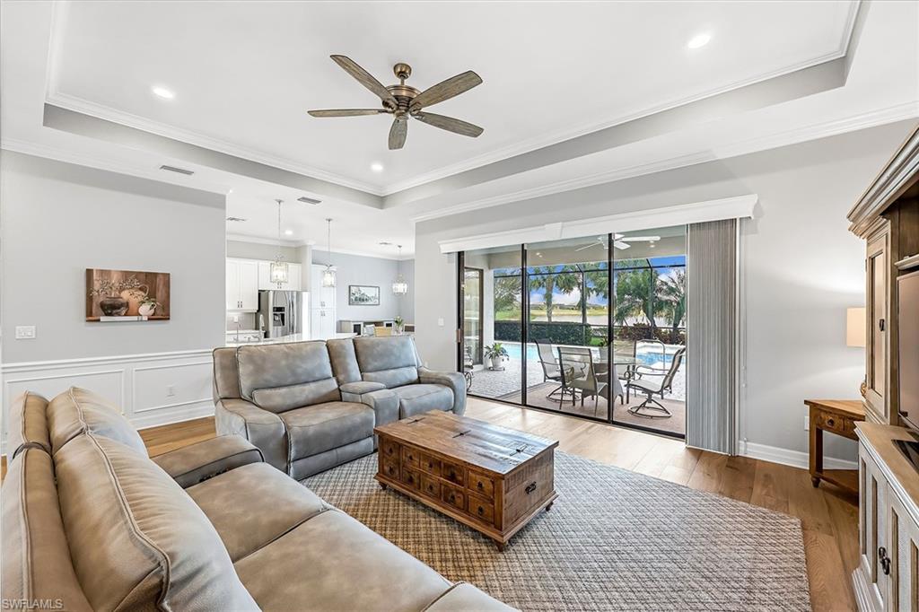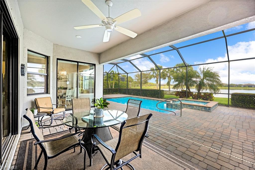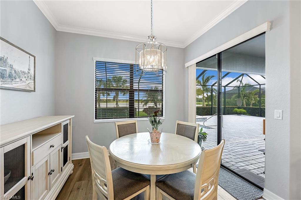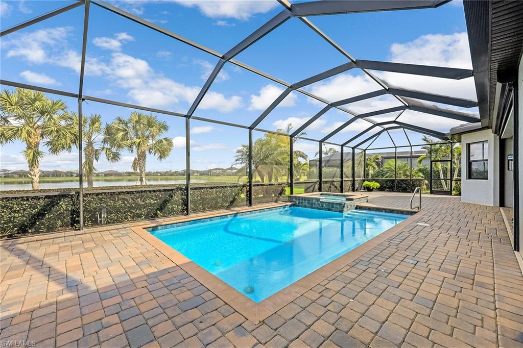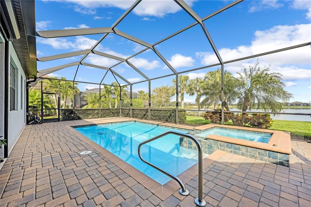 Experience luxury lakefront living in this beautifully upgraded Oakmont model with stunning lakes views in the gated community of The Place at Corkscrew. This move-in ready four-bedroom residence offers high-end finishes and modern conveniences. Step inside to discover the elegance of Villa Borghese wood flooring throughout, complementing the sophisticated open-concept layout. The gourmet kitchen features new quartz countertops, upgraded appliances, pantry with wooden shelving, new sink and faucet, plus reverse osmosis water system. The eat-in kitchen and breakfast bar area provide ample seating for family and guests. The spacious primary retreat offers comfort and relaxation with privacy screen and direct pool access, plus en-suite bath. Designed for versatility, the fourth bedroom with French doors can easily transform into a home office or media room to suit your lifestyle. Stylish lighting and fan fixtures, and elegant window treatments add the perfect finishing touches. Outside, your private oasis awaits. The saltwater pool and spa are enhanced with remote-controlled lighting, creating a serene setting for relaxation or entertaining. Electric rolldown hurricane screens protect the covered lanai creating the ideal storage area for patio furniture when needed. The three-car air-conditioned garage provides additional comfort and flexibility, whether for storage, a workshop or a climate-controlled space. Beyond your doorstep, indulge in the unparalleled amenities of The Place, including a resort-style pool with a waterslide, an upscale restaurant, poolside bar and charming café. Additional amenities include a covered playground, splash park, dog park, tennis and pickleball courts, basketball, bocce and volleyball. This exceptional home embodies modern luxury, effortless living and resort-style comfort. Schedule your private showing today and make this breathtaking retreat your own.