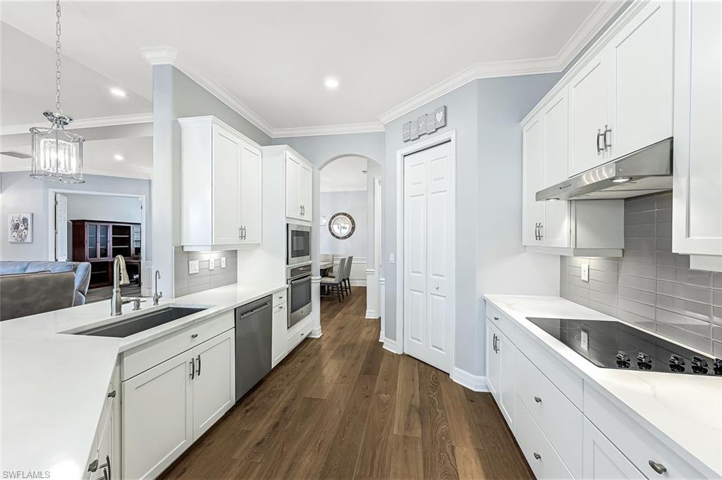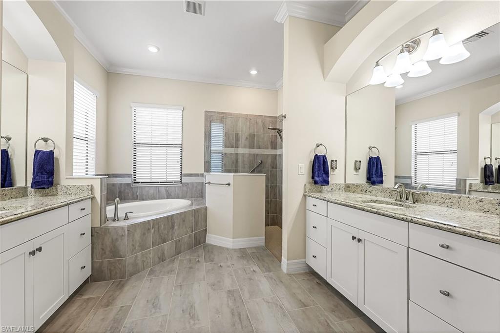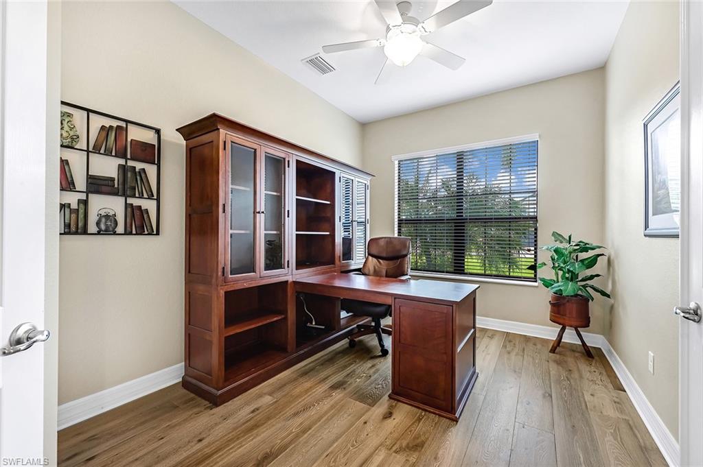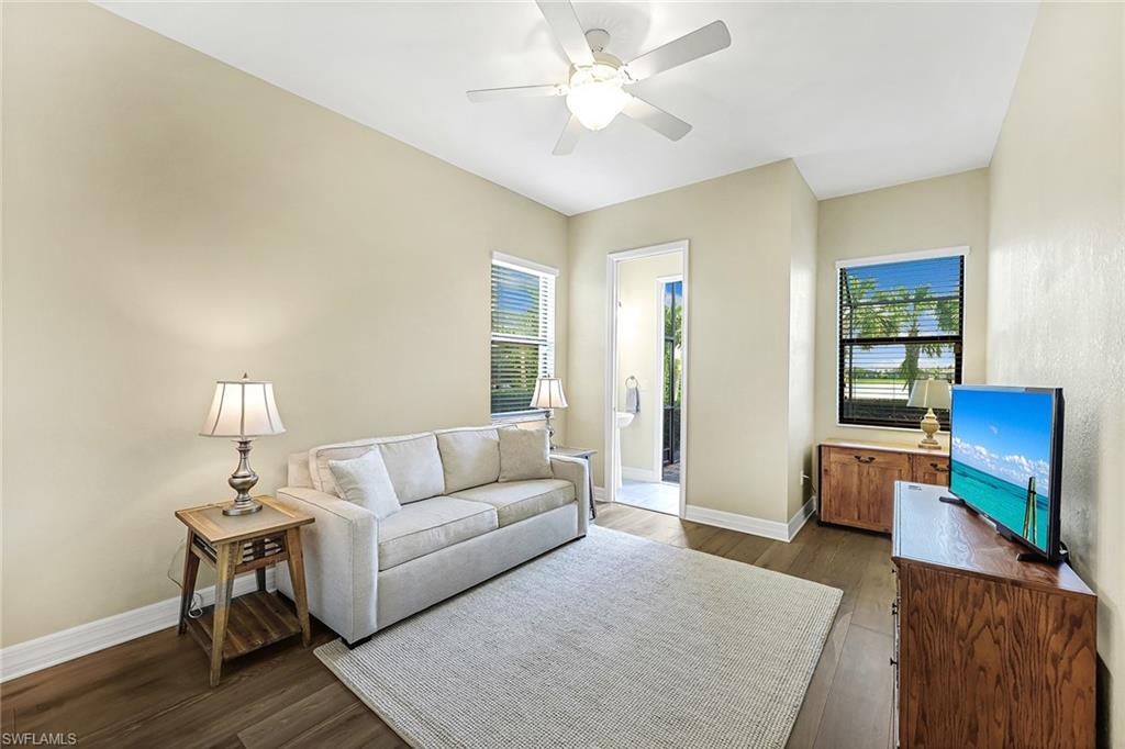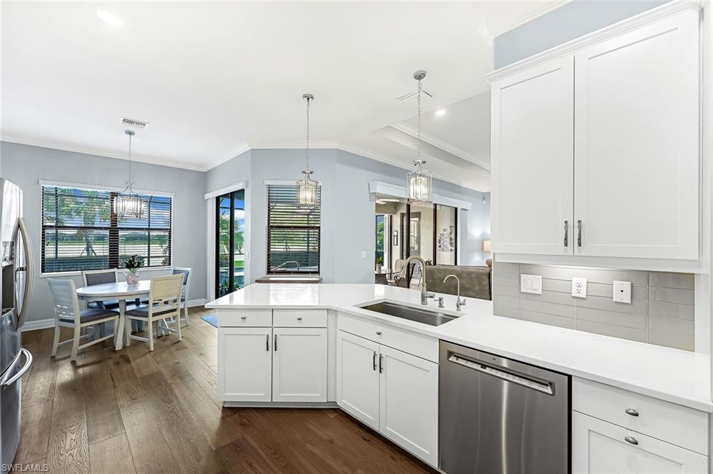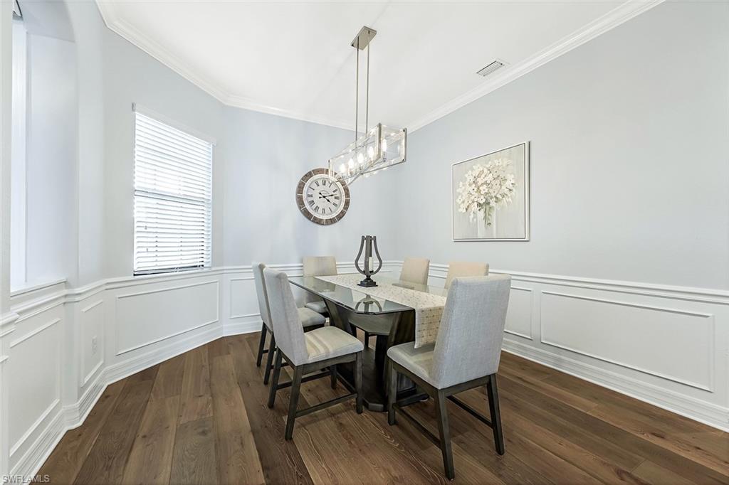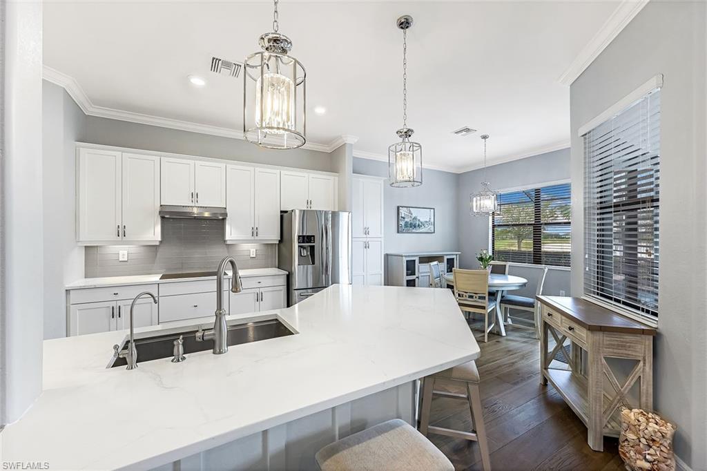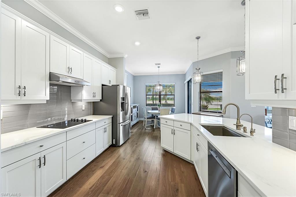 Experience luxury lakefront living in this beautifully upgraded Oakmont model with stunning lakes views in the gated community of The Place at Corkscrew. This move-in ready four-bedroom residence offers high-end finishes and modern conveniences. Step inside to discover the elegance of Villa Borghese wood flooring throughout, complementing the sophisticated open-concept layout. The gourmet kitchen features new quartz countertops, upgraded appliances, pantry with wooden shelving, new sink and faucet, plus reverse osmosis water system. The eat-in kitchen and breakfast bar area provide ample seating for family and guests. The spacious primary retreat offers comfort and relaxation with privacy screen and direct pool access, plus en-suite bath. Designed for versatility, the fourth bedroom with French doors can easily transform into a home office or media room to suit your lifestyle. Stylish lighting and fan fixtures, and elegant window treatments add the perfect finishing touches. Outside, your private oasis awaits. The saltwater pool and spa are enhanced with remote-controlled lighting, creating a serene setting for relaxation or entertaining. Electric rolldown hurricane screens protect the covered lanai creating the ideal storage area for patio furniture when needed. The three-car air-conditioned garage provides additional comfort and flexibility, whether for storage, a workshop or a climate-controlled space. Beyond your doorstep, indulge in the unparalleled amenities of The Place, including a resort-style pool with a waterslide, an upscale restaurant, poolside bar and charming café. Additional amenities include a covered playground, splash park, dog park, tennis and pickleball courts, basketball, bocce and volleyball. This exceptional home embodies modern luxury, effortless living and resort-style comfort. Schedule your private showing today and make this breathtaking retreat your own.