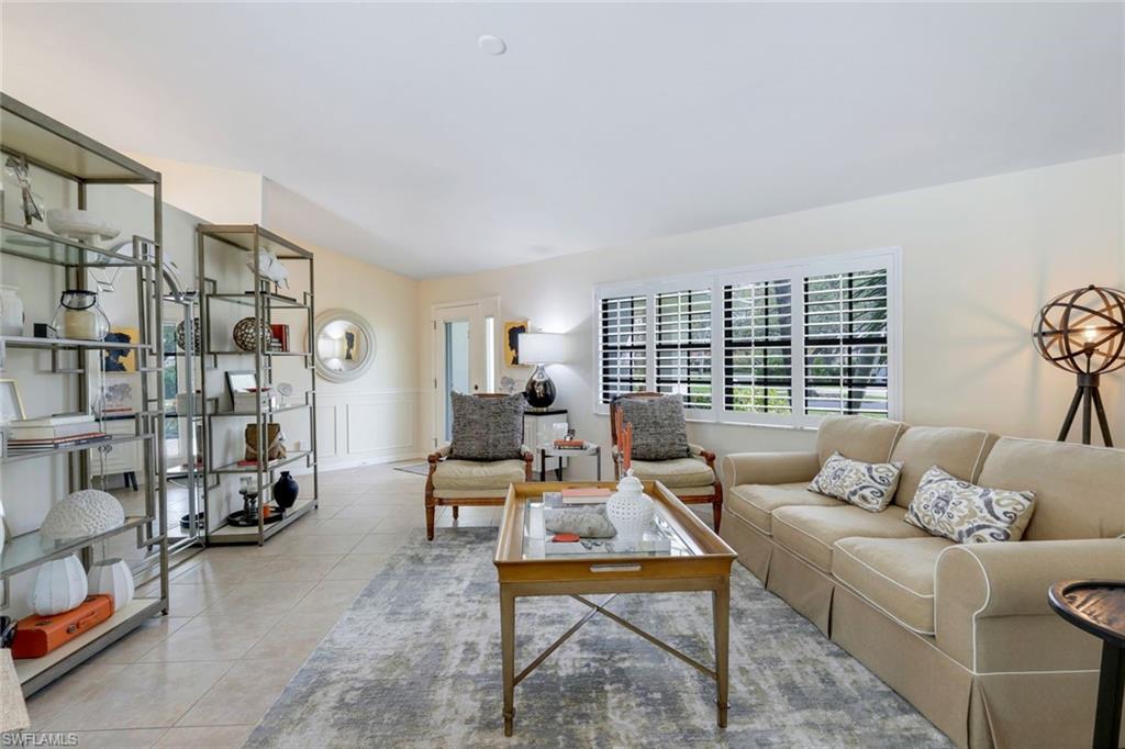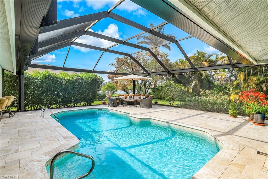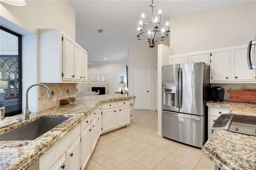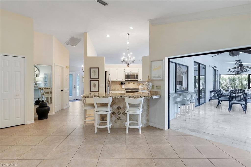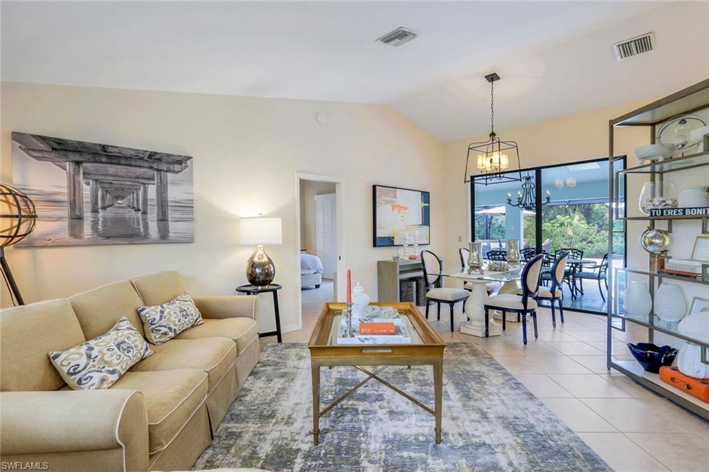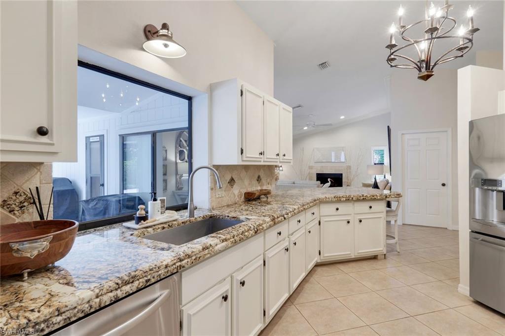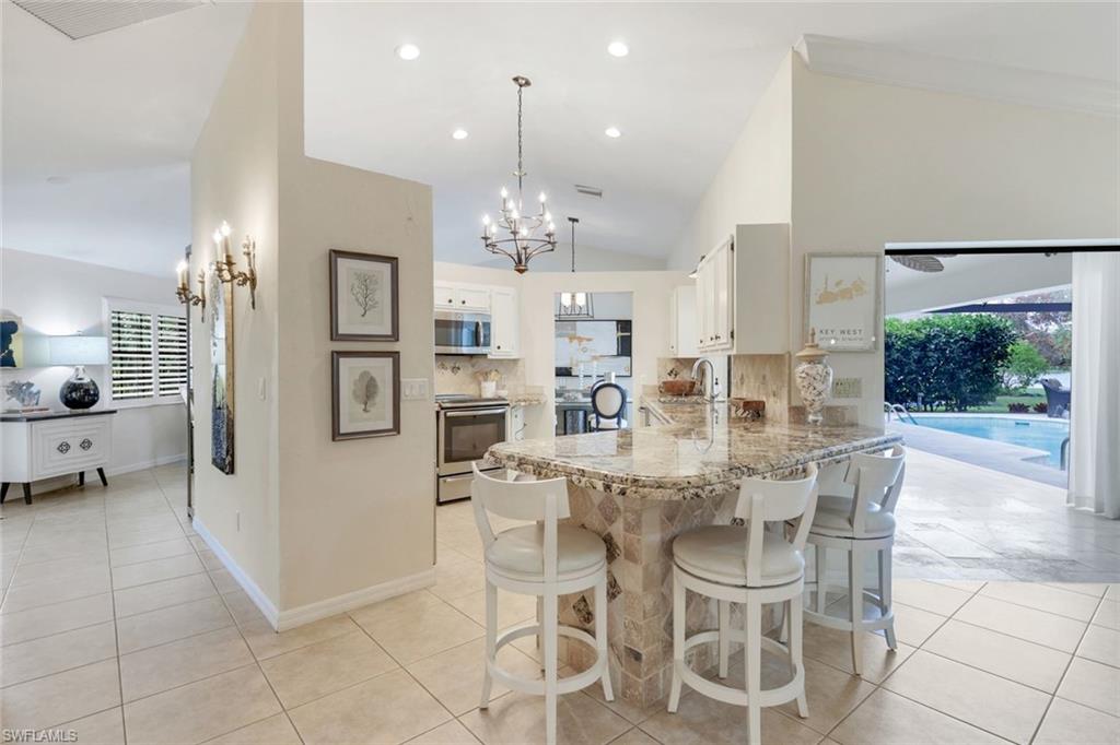 This home lives large and has the perfect blend of privacy and glimpses of the lake. Neutral tile flows from room to room and makes cleaning a breeze. The kitchen has a large pass through window for outdoor entertaining. There is plenty of space under cover as well as a large area for basking in the sun on this travertine pool deck. The picture screens create a bug free outdoor experience. The open floor plan allows the family to enjoy conversation with the cook and have a fire burning in the fireplace on the chillier evenings adding ambiance. The kitchen has an upgraded double granite counter and stainless steel appliances. Off the kitchen is the oversized utility room with a butlers pantry for all the entertaining extras you might need. The owner's suite has a large walk in closet and bath with dual sinks and lots of cabinets. The split bedroom plan allows your guests complete privacy with a pocket door creating a 2 bedroom and bath suite. The guest bath doubles as the pool bath with direct access to the lanai. Each bedroom has walk-in closets. The major components have been updated: Roof 3 years, water heater 2 years & the AC 7 years. The paver drive and walkway and oversized garage top this off beautifully. Vanderbilt is a quiet neighborhood west of 41 in biking distance to the beautiful sandy beaches. Walk to Royal scoop in the evenings for ice cream. Low fees and great location make this an exceptional home to enjoy the coveted Florida lifestyle.