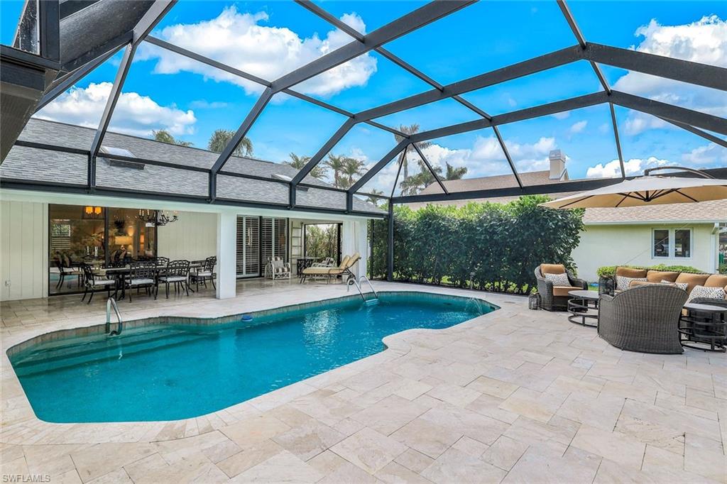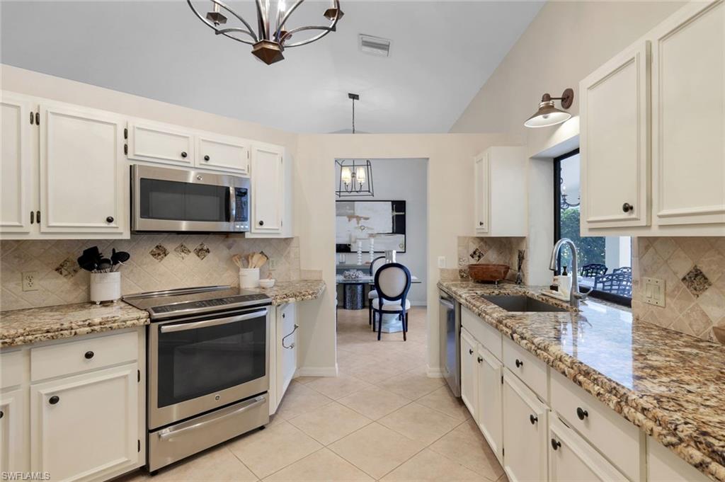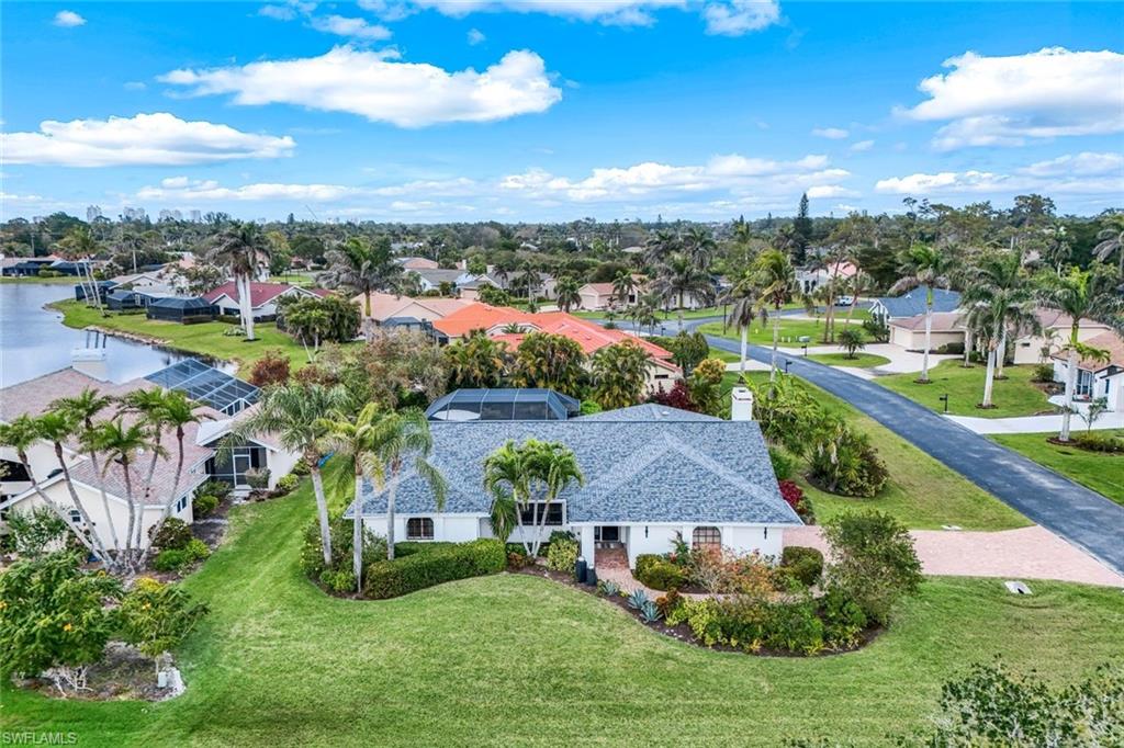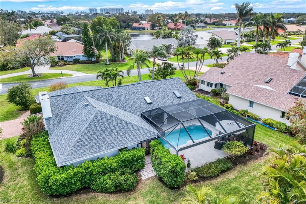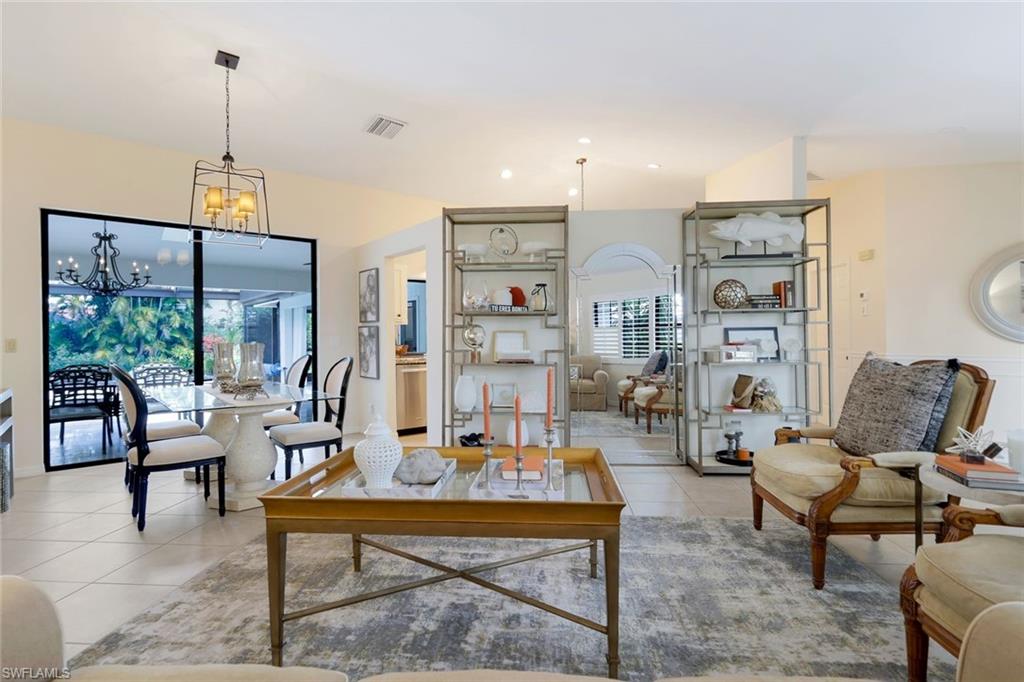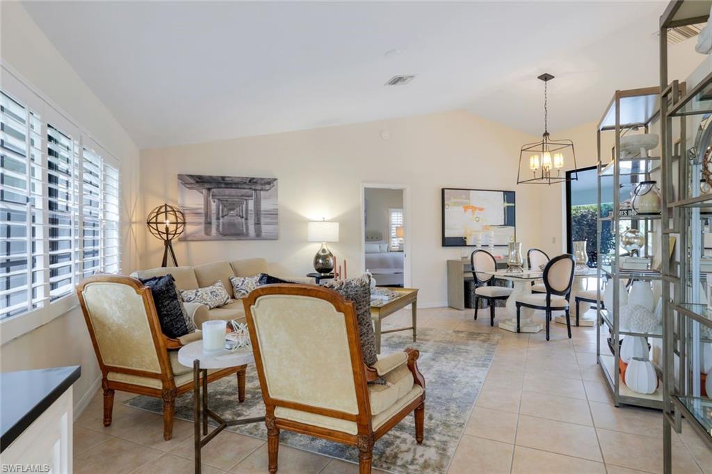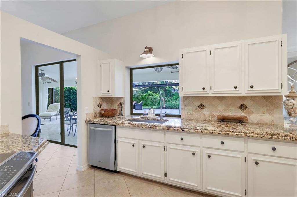 This home lives large and has the perfect blend of privacy and glimpses of the lake. Neutral tile flows from room to room and makes cleaning a breeze. The kitchen has a large pass through window for outdoor entertaining. There is plenty of space under cover as well as a large area for basking in the sun on this travertine pool deck. The picture screens create a bug free outdoor experience. The open floor plan allows the family to enjoy conversation with the cook and have a fire burning in the fireplace on the chillier evenings adding ambiance. The kitchen has an upgraded double granite counter and stainless steel appliances. Off the kitchen is the oversized utility room with a butlers pantry for all the entertaining extras you might need. The owner's suite has a large walk in closet and bath with dual sinks and lots of cabinets. The split bedroom plan allows your guests complete privacy with a pocket door creating a 2 bedroom and bath suite. The guest bath doubles as the pool bath with direct access to the lanai. Each bedroom has walk-in closets. The major components have been updated: Roof 3 years, water heater 2 years & the AC 7 years. The paver drive and walkway and oversized garage top this off beautifully. Vanderbilt is a quiet neighborhood west of 41 in biking distance to the beautiful sandy beaches. Walk to Royal scoop in the evenings for ice cream. Low fees and great location make this an exceptional home to enjoy the coveted Florida lifestyle.