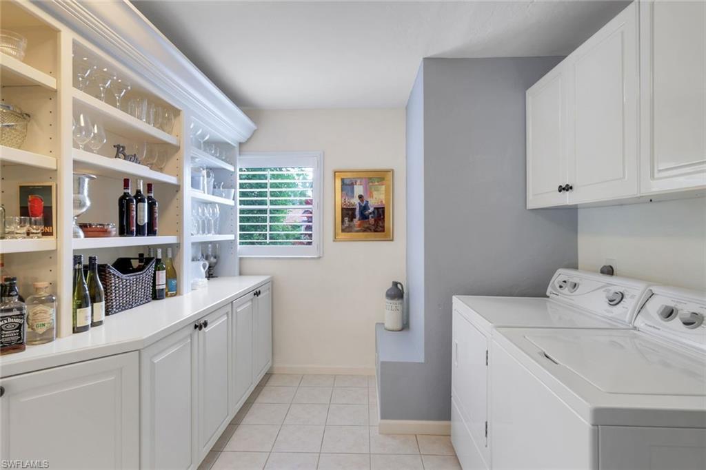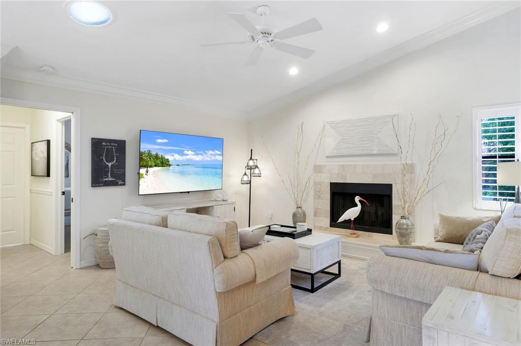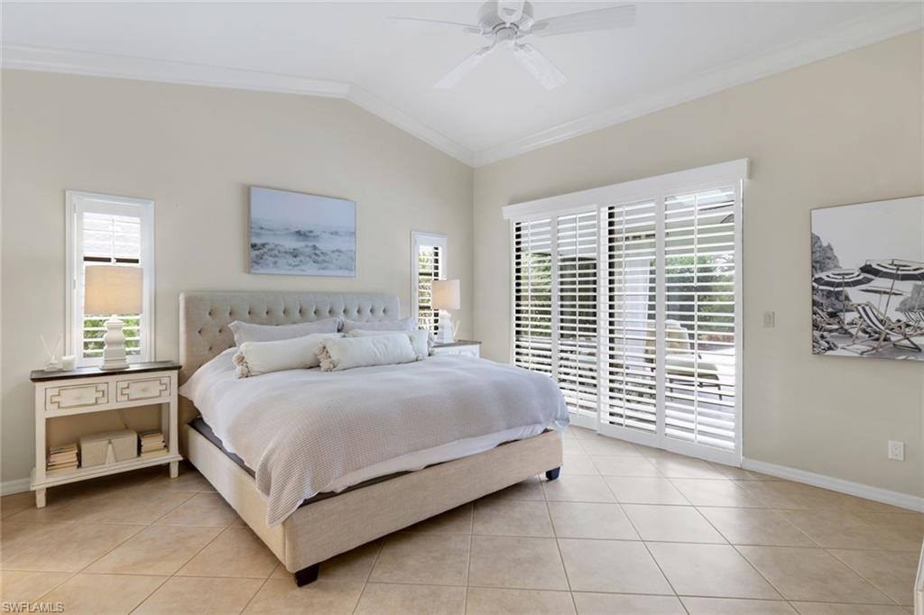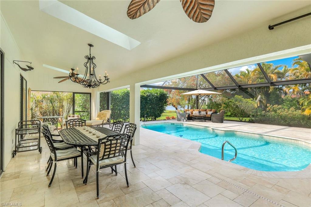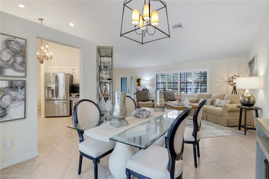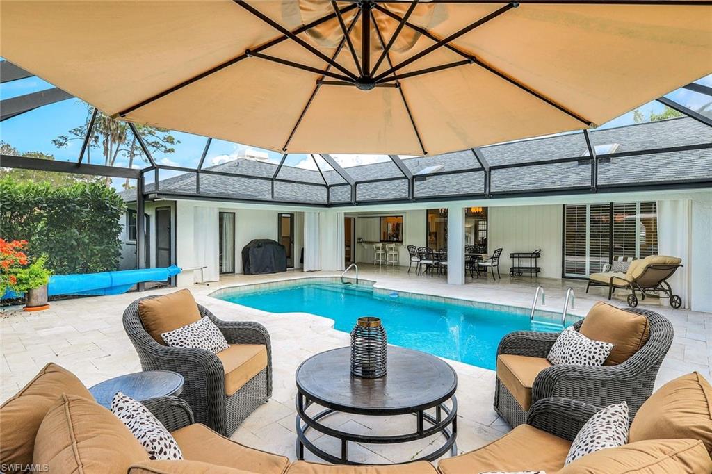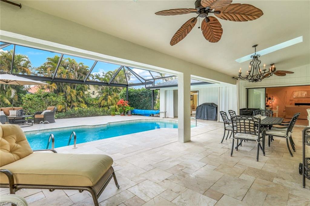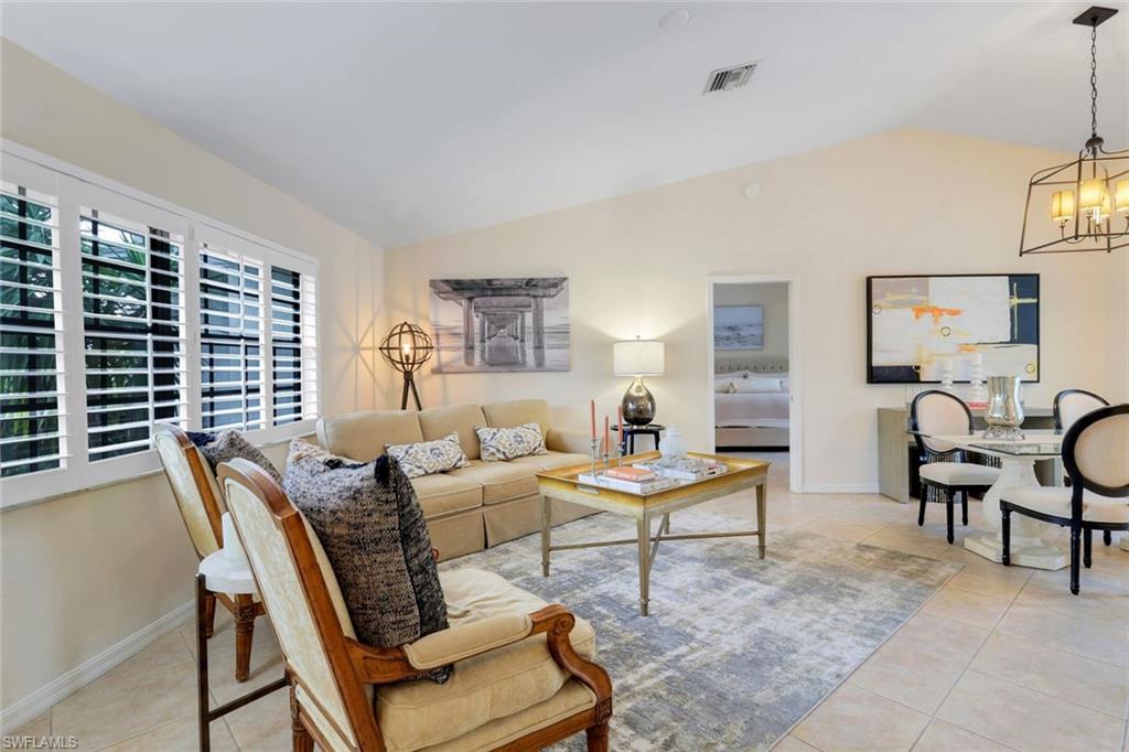This home lives large and has the perfect blend of privacy and glimpses of the lake. Neutral tile flows from room to room and makes cleaning a breeze. The kitchen has a large pass through window for outdoor entertaining. There is plenty of space under cover as well as a large area for basking in the sun on this travertine pool deck. The picture screens create a bug free outdoor experience. The open floor plan allows the family to enjoy conversation with the cook and have a fire burning in the fireplace on the chillier evenings adding ambiance. The kitchen has an upgraded double granite counter and stainless steel appliances. Off the kitchen is the oversized utility room with a butlers pantry for all the entertaining extras you might need. The owner's suite has a large walk in closet and bath with dual sinks and lots of cabinets. The split bedroom plan allows your guests complete privacy with a pocket door creating a 2 bedroom and bath suite. The guest bath doubles as the pool bath with direct access to the lanai. Each bedroom has walk-in closets. The major components have been updated: Roof 3 years, water heater 2 years & the AC 7 years. The paver drive and walkway and oversized garage top this off beautifully. Vanderbilt is a quiet neighborhood west of 41 in biking distance to the beautiful sandy beaches. Walk to Royal scoop in the evenings for ice cream. Low fees and great location make this an exceptional home to enjoy the coveted Florida lifestyle.