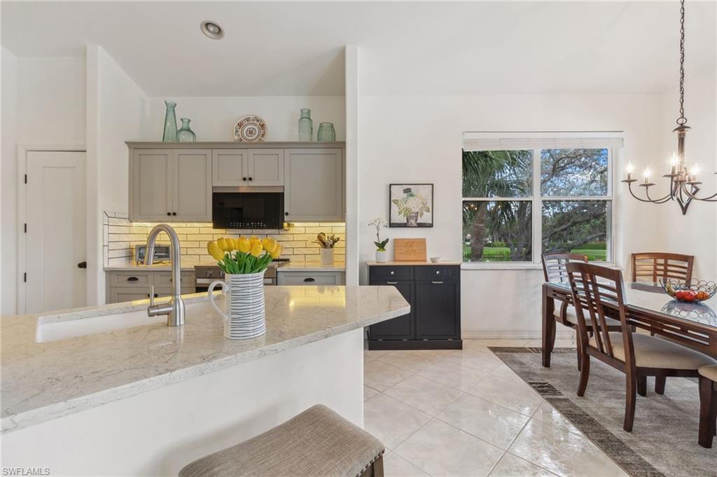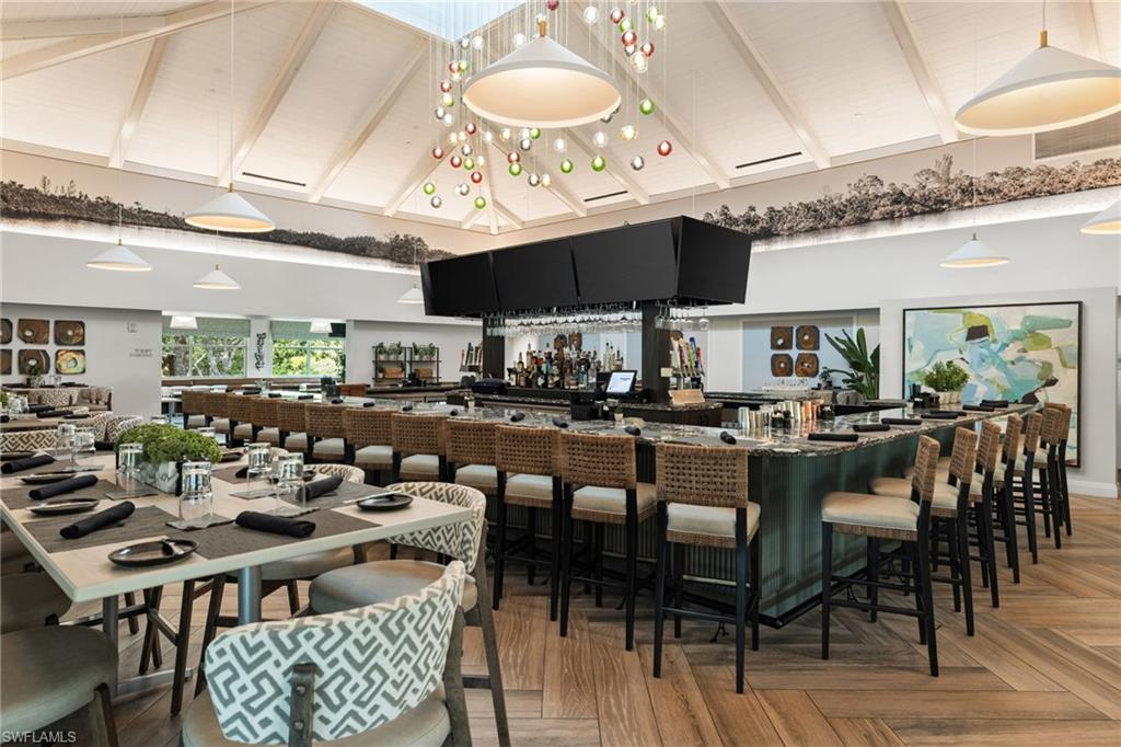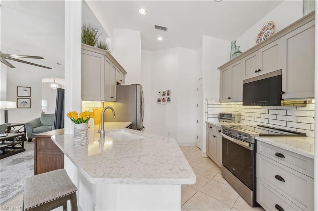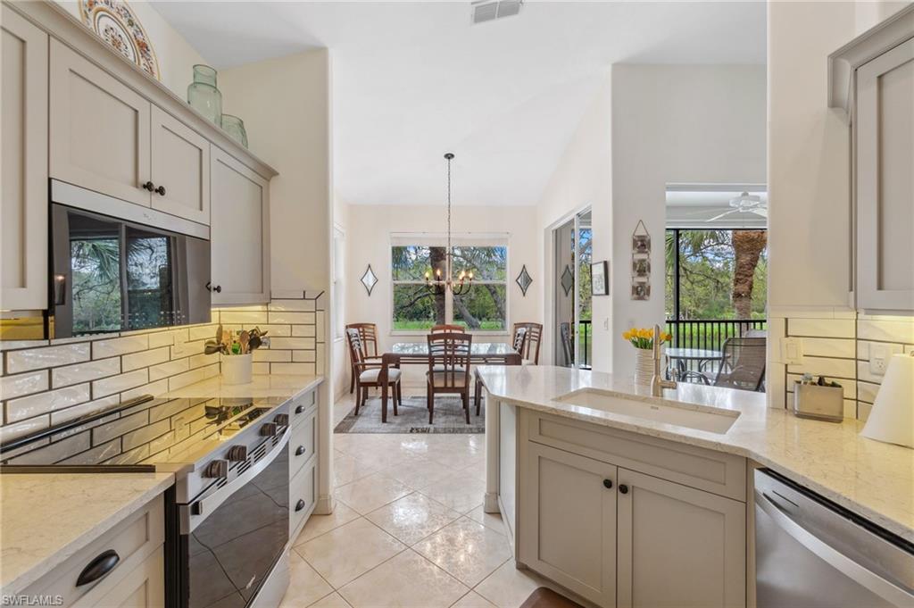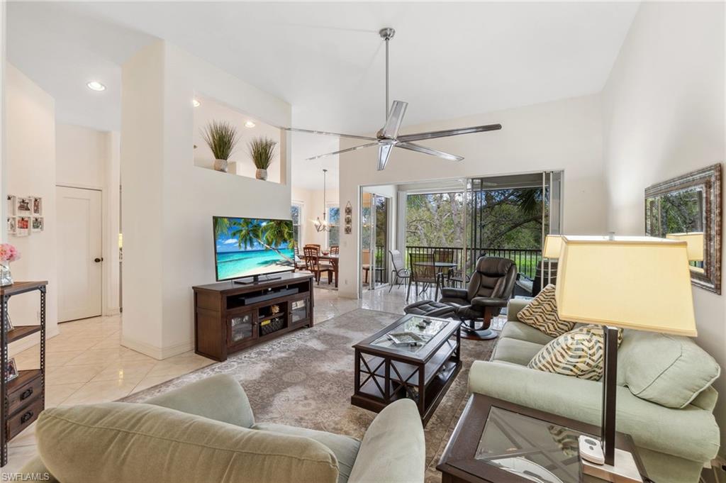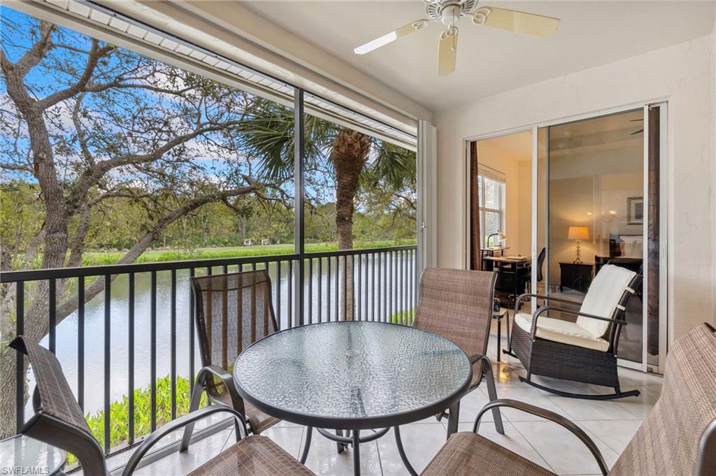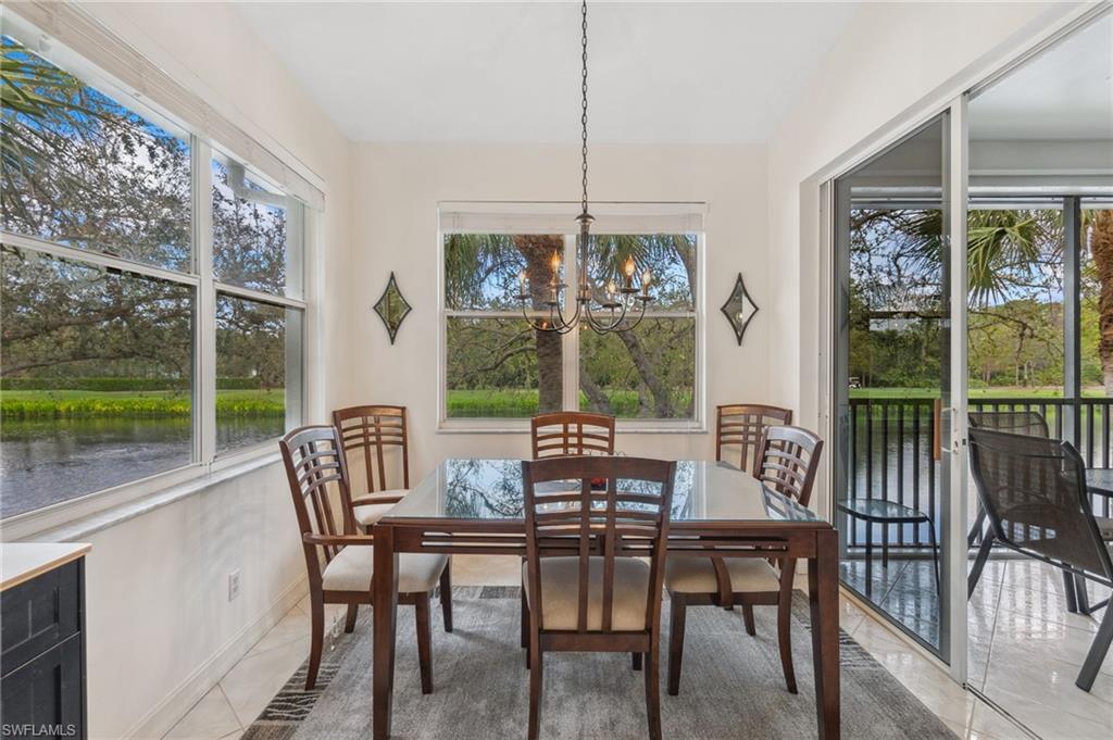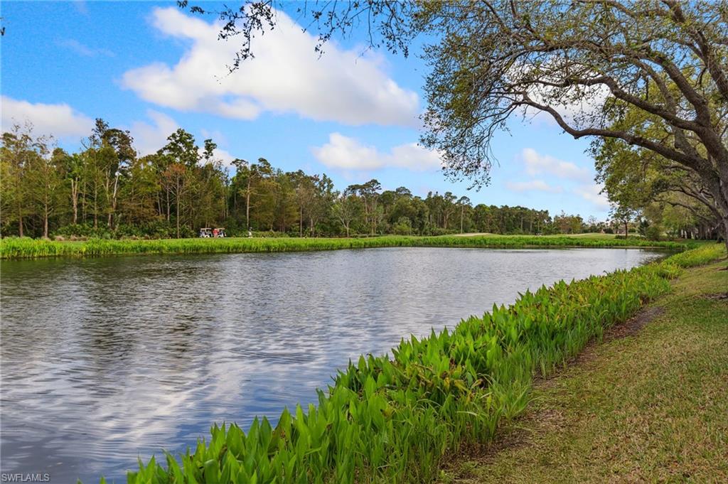 Enjoy the soothing breeze and terrific views from the lanai of this gorgeous 2nd floor end unit condo overlooking the water on hole number 1 of The Lake Course at Pelican Sound Golf and River Club. This outstanding open floor plan residence is being sold turnkey furnished, and offers 2 bedrooms plus den with closet, and 2 full baths. Luxury features include a new updated kitchen (2024) with extra cabinets and undercabinet lighting, all new stainless steel appliances, beautiful quartz countertops, subway tile backsplash & nice pantry area. The morning room off the kitchen offers plenty of space and terrific views of the lake from 3 windows. The master suite features a large walk-in closet and spacious bath with dual sinks & large walk-in shower with natural light that shines through the overhead window. The AC is new (2023), and the attached 1 car garage is perfect for storing your personal golf cart. Pelican Sound is located West US41 and nestled up to the Estero River. The community really has it all…27 holes of Championship Bundled Golf, resort style pool, Estero River access with boat launch and boat storage, a boat shuttle to a private beach, racquets center with 8 tennis courts, 14 pickleball courts, multiple restaurants and bars, state-of-the art fitness center, 5 bocce courts, and a very active social calendar.