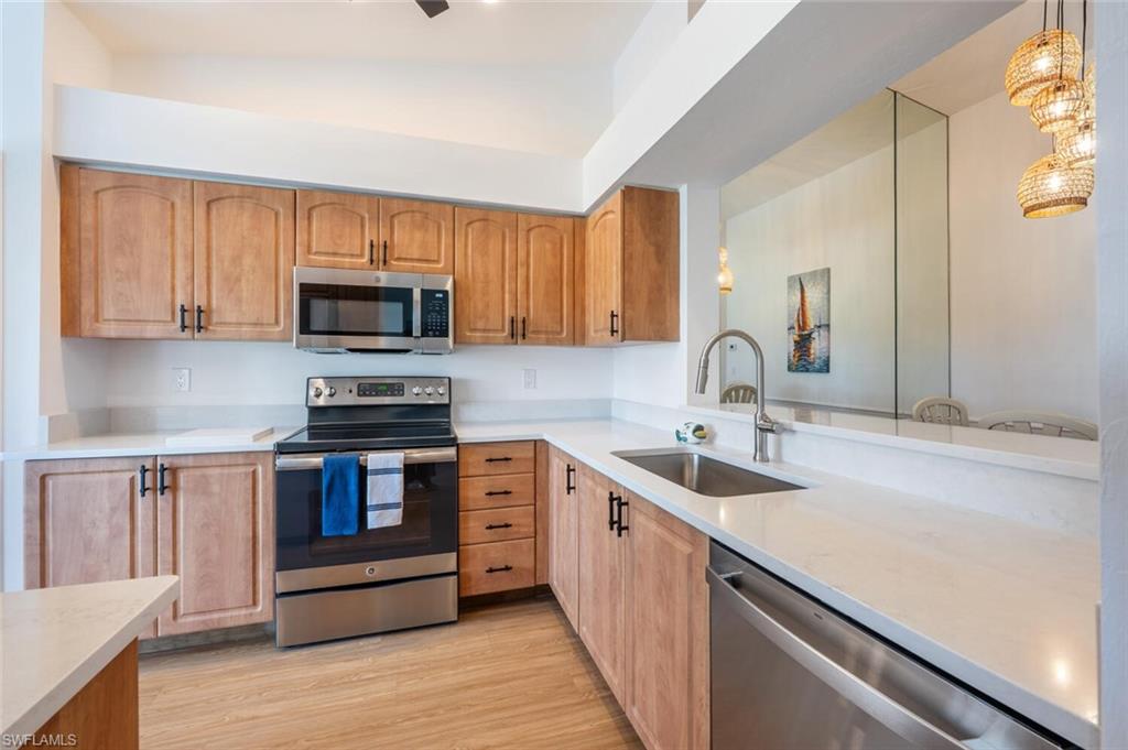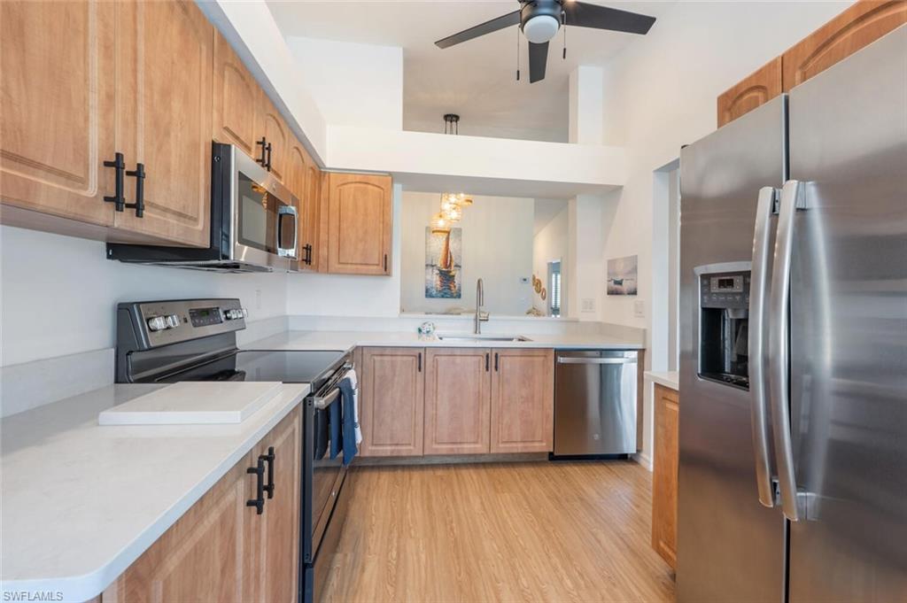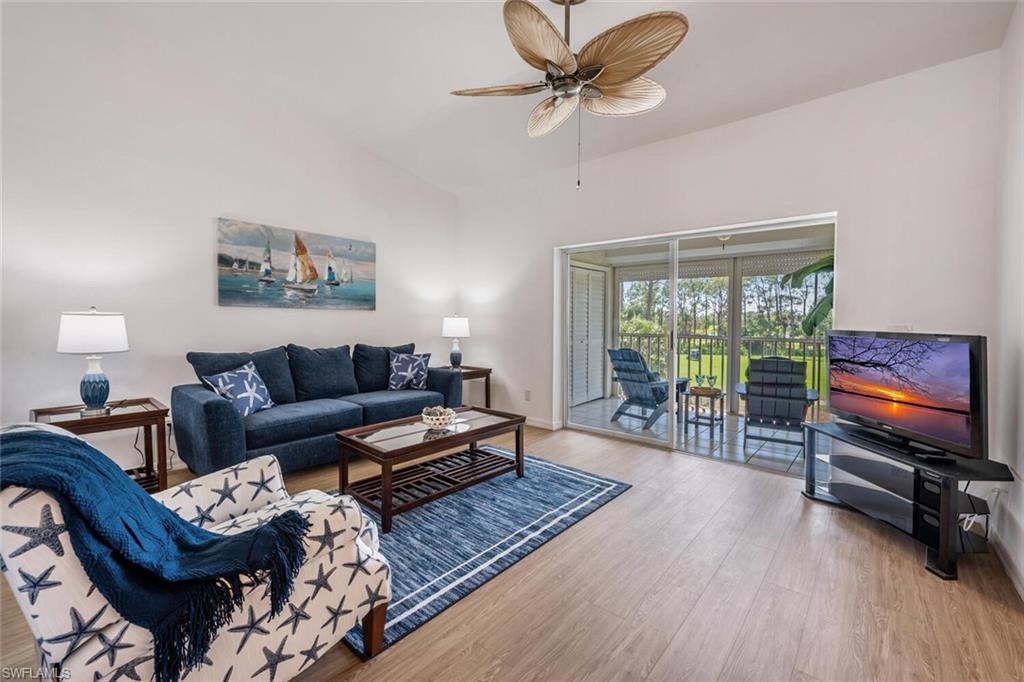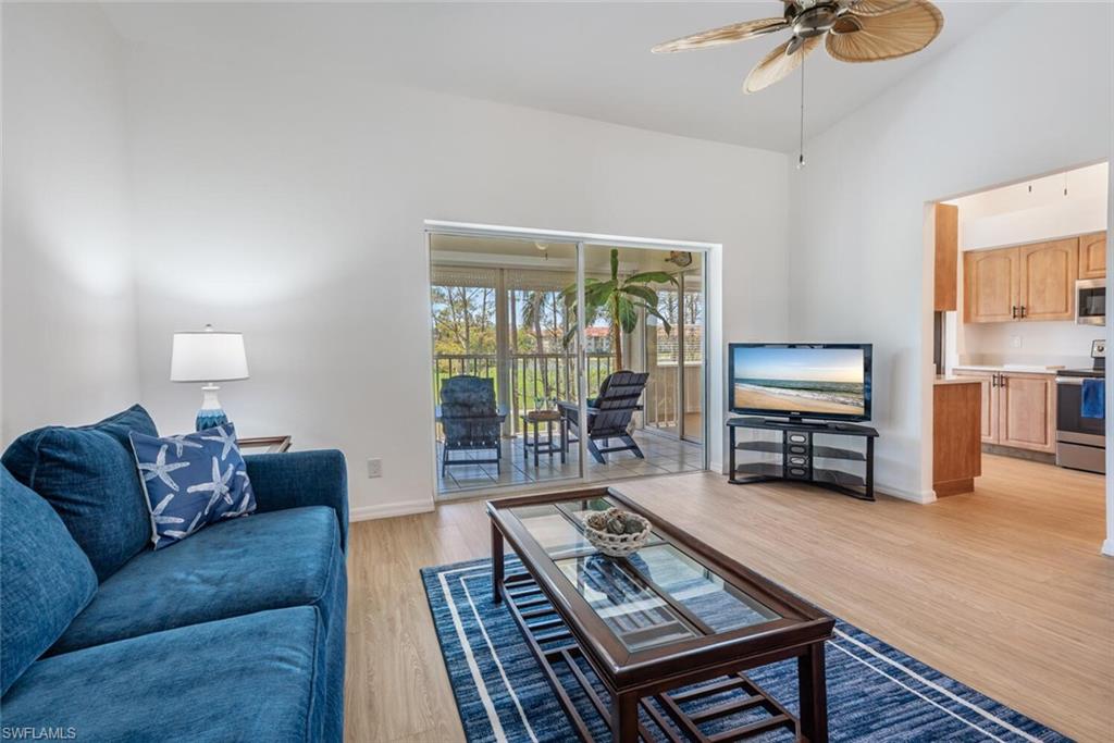 MOVE IN READY!! This beautifully furnished freshly painted SOCIAL condo in Countryside Golf and Country Club/Country Glen, has been updated with LVP flooring, new bathroom vanities, quartz counters, stainless steel range, dishwasher, microwave and refrigerator. The lanai has tile flooring making it easy to maintain and the electric hurricane shutter for storm protection. The complete condo is sparkling clean and has dishes, pots and pans, glasses, you name it, it is there. The third-floor unit has vaulted ceiling, with a beautiful view of the golf course, cart path, and back landscaped area so all you need is your toothbrush and swimsuit. Countryside is currently going through a renovation adding a lap pool, pool cafe, outdoor dining, and updated indoor lounge. Soft opening will occur this summer and a Grand Reopening Gala will be late fall so the time to purchase is now before the prices climb throughout the community. Late 2025 there will be 4 pickleball courts built by the lighted Bocce and Tennis Courts. NOTE: The buyer assumes the assessment going forward for the resort pool, outdoor dining amongst other enhancements at $293.85 per quarter until 5/1/2033.