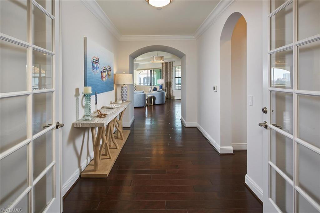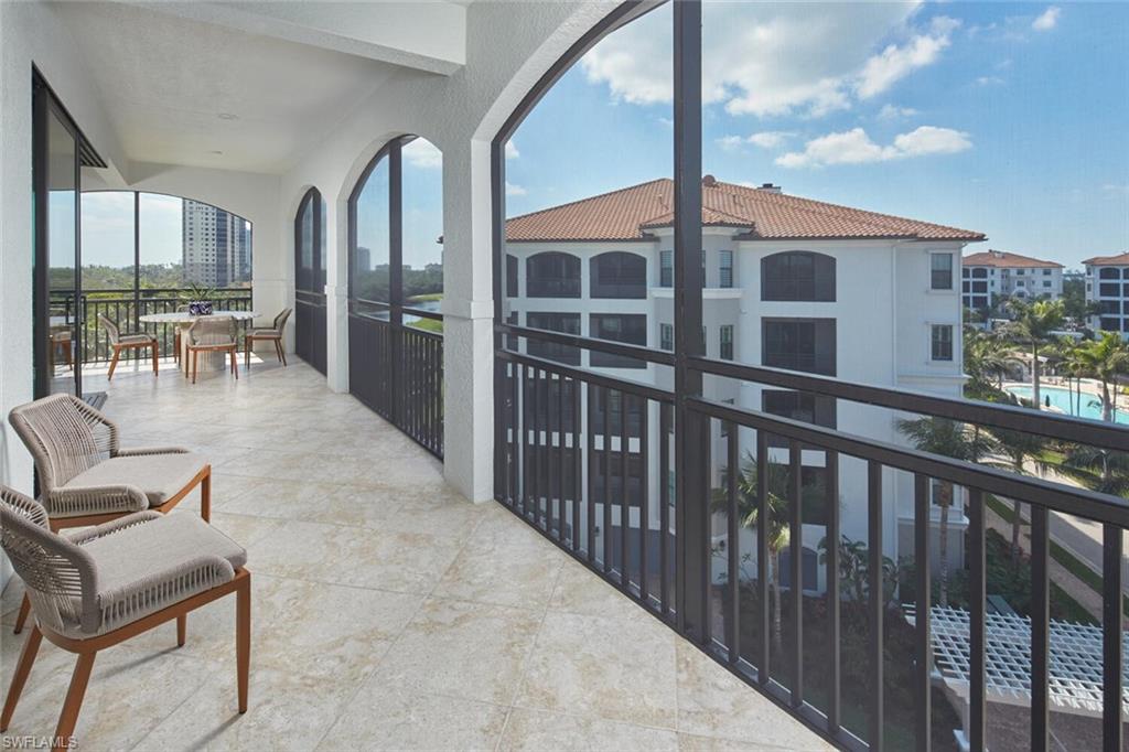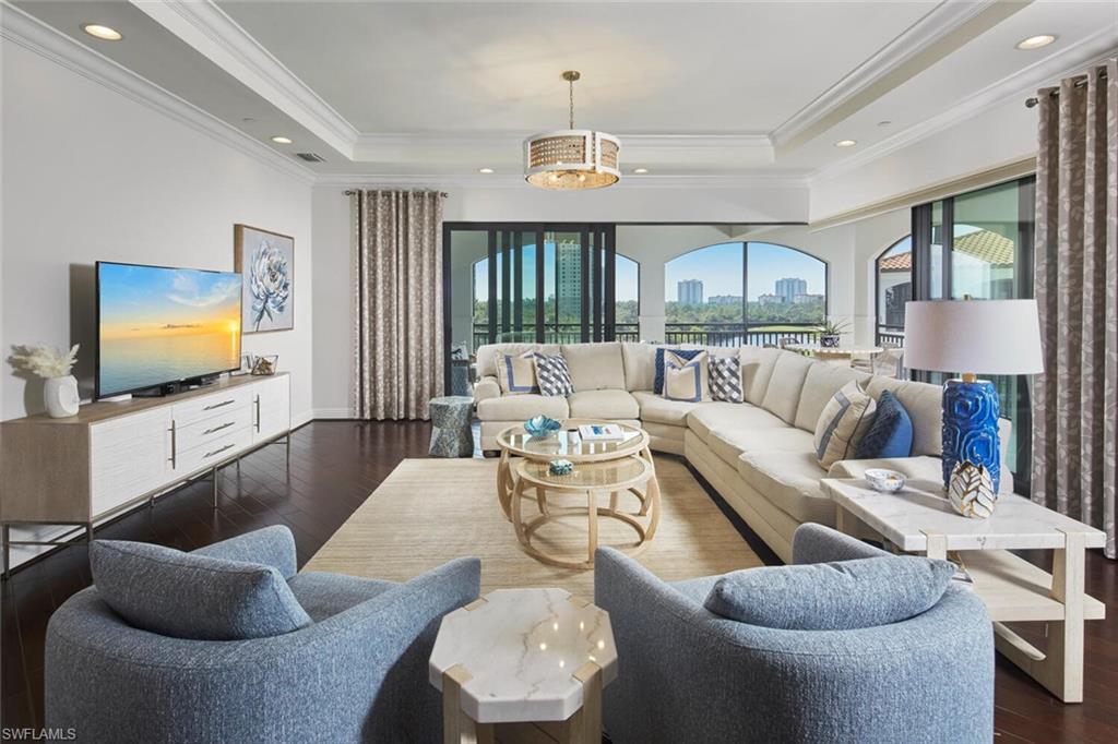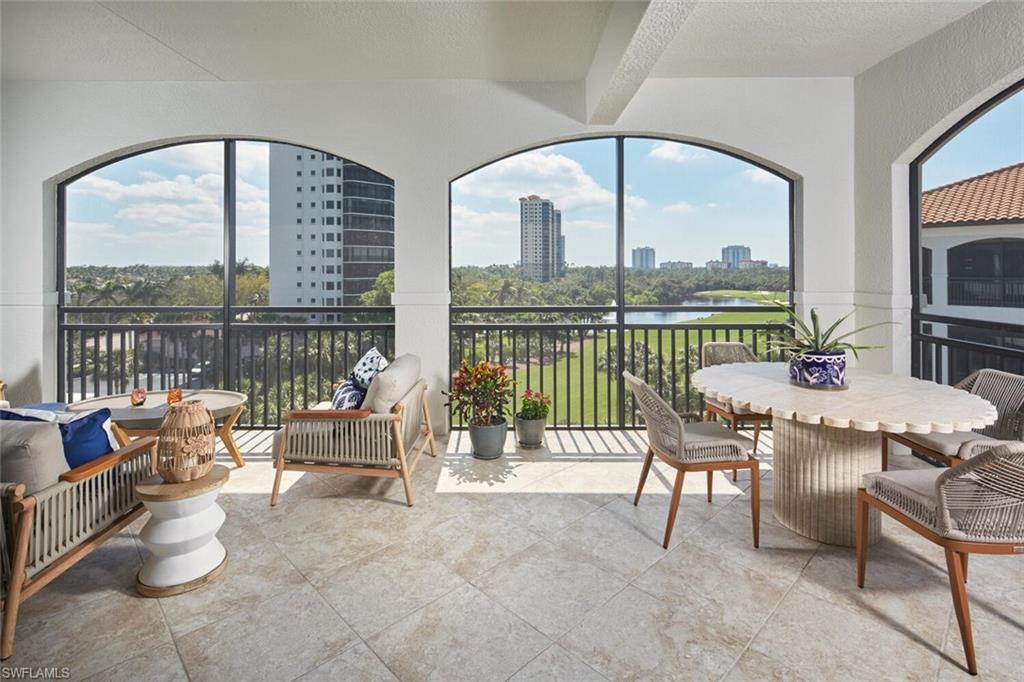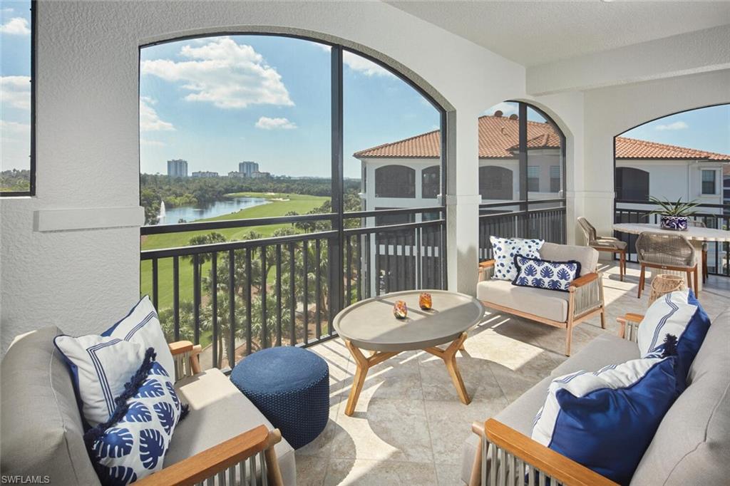 Prepare to be captivated by this exquisite penthouse residence! Private elevator entry leading to an impressive 2,961 square foot open floor plan, this coastal home features 3 bedrooms plus a den and 3.5 baths, ten foot ceilings, rich wood floors....all offered beautifully furnished for your convenience. The award-winning Cielo layout showcases expansive views from the wrap-around lanai, where you can bask in the breathtaking sights of the Colony's lush emerald-green fairway. Negative edge sliders seamlessly merge both interior and exterior lanai space for entertainment and enjoyment...it's like a single family home. The heart of the home is a magnificent kitchen, complete with a gas cooktop and adorned in a soft, neutral color palette, perfect for entertaining. Built to the highest hurricane storm code, this residence ensures peace of mind alongside comfort and style, complemented by the convenience of two dedicated parking spaces in the garage. The Colony presents the best possible lifestyle with dining membership to The Bay Club, private beach park, a huge tennis, canoeing/kayaking, sailing club, bocce, and the latest sensation...pickle ball! Located within minutes of shopping, restaurants, sports arenas, performing art centers, world-renowned beaches, and SWFL international airport.
