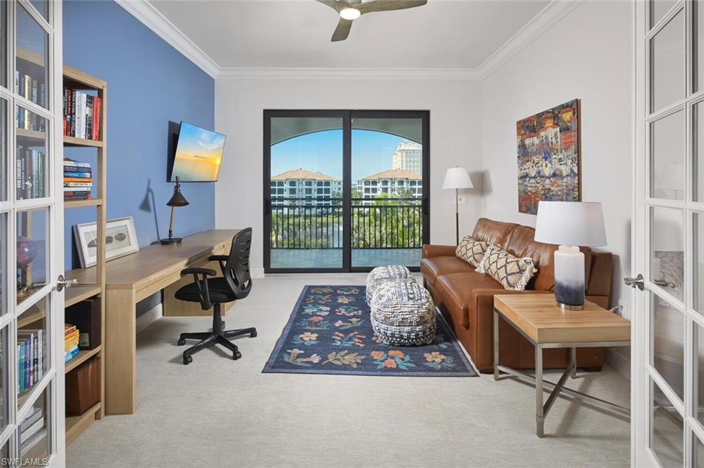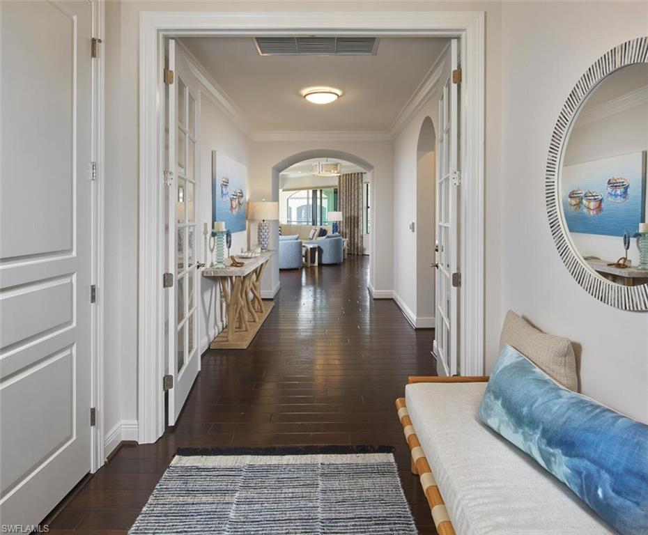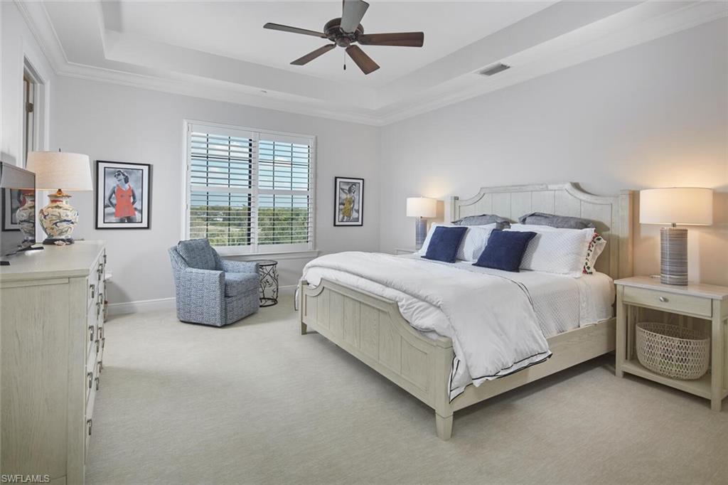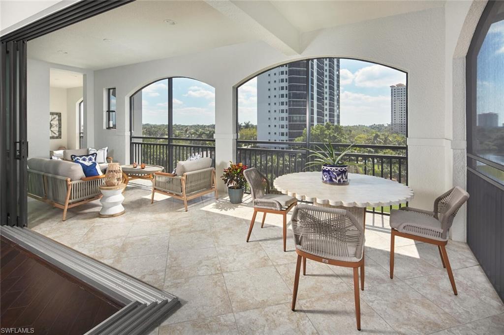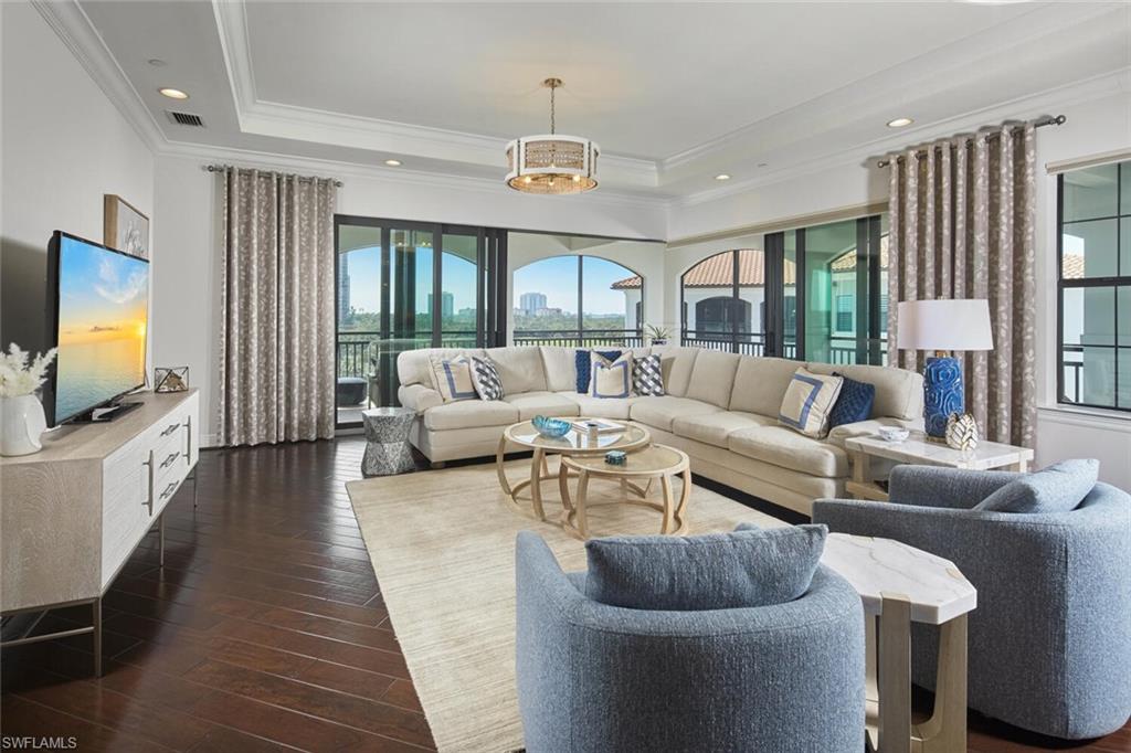 Prepare to be captivated by this exquisite penthouse residence! Private elevator entry leading to an impressive 2,961 square foot open floor plan, this coastal home features 3 bedrooms plus a den and 3.5 baths, ten foot ceilings, rich wood floors....all offered beautifully furnished for your convenience. The award-winning Cielo layout showcases expansive views from the wrap-around lanai, where you can bask in the breathtaking sights of the Colony's lush emerald-green fairway. Negative edge sliders seamlessly merge both interior and exterior lanai space for entertainment and enjoyment...it's like a single family home. The heart of the home is a magnificent kitchen, complete with a gas cooktop and adorned in a soft, neutral color palette, perfect for entertaining. Built to the highest hurricane storm code, this residence ensures peace of mind alongside comfort and style, complemented by the convenience of two dedicated parking spaces in the garage. The Colony presents the best possible lifestyle with dining membership to The Bay Club, private beach park, a huge tennis, canoeing/kayaking, sailing club, bocce, and the latest sensation...pickle ball! Located within minutes of shopping, restaurants, sports arenas, performing art centers, world-renowned beaches, and SWFL international airport.