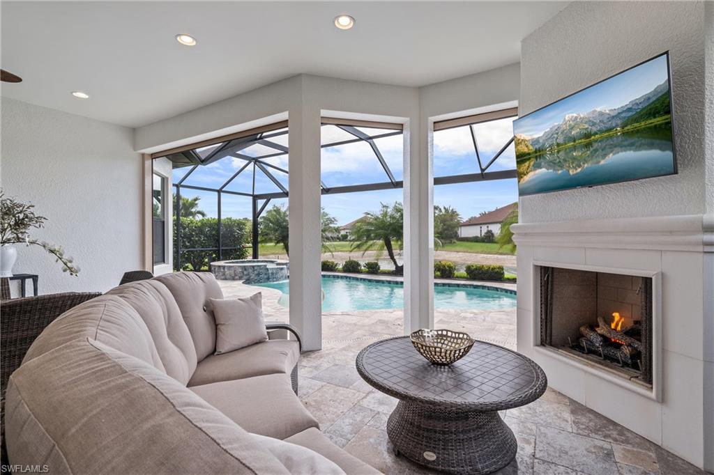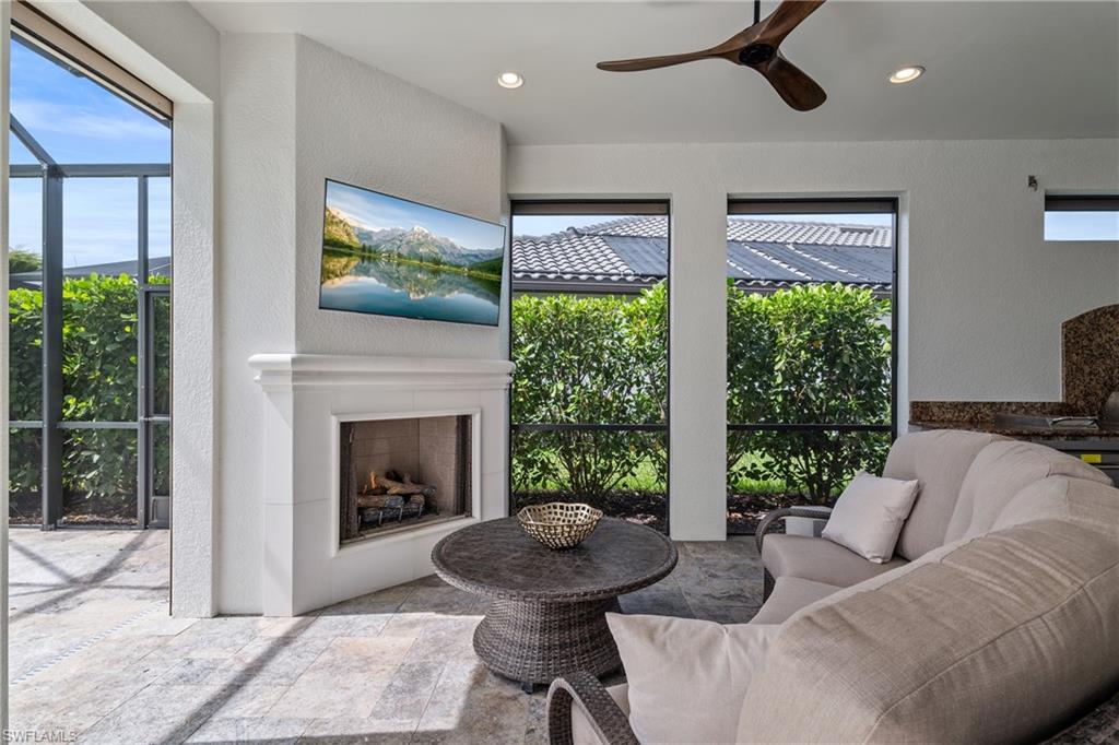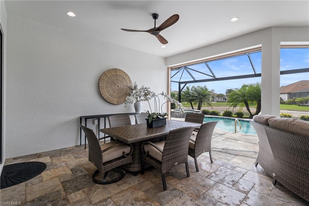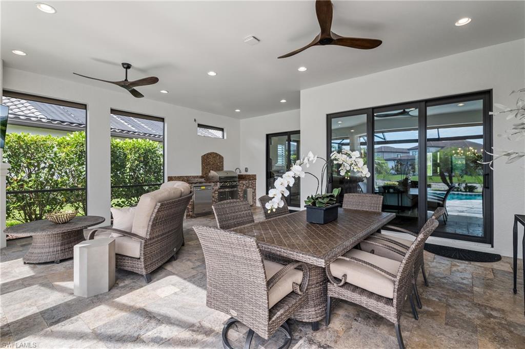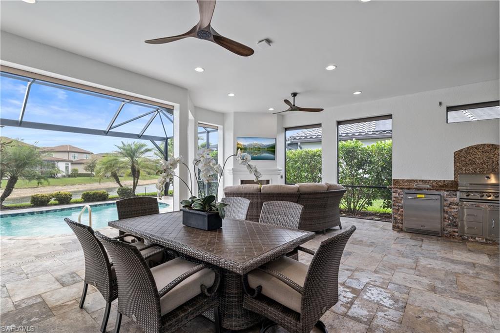 LIVE A VACATION LIFESTYLE IN ESPLANADE! FULL GOLF MEMBERSHIP INCLUDED! Built in 2019, this “Lazio” model offers a perfect mix of luxury, comfort, and relaxation with its lakefront setting and southwest rear exposure, which would provide gorgeous sunset views. The layout, with 3 bedrooms, a den, and 3 full bathrooms (all with walk in showers), has been upgraded with high-end features like the GE Café appliance package (including GAS cooktop, wall oven, built-in wall microwave, and additional beverage cooler in the island), brand new quartz countertops, brand new plantation shutters on all windows, wood flooring throughout (no carpet anywhere), recessed lights in every room, crown molding, built-in cabinetry in the master closet and pantry, upgraded toilets, and more! The spacious open great room flows out to an extended covered lanai, complete with travertine marble decking, an outdoor kitchen, and gas fireplace—ideal for entertaining. The gas-heated saltwater pool with a raised spa and picture window screen cage overlooks the serene lake, making this space both relaxing and ideal for social gatherings. There are also many added features such as HURRICANE IMPACT WINDOWS & DOORS, MOTORIZED ROLL DOWN HURRICANE SCREENS ON THE LANAI, tankless gas hot water heater, solid core doors, and three tray ceilings. The new plantation shutters, freshly painted interior, and updated fans add a contemporary feel. The extended garage with ample storage and the large laundry room with cabinetry only add to the home's convenience. The amenities at Esplanade sound amazing, with everything from the resort pool and golf course to the on-site spa, fitness center, and walking trails. At $3,412 per quarter, you get all these services, including golf membership, landscaping, and irrigation—no additional fees required.