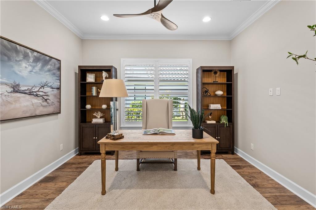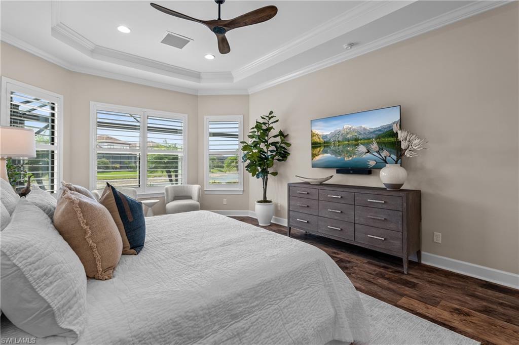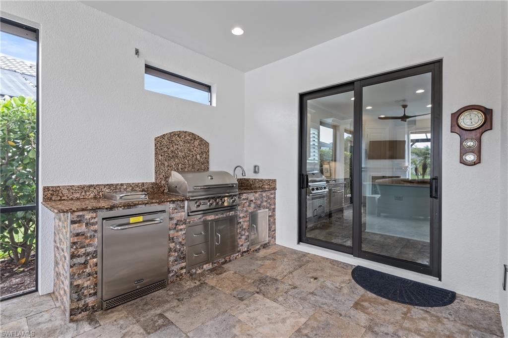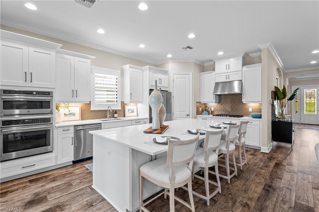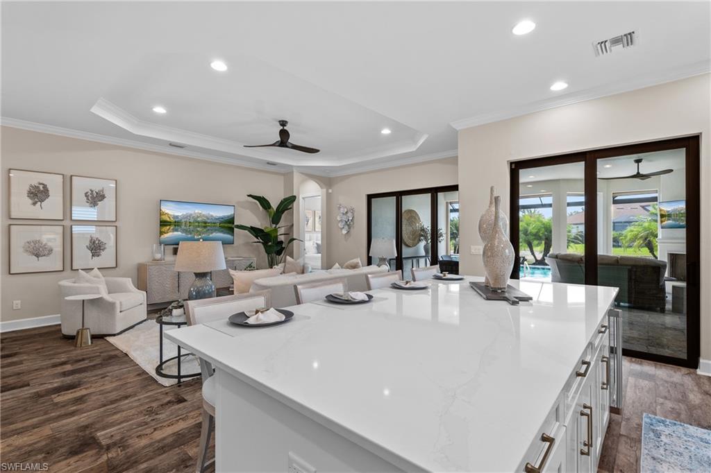 LIVE A VACATION LIFESTYLE IN ESPLANADE! FULL GOLF MEMBERSHIP INCLUDED! Built in 2019, this “Lazio” model offers a perfect mix of luxury, comfort, and relaxation with its lakefront setting and southwest rear exposure, which would provide gorgeous sunset views. The layout, with 3 bedrooms, a den, and 3 full bathrooms (all with walk in showers), has been upgraded with high-end features like the GE Café appliance package (including GAS cooktop, wall oven, built-in wall microwave, and additional beverage cooler in the island), brand new quartz countertops, brand new plantation shutters on all windows, wood flooring throughout (no carpet anywhere), recessed lights in every room, crown molding, built-in cabinetry in the master closet and pantry, upgraded toilets, and more! The spacious open great room flows out to an extended covered lanai, complete with travertine marble decking, an outdoor kitchen, and gas fireplace—ideal for entertaining. The gas-heated saltwater pool with a raised spa and picture window screen cage overlooks the serene lake, making this space both relaxing and ideal for social gatherings. There are also many added features such as HURRICANE IMPACT WINDOWS & DOORS, MOTORIZED ROLL DOWN HURRICANE SCREENS ON THE LANAI, tankless gas hot water heater, solid core doors, and three tray ceilings. The new plantation shutters, freshly painted interior, and updated fans add a contemporary feel. The extended garage with ample storage and the large laundry room with cabinetry only add to the home's convenience. The amenities at Esplanade sound amazing, with everything from the resort pool and golf course to the on-site spa, fitness center, and walking trails. At $3,412 per quarter, you get all these services, including golf membership, landscaping, and irrigation—no additional fees required.