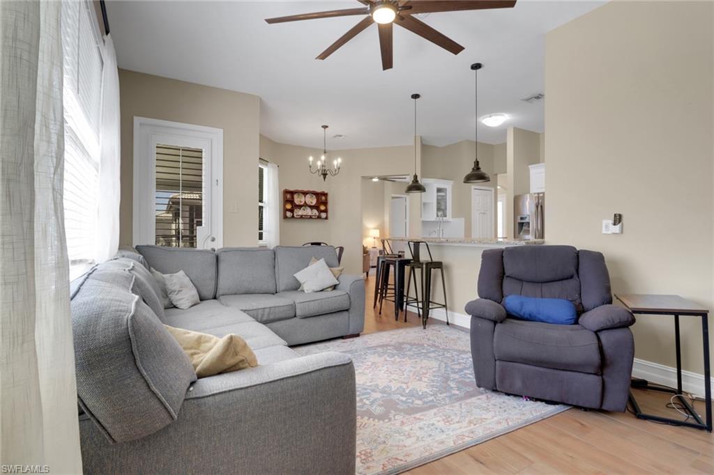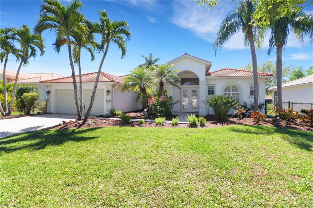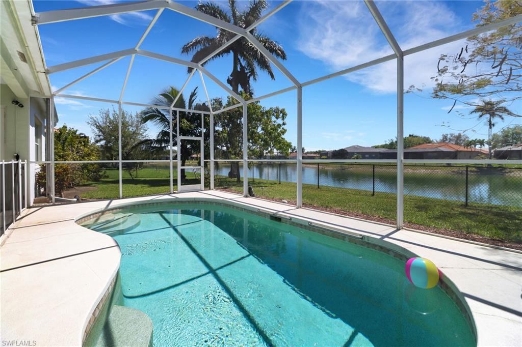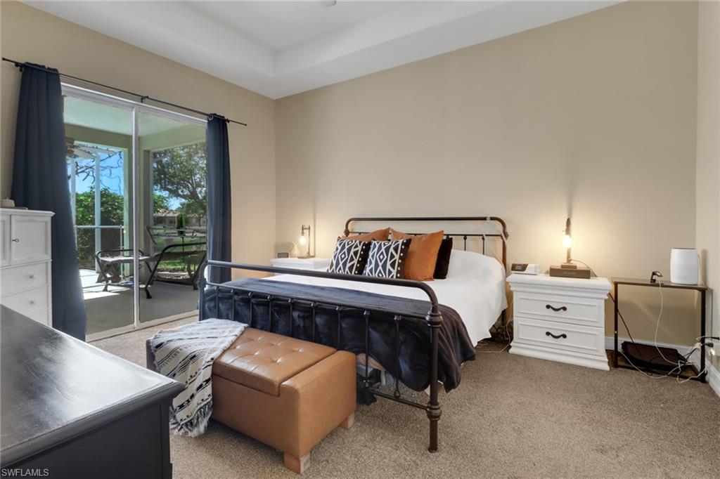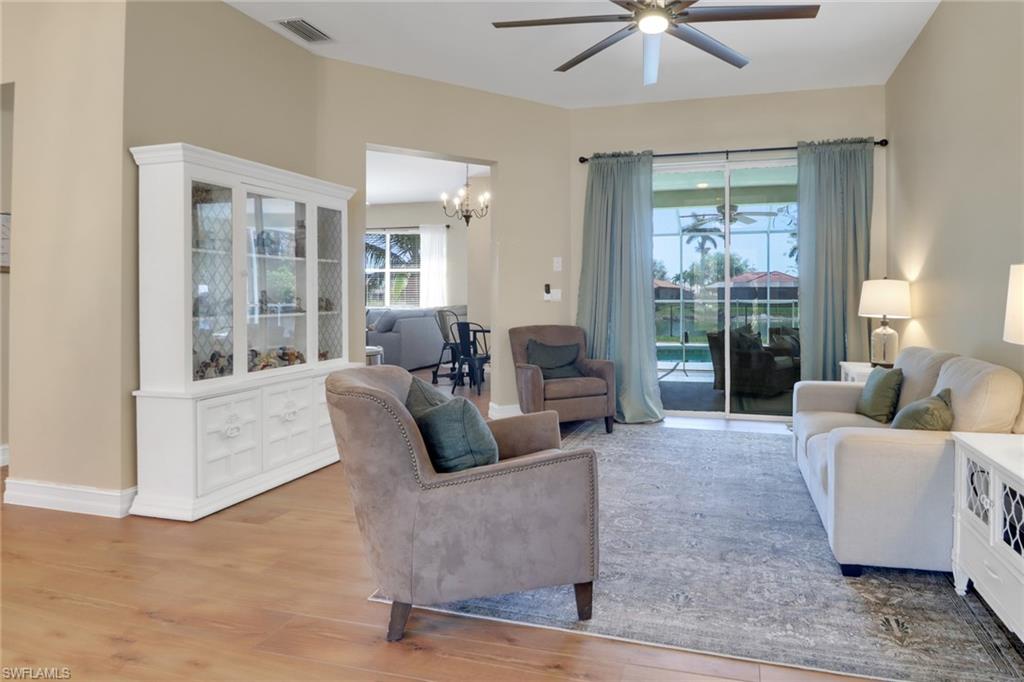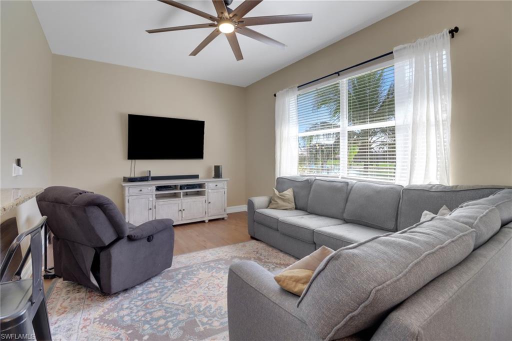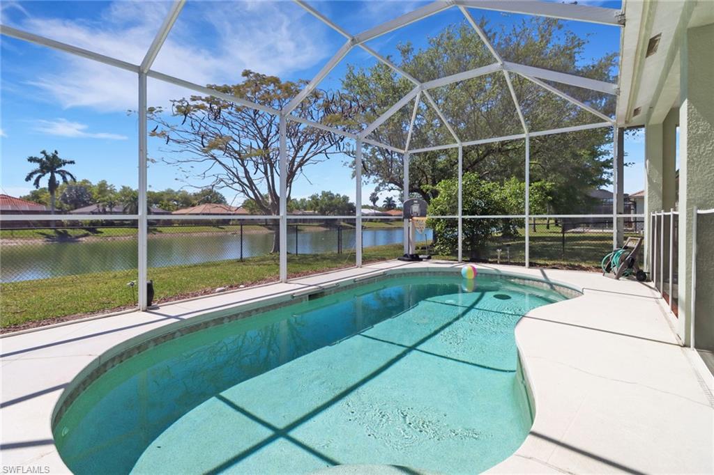 Step into this beautifully designed 3-bedroom, 2-bathroom home offering 1,870 square feet of inviting living space in sought-after Waterways at Naples. A grand French door entry welcomes you into the foyer, where a formal sitting room and formal dining area set the stage for elegant entertaining. The home boasts modern plank tile flooring throughout, with plush carpeting in the bedrooms for added comfort. The cozy living room flows seamlessly into a well-appointed kitchen featuring granite countertops, stainless steel appliances, and a breakfast bar. The spacious primary suite is a private retreat, complete with a tray ceiling, ensuite bath with dual vanities, a soaking tub, and a glass-enclosed shower. A large laundry room offers additional storage and a utility sink for convenience. Step outside to the screened lanai, where a sparkling pool overlooks stunning lake views. The Southern rear exposure provides beautiful sunshine throughout the day, while the fenced yard ensures privacy. Located in the gated Waterways at Naples, residents enjoy low HOA fees and access to exceptional amenities, including a clubhouse, pool, basketball and tennis courts, volleyball, BBQ area, park, and boat storage. With 150 acres of freshwater lakes, this community is perfect for those who love waterfront living. Don’t miss the opportunity to call this lakefront retreat home!